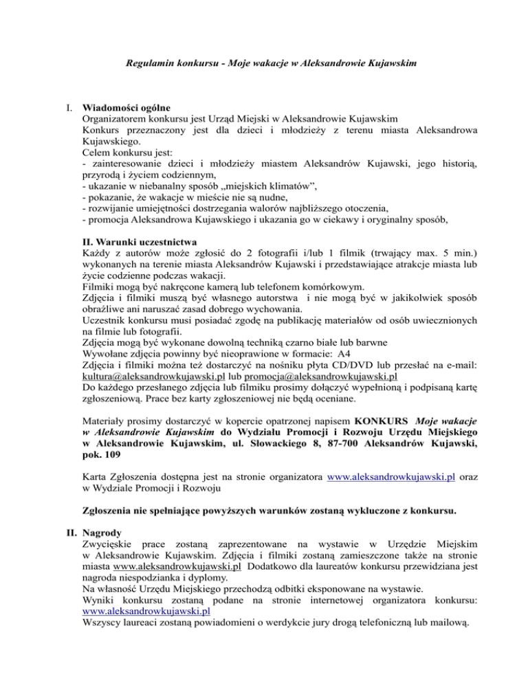 Regulamin konkursu - Moje wakacje w Aleksandrowie Kujawskim I. Wiadomości ogólne Organizatorem konkursu jest Urząd Miejski w Aleksandrowie Kujawskim Konkurs przeznaczony jest dla dzieci i młodzieży z terenu miasta Aleksandrowa Kujawskiego. Celem konkursu jest: - zainteresowanie dzieci i młodzieży miastem Aleksandrów Kujawski, jego historią, przyrodą i życiem codziennym, - ukazanie w niebanalny sposób „miejskich klimatów”, - pokazanie, że wakacje w mieście nie są nudne, - rozwijanie umiejętności dostrzegania walorów najbliższego otoczenia, - promocja Aleksandrowa Kujawskiego i ukazania go w ciekawy i oryginalny sposób, II. Warunki uczestnictwa Każdy z autorów może zgłosić do 2 fotografii i/lub 1 filmik (trwający max. 5 min.) wykonanych na terenie miasta Aleksandrów Kujawski i przedstawiające atrakcje miasta lub życie codzienne podczas wakacji. Filmiki mogą być nakręcone kamerą lub telefonem komórkowym. Zdjęcia i filmiki muszą być własnego autorstwa i nie mogą być w jakikolwiek sposób obraźliwe ani naruszać zasad dobrego wychowania. Uczestnik konkursu musi posiadać zgodę na publikację materiałów od osób uwiecznionych na filmie lub fotografii. Zdjęcia mogą być wykonane dowolną techniką czarno białe lub barwne Wywołane zdjęcia powinny być nieoprawione w formacie: A4 Zdjęcia i filmiki można też dostarczyć na nośniku płyta CD/DVD lub przesłać na e-mail: [email protected] lub [email protected] Do każdego przesłanego zdjęcia lub filmiku prosimy dołączyć wypełnioną i podpisaną kartę zgłoszeniową. Prace bez karty zgłoszeniowej nie będą oceniane. Materiały prosimy dostarczyć w kopercie opatrzonej napisem KONKURS Moje wakacje w Aleksandrowie Kujawskim do Wydziału Promocji i Rozwoju Urzędu Miejskiego w Aleksandrowie Kujawskim, ul. Słowackiego 8, 87-700 Aleksandrów Kujawski, pok. 109 Karta Zgłoszenia dostępna jest na stronie organizatora www.aleksandrowkujawski.pl oraz w Wydziale Promocji i Rozwoju Zgłoszenia nie spełniające powyższych warunków zostaną wykluczone z konkursu. II. Nagrody Zwycięskie prace zostaną zaprezentowane na wystawie w Urzędzie Miejskim w Aleksandrowie Kujawskim. Zdjęcia i filmiki zostaną zamieszczone także na stronie miasta www.aleksandrowkujawski.pl Dodatkowo dla laureatów konkursu przewidziana jest nagroda niespodzianka i dyplomy. Na własność Urzędu Miejskiego przechodzą odbitki eksponowane na wystawie. Wyniki konkursu zostaną podane na stronie internetowej organizatora konkursu: www.aleksandrowkujawski.pl Wszyscy laureaci zostaną powiadomieni o werdykcie jury drogą telefoniczną lub mailową. III. Postanowienia końcowe Nadesłanie prac oznacza akceptację warunków konkursu i regulaminu, którego ostateczna interpretacja należy do Kapituły Konkursu. Udział w konkursie jest jednoznaczny z udzieleniem prawa do nieodpłatnego wykorzystywania prac dla promocji miasta w następujących polach eksploatacji: druku w dowolnej liczbie publikacji i w dowolnym nakładzie, używania ich w Internecie oraz w innych formach utrwaleń nadających się do rozpowszechniania. Zdjęcia użyte w powyższych materiałach będą podpisane imieniem i nazwiskiem autora. Organizator zastrzega sobie prawo do przerwania lub odwołania konkursu z przyczyn od niego niezależnych. Publikując listę laureatów Organizator ma prawo do wskazywania imienia i nazwiska osób biorących udział w Konkursie. Pozostałe dane nie będą upublicznione. IV. Terminarz konkursu Konkurs trwa od 30 czerwca 2014 do 01 września 2014. Prace należy złożyć do 10 września 2014 w Wydziale Promocji i Rozwoju Urzędu Miejskiego, ul. Słowackiego 8, 87-700 Aleksandrów Kuj, w godzinach od 7.30 do 15.30