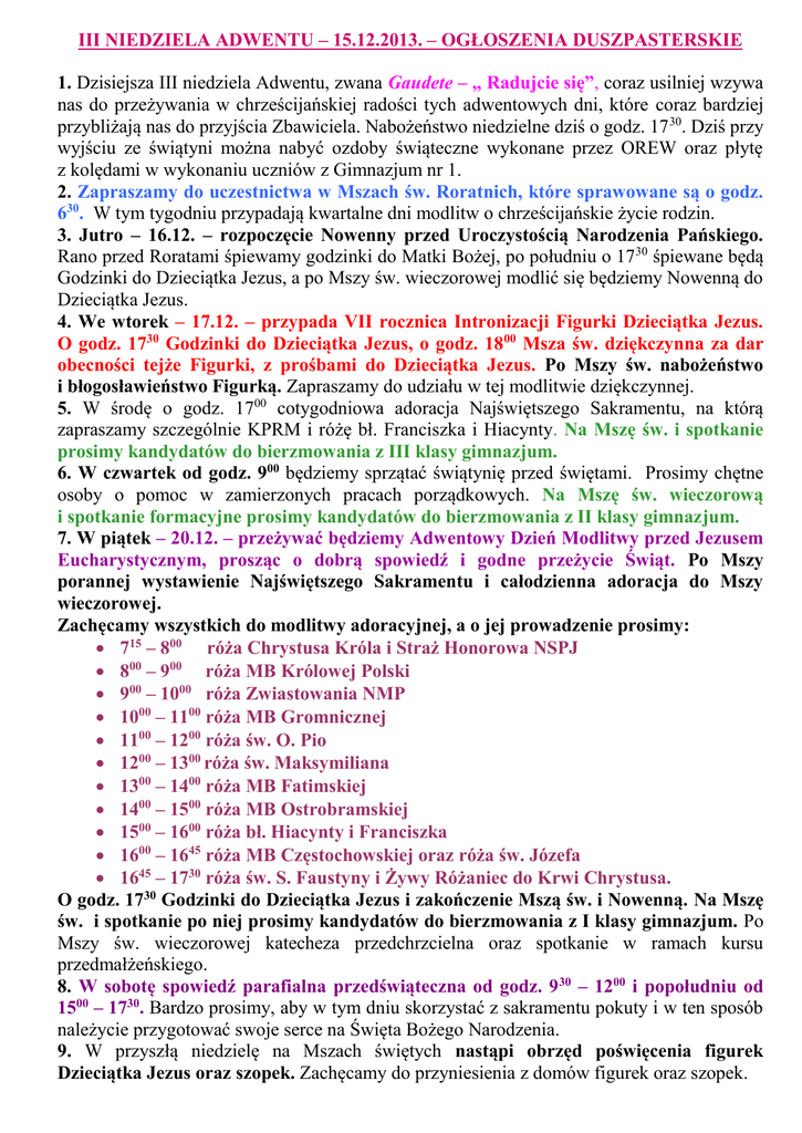 III NIEDZIELA ADWENTU – 15.12.2013. – OGŁOSZENIA