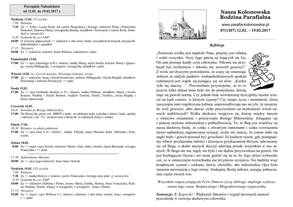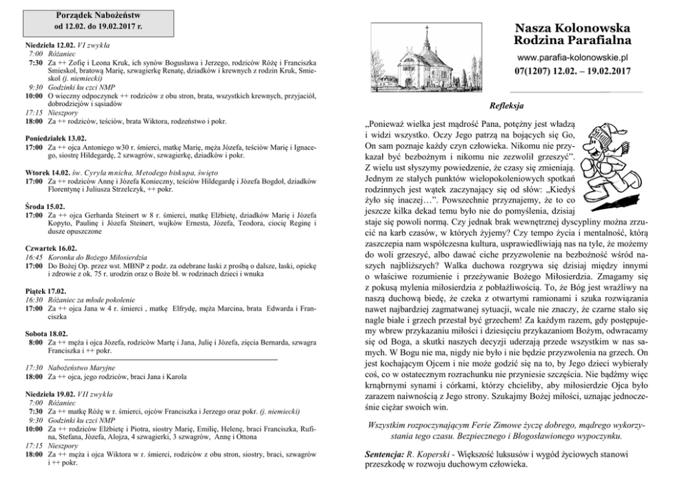 Porządek Nabożeństw od 12.02. do 19.02.2017 r. Niedziela 12.02. V I zwykła 7:00 Różaniec 7:30 Za ++ Zofię i Leona Kruk, ich synów Bogusława i Jerzego, rodziców Różę i Franciszka Smieskol, bratową Marię, szwagierkę Renatę, dziadków i krewnych z rodzin Kruk, Smieskol (j. niemiecki) 9:30 Godzinki ku czci NMP 10:00 O wieczny odpoczynek ++ rodziców z obu stron, brata, wszystkich krewnych, przyjaciół, dobrodziejów i sąsiadów 17:15 Nieszpory 18:00 Za ++ rodziców, teściów, brata Wiktora, rodzeństwo i pokr. Poniedziałek 13.02. 17:00 Za ++ ojca Antoniego w30 r. śmierci, matkę Marię, męża Józefa, teściów Marię i Ignacego, siostrę Hildegardę, 2 szwagrów, szwagierkę, dziadków i pokr. Wtorek 14.02. św. Cyryla mnicha, M etodego bisk upa, święto 17:00 Za ++ rodziców Annę i Józefa Konieczny, teściów Hildegardę i Józefa Bogdoł, dziadków Florentynę i Juliusza Strzelczyk, ++ pokr. Środa 15.02. 17:00 Za ++ ojca Gerharda Steinert w 8 r. śmierci, matkę Elżbietę, dziadków Marię i Józefa Kopyto, Paulinę i Józefa Steinert, wujków Ernesta, Józefa, Teodora, ciocię Reginę i dusze opuszczone Czwartek 16.02. 16:45 Koronka do Bożego Miłosierdzia 17:00 Do Bożej Op. przez wst. MBNP z podz. za odebrane łaski z prośbą o dalsze, łaski, opiekę i zdrowie z ok. 75 r. urodzin oraz o Boże bł. w rodzinach dzieci i wnuka Piątek 17.02. 16:30 Różaniec za młode pokolenie 17:00 Za ++ ojca Jana w 4 r. śmierci , matkę Elfrydę, męża Marcina, brata Edwarda i Franciszka Sobota 18.02. 8:00 Za ++ męża i ojca Józefa, rodziców Martę i Jana, Julię i Józefa, zięcia Bernarda, szwagra Franciszka i ++ pokr. ——–—–——–——————–—————–—–——–—————— 17:30 Nabożeństwo Maryjne 18:00 Za ++ ojca, jego rodziców, braci Jana i Karola Niedziela 19.02. V II zwyk ła 7:00 Różaniec 7:30 Za ++ matkę Różę w r. śmierci, ojców Franciszka i Jerzego oraz pokr. (j. niemiecki) 9:30 Godzinki ku czci NMP 10:00 Za ++ rodziców Elżbietę i Piotra, siostry Marię, Emilię, Helenę, braci Franciszka, Rufina, Stefana, Józefa, Alojza, 4 szwagierki, 3 szwagrów, Annę i Ottona 17:15 Nieszpory 18:00 Za ++ męża i ojca Wiktora w r. śmierci, rodziców z obu stron, siostry, braci, szwagrów i ++ pokr. Nasza Kolonowska Rodzina Parafialna www.parafia-kolonowskie.pl 07(1207) 12.02. – 19.02.2017 Refleksja „Ponieważ wielka jest mądrość Pana, potężny jest władzą i widzi wszystko. Oczy Jego patrzą na bojących się Go, On sam poznaje każdy czyn człowieka. Nikomu nie przykazał być bezbożnym i nikomu nie zezwolił grzeszyć”. Z wielu ust słyszymy powiedzenie, że czasy się zmieniają. Jednym ze stałych punktów wielopokoleniowych spotkań rodzinnych jest wątek zaczynający się od słów: „Kiedyś żyło się inaczej…”. Powszechnie przyznajemy, że to co jeszcze kilka dekad temu było nie do pomyślenia, dzisiaj staje się powoli normą. Czy jednak brak wewnętrznej dyscypliny można zrzucić na karb czasów, w których żyjemy? Czy tempo życia i mentalność, którą zaszczepia nam współczesna kultura, usprawiedliwiają nas na tyle, że możemy do woli grzeszyć, albo dawać ciche przyzwolenie na bezbożność wśród naszych najbliższych? Walka duchowa rozgrywa się dzisiaj między innymi o właściwe rozumienie i przeżywanie Bożego Miłosierdzia. Zmagamy się z pokusą mylenia miłosierdzia z pobłażliwością. To, że Bóg jest wrażliwy na naszą duchową biedę, że czeka z otwartymi ramionami i szuka rozwiązania nawet najbardziej zagmatwanej sytuacji, wcale nie znaczy, że czarne stało się nagle białe i grzech przestał być grzechem! Za każdym razem, gdy postępujemy wbrew przykazaniu miłości i dziesięciu przykazaniom Bożym, odwracamy się od Boga, a skutki naszych decyzji uderzają przede wszystkim w nas samych. W Bogu nie ma, nigdy nie było i nie będzie przyzwolenia na grzech. On jest kochającym Ojcem i nie może godzić się na to, by Jego dzieci wybierały coś, co w ostatecznym rozrachunku nie przyniesie szczęścia. Nie bądźmy więc krnąbrnymi synami i córkami, którzy chcieliby, aby miłosierdzie Ojca było zarazem naiwnością z Jego strony. Szukajmy Bożej miłości, uznając jednocześnie ciężar swoich win. Wszystkim rozpoczynającym Ferie Zimowe życzę dobrego, mądrego wykorzystania tego czasu. Bezpiecznego i Błogosławionego wypoczynku. Sentencja: R. Koperski - Większość luksusów i wygód życiowych stanowi przeszkodę w rozwoju duchowym człowieka. 07/2017 Opowiadanie Mała dziewczynka przygotowała podarunek na Boże Narodzenie. Owijała pudełko w piękny, kolorowy papier, zużywając go bardzo dużo i robiąc przesadne kokardy. Co robisz?! – skarcił ją ojciec – tak tylko zniszczysz cały swój papier. Czy wyobrażasz sobie, ile on kosztuje? Dziewczynka z załzawionymi oczami skryła się w kącie, mocno przyciskając do serca swoje pudełko. W wigilijny wieczór, stąpając lekko jak ptak, zbliżyła się do taty, który siedział za stołem i położyła przed nim pakunek w ozdobionym papierze. Tatusiu, to dla ciebie – wyszeptała. Ojciec zmiękł, bo odczuł, że był zbyt ostry. A ona po tym wszystkim przynosi mu podarunek. Rozwinął powoli tasiemkę, rozpakował kolorowy, złocisty papier i powoli otworzył pudełko. Było puste. Niespodzianka wydawała mu się niemiła, rozzłościła go ponownie. Wybuchnął: Zmarnowałaś tyle papieru i tyle tasiemek, aby zapakować puste pudełko? Duże oczy dziewczynki ponownie wypełniły się łzami. Tatusiu, przecież pudełko nie jest puste. Wypełniłam je tysiącami pocałunków. Nie jest ważny porządek w domu ani podarte papierki i pogniecione wstążki, nieudane pierogi i przypalona ryba. Ważne jest tylko „puste” pudełko. —–——–——–——–—–——–—–———–—————–— 07-08.03 Wizytacja parafialna, ks. bp. Paweł Stobrawa Program: Wto