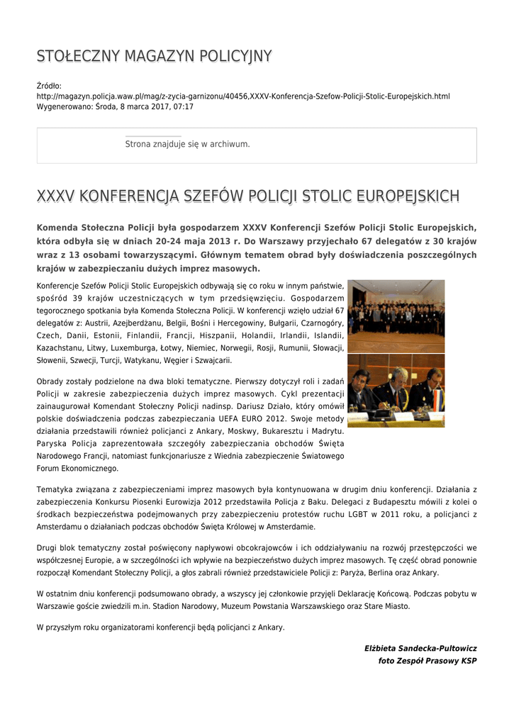 STOŁECZNY MAGAZYN POLICYJNY Źródło: http://magazyn.policja.waw.pl/mag/z-zycia-garnizonu/40456,XXXV-Konferencja-Szefow-Policji-Stolic-Europejskich.html Wygenerowano: Środa, 8 marca 2017, 07:17 Strona znajduje się w archiwum. XXXV KONFERENCJA SZEFÓW POLICJI STOLIC EUROPEJSKICH Komenda Stołeczna Policji była gospodarzem XXXV Konferencji Szefów Policji Stolic Europejskich, która odbyła się w dniach 20-24 maja 2013 r. Do Warszawy przyjechało 67 delegatów z 30 krajów wraz z 13 osobami towarzyszącymi. Głównym tematem obrad były doświadczenia poszczególnych krajów w zabezpieczaniu dużych imprez masowych. Konferencje Szefów Policji Stolic Europejskich odbywają się co roku w innym państwie, spośród 39 krajów uczestniczących w tym przedsięwzięciu. Gospodarzem tegorocznego spotkania była Komenda Stołeczna Policji. W konferencji wzięło udział 67 delegatów z: Austrii, Azejberdżanu, Belgii, Bośni i Hercegowiny, Bułgarii, Czarnogóry, Czech, Danii, Estonii, Finlandii, Francji, Hiszpanii, Holandii, Irlandii, Islandii, Kazachstanu, Litwy, Luxemburga, Łotwy, Niemiec, Norwegii, Rosji, Rumunii, Słowacji, Słowenii, Szwecji, Turcji, Watykanu, Węgier i Szwajcarii. Obrady zostały podzielone na dwa bloki tematyczne. Pierwszy dotyczył roli i zadań Policji w zakresie zabezpieczenia dużych imprez masowych. Cykl prezentacji zainaugurował Komendant Stołeczny Policji nadinsp. Dariusz Działo, który omówił polskie doświadczenia podczas zabezpieczania UEFA EURO 2012. Swoje metody działania przedstawili również policjanci z Ankary, Moskwy, Bukaresztu i Madrytu. Paryska Policja zaprezentowała szczegóły zabezpieczania obchodów Święta Narodowego Francji, natomiast funkcjonariusze z Wiednia zabezpieczenie Światowego Forum Ekonomicznego. Tematyka związana z zabezpieczeniami imprez masowych była kontynuowana w drugim dniu konferencji. Działania z zabezpieczenia Konkursu Piosenki Eurowizja 2012 przedstawiła Policja z Baku. Delegaci z Budapesztu mówili z kolei o środkach bezpieczeństwa podejmowanych przy zabezpieczeniu protestów ruchu LGBT w 2011 roku, a policjanci z Amsterdamu o działaniach podczas obchodów Święta Królowej w Amsterdamie. Drugi blok tematyczny został poświęcony napływowi obcokrajowców i ich oddziaływaniu na rozwój przestępczości we współczesnej Europie, a w szczególności ich wpływie na bezpieczeństwo dużych imprez masowych. Tę część obrad ponownie rozpoczął Komendant Stołeczny Policji, a głos zabrali również przedstawiciele Policji z: Paryża, Berlina oraz Ankary. W ostatnim dniu konferencji podsumowano obrady, a wszyscy jej członkowie przyjęli Deklarację Końcową. Podczas pobytu w Warszawie goście zwiedzili m.in. Stadion Narodowy, Muzeum Powstania Warszawskiego oraz Stare Miasto. W przyszłym roku organizatorami konferencji będą policjanci z Ankary. Elżbieta Sandecka-Pultowicz foto Zespół Prasowy KSP ZAŁĄCZNIKI DO STRONY Stołeczny Magazyn Policyjny - nr 06/2013 3.19 MB Ocena: 0/5 (0) Tweetnij