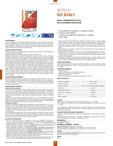 KOB/34/2012 MITECH KO BIAŁY BIAŁY UNIWERSALNY KLEJ DO SYSTEMÓW DOCIEPLEŃ do przyklejania styropianu i zatapiania siatki zawiera mikrowłókna wysoka przyczepność do styropianu i podłoża kolor biały ZASTOSOWANIE •Jeżeli na styropianie przymocowanym do podłoża nie zostanie wykonana w ciągu 2 tygodni warstwa zbrojona, to należy ocenić jakość zewnętrznej warstwy styropianu. Płyty o pożółkłej i pylącej powierzchni trzeba przed nakładaniem zaprawy klejowej, ponownie przeszlifować. •Nowo wykonane warstwy zaprawy klejowej należy chronić przed opadami atmosferycznymi i działaniem temperatury poniżej +50C i powyżej +250C do czasu związania minimum 24 godziny. •Niska temperatura, podwyższona wilgotność oraz brak odpowiedniej cyrkulacji powietrza wydłużają czas wysychania kleju. •Należy pamiętać o właściwym wykonaniu i wykończeniu dylatacji występujących w podłożu. •Po zakończeniu prac narzędzia i ręce należy umyć bieżącą wodą pamiętając, że po wyschnięciu kleju czyszczenie jest utrudnione. Powierzchnię świeżo zabrudzonych elementów należy przetrzeć wilgotną szmatką •Uniwersalny klej MITECH KO BIAŁY jest elementem systemu dociepleń MITECH. Pewna i gwarantowana skuteczność tego materiału ma miejsce wówczas, gdy jest on stosowany razem z pozostałymi elementami systemu, zgodnie z technologią wykonania. Służy do wykonywania na styropianie warstwy zbrojonej siatką z włókna szklanego oraz przyklejania płyt styropianowych do typowych podłoży mineralnych. Stosowany jest przy dociepleniu ścian zewnętrznych budynków w technologii bezspoinowego systemu ociepleń MITECH. Jest również używany do wyrównywania (nierówności do 5 mm) i wygładzania podłoży mineralnych przed nakładaniem farb i tynków cienkowarstwowych. PRZYGOTOWANIE PODŁOŻA Podłoże pod wykonanie warstwy zbrojącej powinno być wykonane zgodnie z technologią bezspoinowego ocieplania ścian MITECH. Powierzchnia styropianu powinna być przeszlifowana, odpylona, sucha. Podłoże przed klejeniem płyt styropianowych powinno być nośne, równe, suche, oczyszczone z powłok antyadhezyjnych tj. brud, kurz, pył, tłuste zabrudzenia i bitumy oraz wolne od agresji biologicznej i chemicznej. Warstwy podłoża o słabej przyczepności np. słabe tynki, odspojone powłoki malarskie, niezwiązane cząstki muru, należy usunąć a następnie zagruntować preparatem głęboko penetrującym MITECH MG. Nierówności i ubytki podłoża rzędu 5 – 15 mm, należy wyrównać zaprawą wyrównawczą MITECH ZW. Przed przystąpieniem do przyklejania płyt styropianowych na słabych podłożach, należy wykonać próbę przyczepności. Próba ta polega na przyklejeniu w różnych miejscach elewacji kilku próbek styropianu o wymiarach 10 x 10 i ręcznego ich odrywania po minimum 3 dniach schnięcia. Nośność podłoża jest wystarczająca wtedy, gdy rozerwanie następuje w warstwie styropianu. W przypadku oderwania całej próbki z klejem i warstwą podłoża, konieczne jest oczyszczenie elewacji ze słabo związanej warstwy. Następnie podłoże należy zagruntować preparatem głęboko penetrującym MITECH MG i po jego wyschnięciu wykonać kolejną próbę przyczepności. Jeżeli i ta próba da wynik negatywny, należy uwzględnić dodatkowe mocowanie mechaniczne lub odpowiednie przygotowanie podłoża. ŚRODKI OSTROŻNOŚCI Zaprawa klejowa w połączeniu z wodą posiada odczyn alkaliczny, należy chronić oczy i skórę. W przypadku bezpośredniego kontaktu z oczami należy płukać je obficie wodą i skontaktować się z lekarzem. NIEZBĘDNE NARZĘDZIA –– wiadro budowlane –– wiertarka wolnoobrotowa z mieszadłem koszykowym –– szpachla oraz kielnia ze stali nierdzewnej –– paca ze stali nierdzewnej –– tarka do styropianu lub paca z gruboziarnistym papierem ściernym PRZYGOTOWANIE PRODUKTU DANE TECHNICZNE. Zawartość opakowania wsypać do pojemnika z odmierzoną wodą w ilości 6,25 – 6,5 l i dokładnie wymieszać wiertarką wolnoobrotową z mieszadłem koszykowym, aż do uzyskania jednorodnej konsystencji. Po upływie 5 -10 minut i ponownym wymieszaniu zaprawa jest gotowa do użycia. W zależności od temperatury i wilgotności powietrza gotowa zaprawa jest przydatna do zużycia około 2 godziny. temperatura stosowania +50C do +250C temperatura podłoża +50C do +250C ZASTOSOWANIE PRODUKTU proporcje mieszania 6,25 – 6,5 l wody na 25 kg zaprawy klejowej Wykonanie warstwy zbrojonej. Na powierzchnię odpylonych po szlifowaniu płyt styropianowych, należy wykonać (nie wcześniej niż po 48 h od ich przyklejenia) warstwę zbrojoną siatką z włókna szklanego. Przygotowaną zaprawę klejową nanieść na płyty styropianowe ciągłą warstwą o grubości ok. 3-4 mm pasami pionowymi lub poziomymi na szerokość siatki zbrojącej. Po nałożeniu zaprawy natychmiast wtopić w nią siatkę szklaną tak, aby została ona równomiernie napięta i całkowicie zatopiona w zaprawie. Sąsiednie pasy siatki układać na zakładkę nie mniejszą niż 10 cm. W przypadku nie uzyskania gładkiej powierzchni na wyschniętą warstwę zbrojoną przyklejonej siatki nanieść drugą cienką warstwę zaprawy klejącej o grubości ok. 1 mm, celem całkowitego wyrównania i wygładzenia jej powierzchni. Grubość warstwy zbrojonej powinna wynosić od 3 do 5 mm. Przyklejanie styropianu Gotową zaprawę klejową nakładać na płyty styropianowe plackami o średnicy ok. 10 – 12 cm w ilości 8 – 10 szt. oraz wzdłuż obwodu cienką warstwą o szerokości ok. 4 cm. Prawidłowo nałożona zaprawa klejowa powinna pokrywać min. 40% powierzchni płyty. Zaprawa nie powinna wypływać na powierzchnię płyt, aby nie spowodować powstania szczelin miedzy płytami. Po nałożeniu zaprawy płytę bezzwłocznie przyłożyć do ściany w przewidzianym dla niej miejscu i docisnąć pacą. Styropian przyklejać z zachowaniem mijankowego układu płyt. Po wstępnym zwi
