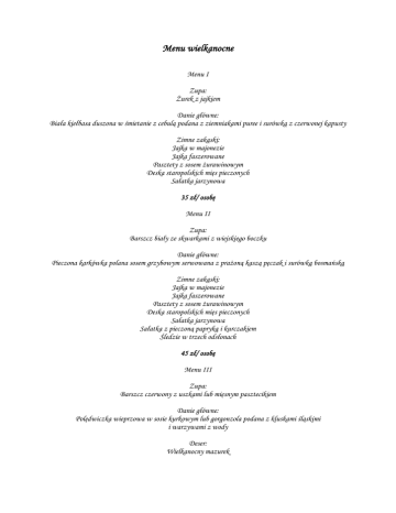 Menu wielkanocne Menu I Zupa: Żurek z jajkiem Danie główne: Biała kiełbasa duszona w śmietanie z cebulą podana z ziemniakami puree i surówką z czerwonej kapusty Zimne zakąski: Jajka w majonezie Jajka faszerowane Pasztety z sosem żurawinowym Deska staropolskich mięs pieczonych Sałatka jarzynowa 35 zł/ osobę Menu II Zupa: Barszcz biały ze skwarkami z wiejskiego boczku Danie główne: Pieczona karkówka polana sosem grzybowym serwowana z prażoną kaszą pęczak i surówką bosmańską Zimne zakąski: Jajka w majonezie Jajka faszerowane Pasztety z sosem żurawinowym Deska staropolskich mięs pieczonych Sałatka jarzynowa Sałatka z pieczoną papryką i kurczakiem Śledzie w trzech odsłonach 45 zł/ osobę Menu III Zupa: Barszcz czerwony z uszkami lub mięsnym pasztecikiem Danie główne: Polędwiczka wieprzowa w sosie kurkowym lub gorgonzola podana z kluskami śląskimi i warzywami z wody Deser: Wielkanocny mazurek Zimne zakąski: Jajka w majonezie Jajka faszerowane Pasztety z sosem żurawinowym Deska staropolskich mięs pieczonych Sałatka jarzynowa Sałatka z pieczoną papryką i kurczakiem Śledzie w trzech odsłonach 55 zł/ osobę Ewentualnie można wybrać indywidualnie: Żurek 250 ml- 6 zł Barszcz biały 250 ml- 6 zł Barszczyk z uszkami lub mięsnym pasztecikiem- 7 zł Śledź w trzech odsłonach 250 gr- 9 zł Sałatka jarzynowa 200 gr- 5 zł Półmisek mięs pieczonych 200 gr- 13 zł Jajka w majonezie 6 szt- 8 zł Jajka faszerowane pieczarkami 6 szt- 8 zł Dorsz w galarecie z warzywami 1 szt- 8 zł Sałatka z grilowaną papryką i kurczakiem 250 gr- 8 zł Karkówka pieczona w sosie chrzanowym 200 gr- 10 zł Połówka pieczonej kaczki z sosem żurawinowym- 24 zł Polędwiczka w sosie kurkowym 200 gr- 16 zł