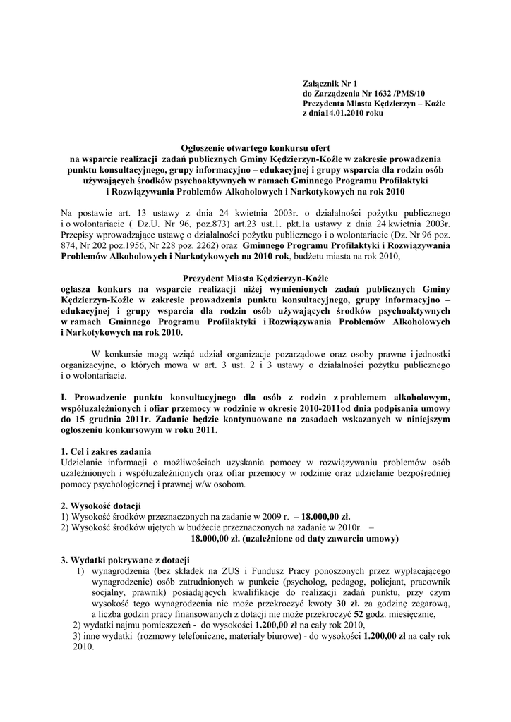 Załącznik Nr 1 do Zarządzenia Nr 1632 /PMS/10 Prezydenta Miasta Kędzierzyn – Koźle z dnia14.01.2010 roku Ogłoszenie otwartego konkursu ofert na wsparcie realizacji zadań publicznych Gminy Kędzierzyn-Koźle w zakresie prowadzenia punktu konsultacyjnego, grupy informacyjno – edukacyjnej i grupy wsparcia dla rodzin osób używających środków psychoaktywnych w ramach Gminnego Programu Profilaktyki i Rozwiązywania Problemów Alkoholowych i Narkotykowych na rok 2010 Na postawie art. 13 ustawy z dnia 24 kwietnia 2003r. o działalności pożytku publicznego i o wolontariacie ( Dz.U. Nr 96, poz.873) art.23 ust.1. pkt.1a ustawy z dnia 24 kwietnia 2003r. Przepisy wprowadzające ustawę o działalności pożytku publicznego i o wolontariacie (Dz. Nr 96 poz. 874, Nr 202 poz.1956, Nr 228 poz. 2262) oraz Gminnego Programu Profilaktyki i Rozwiązywania Problemów Alkoholowych i Narkotykowych na 2010 rok, budżetu miasta na rok 2010, Prezydent Miasta Kędzierzyn-Koźle ogłasza konkurs na wsparcie realizacji niżej wymienionych zadań publicznych Gminy Kędzierzyn-Koźle w zakresie prowadzenia punktu konsultacyjnego, grupy informacyjno – edukacyjnej i grupy wsparcia dla rodzin osób używających środków psychoaktywnych w ramach Gminnego Programu Profilaktyki i Rozwiązywania Problemów Alkoholowych i Narkotykowych na rok 2010. W konkursie mogą wziąć udział organizacje pozarządowe oraz osoby prawne i jednostki organizacyjne, o których mowa w art. 3 ust. 2 i 3 ustawy o działalności pożytku publicznego i o wolontariacie. I. Prowadzenie punktu konsultacyjnego dla osób z rodzin z problemem alkoholowym, współuzależnionych i ofiar przemocy w rodzinie w okresie 2010-2011od dnia podpisania umowy do 15 grudnia 2011r. Zadanie będzie kontynuowane na zasadach wskazanych w niniejszym ogłoszeniu konkursowym w roku 2011. 1. Cel i zakres zadania Udzielanie informacji o możliwościach uzyskania pomocy w rozwiązywaniu problemów osób uzależnionych i współuzależnionych oraz ofiar przemocy w rodzinie oraz udzielanie bezpośredniej pomocy psychologicznej i prawnej w/w osobom. 2. Wysokość dotacji 1) Wysokość środków przeznaczonych na zadanie w 2009 r. – 18.000,00 zł. 2) Wysokość środków ujętych w budżecie przeznaczonych na zadanie w 2010r. – 18.000,00 zł. (uzależnione od daty zawarcia umowy) 3. Wydatki pokrywane z dotacji 1) wynagrodzenia (bez składek na ZUS i Fundusz Pracy ponoszonych przez wypłacającego wynagrodzenie) osób zatrudnionych w punkcie (psycholog, pedagog, policjant, pracownik socjalny, prawnik) posiadających kwalifikacje do realizacji zadań punktu, przy czym wysokość tego wynagrodzenia nie może przekroczyć kwoty 30 zł. za godzinę zegarową, a liczba godzin pracy finansowanych z dotacji nie może przekroczyć 52 godz. miesięcznie, 2) wydatki najmu pomieszczeń - do wysokości 1.200,00 zł na cały rok 2010, 3) inne wydatki (rozmowy telefoniczne, materiały biurowe) - do wysokości 1.200,00 zł na cały rok 2010. 4. Warunki, jakie winien spełniać podmiot ubiegający się o dotację na realizację zadania 1) dysponowanie kadrą posiadającą kwalifikacje do realizacji zadań punktu (psycholog, pedagog, pracownik socjalny, prawnik – wykształcenie wyższe kierunkowe, wszystkie osoby pracujące w punkcie powinny mieć ukończone kursy i szkolenia w zakresie pracy punktu), potwierdzone stosownymi dyplomami, świadectwami i certyfikatami, 2) dysponowanie lokalem przydatnym do realizacji zadań punktu, potwierdzone tytułem prawnym obowiązującym przez cały okres realizacji zadania. II. Prowadzenie grupy informacyjno – edukacyjnej dla rodzin osób używających środków psychoaktywnych od daty zawarcia umowy do 15 grudnia 2011 roku. Zadanie będzie kontynuowane na zasadach wskazanych w niniejszym ogłoszeniu konkursowym w roku 2011. 1. Cel i zakres zadania Wzrost wiedzy i umiejętności w obszarze uzależnienia i współuzależnienia od środków psychoaktywnych, rozwiązywania sytuacji kryzysowych, efektywne radzenie sobie z napięciem, poczuciem winy i doznanej krzywdy w rodzinach zagrożonych uzależnieniem od środków psychoaktywnych i w rodzinach osób używających środków psychoaktywnych. 2. Wysokość dotacji 1) Wysokość środków przeznaczonych na zadanie w 2009r. – 3.900,00 zł 2) Wysokość środków ujętych w budżecie przeznaczonych na zadanie w 2010r. – 6.500,00 zł. (uzależnione od daty zawarcia umowy) 3. Wydatki pokrywane z dotacji 1) wynagrodzenia (bez składek na ZUS i Fundusz Pracy ponoszonych przez wypłacającego wynagrodzenie) osób prowadzących grupę informacyjno – edukacyjną posiadających kwalifikacje do jej prowadzenia (określone w art. 26 ust. 2 i 3 ustawy z dnia 29 lipca 2005 roku o przeciwdziałaniu narkomanii), przy czym wysokość tego wynagrodzenia nie może przekroczyć kwoty 40 zł. za godzinę zegarową, a liczba godzin pracy finansowanych z dotacji nie może przekroczyć 3 godz. tygodniowo, 2) ryczałt za obsługę księgową – 50 zł. za miesiąc i 550 zł na cały rok 2010 (ryczałt ten nie przysługuje za miesiące, w których grupa nie będzie prowadzona), 3) koszty najmu pomieszczeń - do wysokości 1.100,00 zł na cały rok 2010, 4) zakup materiałów biurowych przydatnych w prowadzeniu grupy – do wysokości 200 zł na cały rok 2010. 4. Warunki, jakie winien spełniać podmiot ubiegający się o dotację na realizację zadania 1) dysponowanie kadrą posiadającą kwalifikacje do realizacji zadania, określone w pkt 3.1), potwierdzone stosownymi dyplomami, świadectwami i certyfikatami, 2) dysponowanie lokalem przydatnym do realizacji zadania, potwierdzone tytułem prawnym obowiązującym przez cały okres realizacji zadania. III. Prowadzenie grupy wsparcia dla rodzin osób używających środków psychoaktywnych w okresie od daty zawarcia umowy do 15 grudnia 2011 roku. Zadanie będzie kontynuowane na zasadach wskazanych w niniejszym ogłoszeniu konkursowym w roku 2011. 1. Cel