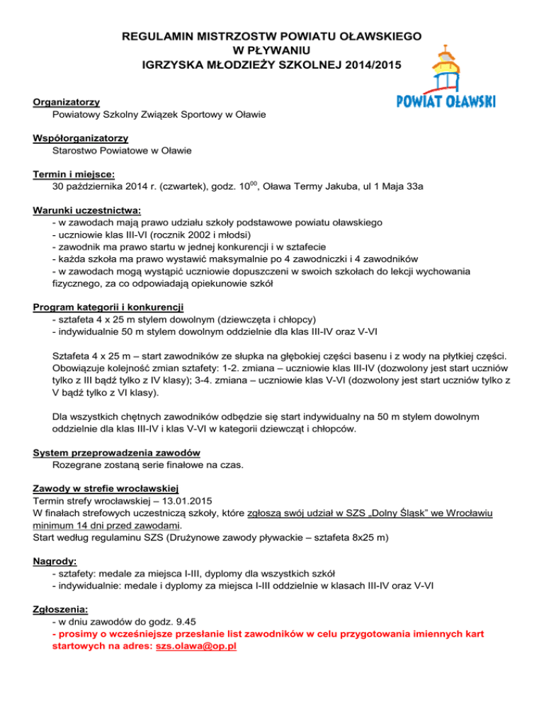 REGULAMIN MISTRZOSTW POWIATU OŁAWSKIEGO W PŁYWANIU IGRZYSKA MŁODZIEŻY SZKOLNEJ 2014/2015 Organizatorzy Powiatowy Szkolny Związek Sportowy w Oławie Współorganizatorzy Starostwo Powiatowe w Oławie Termin i miejsce: 30 października 2014 r. (czwartek), godz. 1000, Oława Termy Jakuba, ul 1 Maja 33a Warunki uczestnictwa: - w zawodach mają prawo udziału szkoły podstawowe powiatu oławskiego - uczniowie klas III-VI (rocznik 2002 i młodsi) - zawodnik ma prawo startu w jednej konkurencji i w sztafecie - każda szkoła ma prawo wystawić maksymalnie po 4 zawodniczki i 4 zawodników - w zawodach mogą wystąpić uczniowie dopuszczeni w swoich szkołach do lekcji wychowania fizycznego, za co odpowiadają opiekunowie szkół Program kategorii i konkurencji - sztafeta 4 x 25 m stylem dowolnym (dziewczęta i chłopcy) - indywidualnie 50 m stylem dowolnym oddzielnie dla klas III-IV oraz V-VI Sztafeta 4 x 25 m – start zawodników ze słupka na głębokiej części basenu i z wody na płytkiej części. Obowiązuje kolejność zmian sztafety: 1-2. zmiana – uczniowie klas III-IV (dozwolony jest start uczniów tylko z III bądź tylko z IV klasy); 3-4. zmiana – uczniowie klas V-VI (dozwolony jest start uczniów tylko z V bądź tylko z VI klasy). Dla wszystkich chętnych zawodników odbędzie się start indywidualny na 50 m stylem dowolnym oddzielnie dla klas III-IV i klas V-VI w kategorii dziewcząt i chłopców. System przeprowadzenia zawodów Rozegrane zostaną serie finałowe na czas. Zawody w strefie wrocławskiej Termin strefy wrocławskiej – 13.01.2015 W finałach strefowych uczestniczą szkoły, które zgłoszą swój udział w SZS „Dolny Śląsk” we Wrocławiu minimum 14 dni przed zawodami. Start według regulaminu SZS (Drużynowe zawody pływackie – sztafeta 8x25 m) Nagrody: - sztafety: medale za miejsca I-III, dyplomy dla wszystkich szkół - indywidualnie: medale i dyplomy za miejsca I-III oddzielnie w klasach III-IV oraz V-VI Zgłoszenia: - w dniu zawodów do godz. 9.45 - prosimy o wcześniejsze przesłanie list zawodników w celu przygotowania imiennych kart startowych na adres: [email protected] Uwagi techniczne: - zawodnicy i opiekunowie szkół przebywają ze swoimi uczniami na trybunach - na pływalni mogą przebywać wyłącznie zawodnicy aktualnie startujący (organizator zastrzega sobie prawo dyskwalifikacji zawodników utrudniających przeprowadzanie zawodów, w skrajnych przypadkach dyskwalifikacja może dotyczyć całej szkoły) - opiekunów szkół uprasza się o dopilnowanie przestrzegania przez uczniów powyższych zasad - organizator zapewnia szatnie - organizator nie ponosi odpowiedzialności za straty materialne uczniów - interpretacja niniejszego regulaminu należy do organizatora PROGRAM MINUTOWY 945 - zakończenie zgłaszania zawodników 1000 - start pierwszej konkurencji Kolejność konkurencji: 1. sztafeta 4 x 25 m dziewcząt (serie na czas) 2. sztafeta 4 x 25 m chłopców (serie na czas) 3. 50 m styl dowolny dziewcząt z klas III-IV 4. 50 m styl dowolny chłopców z klas III-IV 5. 50 m styl dowolny dziewcząt z klas V-VI 6. 50 m styl dowolny chłopców z klas V-VI