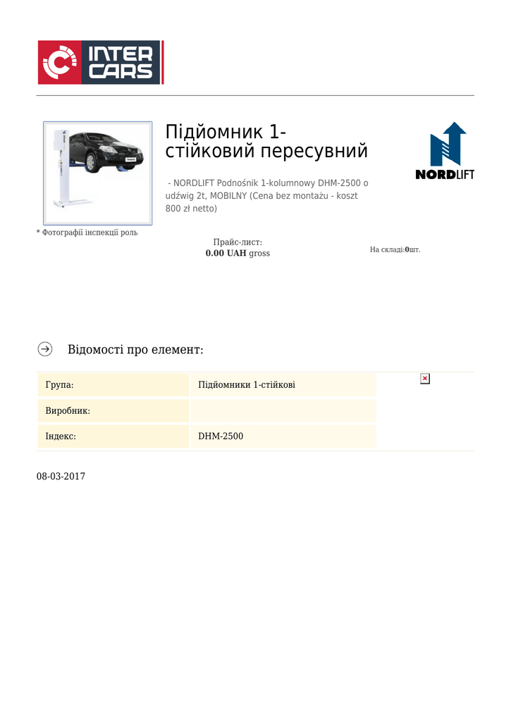 Підйомник 1стійковий пересувний - NORDLIFT Podnośnik 1-kolumnowy DHM-2500 o udźwig 2t, MOBILNY (Cena bez montażu - koszt 800 zł netto) * Фотографії інспекції роль Прайс-лист: 0.00 UAH gross Відомості про елемент: Група: Підйомники 1-стійкові Виробник: Індекс: 08-03-2017 DHM-2500 На складі:0шт.