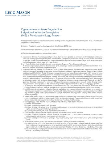 Legg Mason Towarzystwo Funduszy Inwestycyjnych SA ul. Bielańska 12, 00-085 Warszawa Tel. +48 22 337 6600 Faks +48 22 337 6699 www.leggmason.pl Ogłoszenie o zmianie Regulaminu Indywidualne Konto Emerytalne (IKE) z Funduszami Legg Mason Niniejszym informujemy o wprowadzeniu zmian do Regulaminu Indywidualne Konto Emerytalne (IKE) z Funduszami Legg Mason („Regulamin”). Zmieniony Regulamin zacznie obowiązywać od dnia 2 lutego 2015 roku. Tekst zmienionego Regulaminu znajduje się na stronie internetowej w sekcji Ogłoszenia i Raporty/2015-Ogłoszenia. W Regulaminie wprowadzono następujące zmiany: 1. rozszerzono definicję Funduszy, zawartą w § 1 ust. 3 pkt a, w ten sposób, że zakresem tej definicji objęto także „inne fundusze inwestycyjne zarządzane przez Towarzystwo, z którymi na podstawie umowy zawartej przez Oszczędzającego jest lub będzie prowadzone IKE”. W konsekwencji powyższej zmiany zmianie uległa też analogicznie definicja Subfunduszu, o której mowa w § 1 ust. 3 pkt i. 2. w § 1 ust. 3 pkt d dodano i zdefiniowano nowe pojęcie „Grupowe Plany Oszczędnościowe”. W związku z powyższą zmianą dodano nowy § 10, dotyczący zasad szczególnych gromadzenia środków w ramach Grupowych Planów Oszczędnościowych. 3. zmieniono definicję Strategii modelowej w § 1 ust. 3 pkt h w ten sposób, że określa ona, że podziału wpłat do IKE można dokonywać w oparciu o dwa nowe modele Strategii modelowej, zaoferowane przez Towarzystwo, tj. Model podstawowy i Model Cykl Życia. Strategia inwestycyjna wybrana przez Oszczędzającego, który zawarł Umowę przed dniem wejścia w życie Regulaminu w niniejszej wersji, pozostaje niezmieniona, o ile nie złoży on oświadczenia o wyborze Strategii indywidualnej lub Strategii modelowej. Do Strategii modelowej, wybranej na podstawie poprzednio obowiązujących wersji Regulaminu, stosuje się dotychczasowe zasady automatycznych dostosowań struktury zgromadzonych środków i alokacji wpłat. W związku z niniejszą zmianą, zmianie uległ Załącznik nr 3 do Regulaminu „Strategia modelowa”, a także w § 5 Regulaminu opisano zasady wyboru nowych modeli Strategii modelowej, określania alokacji wpłat na IKE oraz struktury środków zgromadzonych na IKE, w następujący sposób: 1) za wpłaty na IKE nabywane są jednostki uczestnictwa Funduszy lub Subfunduszy wskazanych w Umowie przez Oszczędzającego poprzez złożenie oświadczenia o wyborze Strategii indywidualnej lub Strategii modelowej. 2) jeżeli Umowa nie przewiduje możliwości złożenia oświadczenia o wyborze strategii przyjmuje się, że za wpłaty na IKE nabywane są jednostki uczestnictwa Funduszu lub Subfunduszu wskazanego w Modelu podstawowym Strategii modelowej, przy czym Oszczędzający w każdym momencie obowiązywania Umowy może złożyć zlecenie zmiany tej strategii. 3) zakres usług świadczonych przez uprawnionego dystrybutora wskazany w prospekcie informacyjnym Funduszu może przewidywać jedynie przekazywanie 100% środków do jednego Funduszu/Subfunduszu lub nie przewidywać możliwości przekazywania środków do danego Funduszu/Subfunduszu. 4) Oszczędzający, który dokonał wyboru Strategii indywidualnej, może złożyć zlecenie: a) zmiany alokacji wpłat, b) zmiany struktury zgromadzonych środków, c) zmiany Strategii indywidualnej na Strategię modelową, przy czym zmiana ta skutkuje zarówno zmianą alokacji wpłat, jak i struktury zgromadzonych środków, d) automatycznej zmiany struktury zgromadzonych środków. 5) Oszczędzający, który dokonał wyboru Strategii modelowej, może złożyć zlecenie: a) zmiany Strategii modelowej na inną Strategię modelową, przy czym zmiana ta skutkuje zarówno zmianą alokacji wpłat, jak i struktury zgromadzonych środków, b) zmiany Strategii modelowej na Strategię indywidualną, przy czym zmiana ta skutkuje tylko zmianą alokacji wpłat. 6) W przypadku wyboru przez Oszczędzającego Modelu Cykl Życia Strategii modelowej: a) w kolejnym dniu roboczym następującym po dniu, w którym Oszczędzający osiągnie wiek określony w tej Strategii modelowej, następuje zarówno zmiana alokacji wpłat na IKE, jak i zmiana struktury środków dotychczas zgromadzonych na IKE. Powyższa zmiana jest zgodna z alokacją określoną dla danego przedziału wiekowego, b) raz na 6 miesięcy następuje automatyczne dostosowanie struktury zgromadzonych środków do alokacji wynikającej z tej Strategii modelowej. Legg Mason Towarzystwo Funduszy Inwestycyjnych Spółka Akcyjna z siedzibą w Warszawie, ul. Bielańska 12, 00-085 Warszawa została wpisana do Rejestru Przedsiębiorców przez Sąd Rejonowy dla M. St. Warszawy w Warszawie, XII Wydział Gospodarczy Krajowego Rejestru Sądowego, pod numerem KRS 0000002717. Spółka posiada Numer Identyfikacji Podatkowej (NIP) 527 21 58 048 i w pełni opłacony kapitał zakładowy w wysokości 966300 złotych. 4. zmianie ulega brzmienie postanowienia § 2 ust. 1 w ten sposób, że otrzymuje on następujące brzmienie: „Gromadzenie oszczędności na IKE jest możliwe w oparciu o pisemną Umowę zawieraną na formularzu ustalonym przez Towarzystwo na wniosek osoby fizycznej, uprawnionej do gromadzenia środków na IKE.” 5. w § 2 ust. 5 wprowadzono postanowienie regulujące konsekwencje rozszerzenia listy Funduszy, z którymi można zawrzeć Umowę, które brzmi: „W przypadku, gdy lista Funduszy, z którymi można zawrzeć Umowę IKE, zostanie rozszerzona przez Towarzystwo po zawarciu Umowy, wówczas Oszczędzający, składając zlecenie zmiany alokacji wpłat, o którym mowa w § 3 ust. 1 lit. g, lub zlecenie zmiany struktury zgromadzonych środków, o którym mowa w § 3 ust. 1 lit. h, w ten sposób, że dotyczy ona jednostek uczestnictwa nowego Funduszu/Subfunduszu zawiera Umowę z nowym Funduszem/Subfunduszem w dniu złożenia tego zlecenia i staje się uczestnikiem tego Funduszu/Subfunduszu w dniu nabycia jednostek uczestnictwa, co skutkuje wejściem w ż