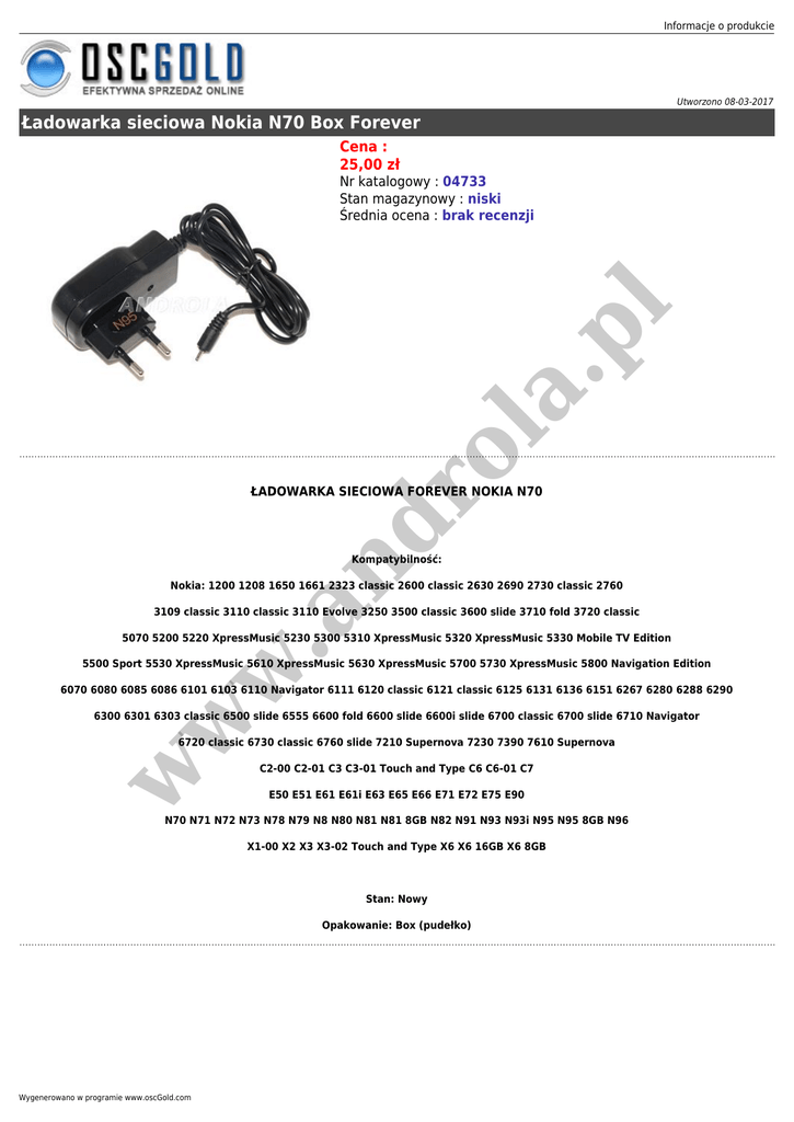 Informacje o produkcie Utworzono 08-03-2017 Ładowarka sieciowa Nokia N70 Box Forever Cena : 25,00 zł ro la .p l Nr katalogowy : 04733 Stan magazynowy : niski Średnia ocena : brak recenzji nd ŁADOWARKA SIECIOWA FOREVER NOKIA N70 Kompatybilność: Nokia: 1200 1208 1650 1661 2323 classic 2600 classic 2630 2690 2730 classic 2760 w .a 3109 classic 3110 classic 3110 Evolve 3250 3500 classic 3600 slide 3710 fold 3720 classic 5070 5200 5220 XpressMusic 5230 5300 5310 XpressMusic 5320 XpressMusic 5330 Mobile TV Edition 5500 Sport 5530 XpressMusic 5610 XpressMusic 5630 XpressMusic 5700 5730 XpressMusic 5800 Navigation Edition 6070 6080 6085 6086 6101 6103 6110 Navigator 6111 6120 classic 6121 classic 6125 6131 6136 6151 6267 6280 6288 6290 w 6300 6301 6303 classic 6500 slide 6555 6600 fold 6600 slide 6600i slide 6700 classic 6700 slide 6710 Navigator w 6720 classic 6730 classic 6760 slide 7210 Supernova 7230 7390 7610 Supernova C2-00 C2-01 C3 C3-01 Touch and Type C6 C6-01 C7 E50 E51 E61 E61i E63 E65 E66 E71 E72 E75 E90 N70 N71 N72 N73 N78 N79 N8 N80 N81 N81 8GB N82 N91 N93 N93i N95 N95 8GB N96 X1-00 X2 X3 X3-02 Touch and Type X6 X6 16GB X6 8GB Stan: Nowy Opakowanie: Box (pudełko) Wygenerowano w programie www.oscGold.com