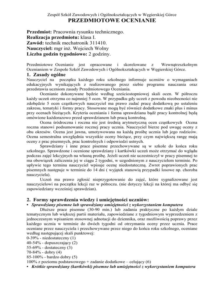 Zespół Szkół Zawodowych i Ogólnokształcących w Węgierskiej Górce PRZEDMIOTOWE OCENIANIE Przedmiot: Pracownia rysunku technicznego. Realizacja przedmiotu: klasa I. Zawód: technik mechatronik 311410. Nauczyciel: mgr inż. Wojciech Wolny Liczba godzin tygodniowo: 2 godziny. Przedmiotowe Ocenianie jest opracowane i skorelowane z Wewnątrzszkolnym Ocenianiem w Zespole Szkół Zawodowych i Ogólnokształcących w Węgierskiej Górce. 1. Zasady ogólne Nauczyciel na początku każdego roku szkolnego informuje uczniów o wymaganiach edukacyjnych wynikających z realizowanego przez siebie programu nauczania oraz przedstawia uczniom zasady Przedmiotowego Oceniania. Ocenianie dokonywane będzie według sześciostopniowej skali ocen. W półroczu każdy uczeń otrzyma co najmniej 5 ocen. W przypadku gdy uczeń z powodu nieobecności nie zdobędzie 5 ocen cząstkowych nauczyciel ma prawo zadać pracę dodatkową po ustaleniu zakresu, tematyki i formy pracy. Stosowane mogą być również dodatkowe znaki plus i minus przy ocenach bieżących. Kryteria oceniania i forma sprawdzianu bądź pracy kontrolnej będą omówione każdorazowo przed sprawdzianem lub pracą kontrolną. Ocena śródroczna i roczna nie jest średnią arytmetyczną ocen cząstkowych Ocena roczna stanowi podsumowanie rocznej pracy ucznia. Nauczyciel bierze pod uwagę oceny z obu okresów. Ocena jest jawna, umotywowana na każdą prośbę ucznia lub jego rodziców. Ocena semestralna uwzględnia wszystkie oceny bieżące, przy czym największą rangę mają oceny z prac pisemnych, prac kontrolnych i odpowiedzi ustnych. Sprawdziany i inne prace pisemne przechowywane są w szkole do końca roku szkolnego. Sprawdzone i ocenione sprawdziany i kartkówki uczeń może otrzymać do wglądu podczas zajęć lekcyjnych na własną prośbę. Jeżeli uczeń nie uczestniczył w pracy pisemnej to ma obowiązek zaliczenia jej w ciągu 2 tygodni, w uzgodnionym z nauczycielem terminie. Po upływie tego terminu nauczyciel wpisuje ocenę niedostateczną. Zwrot poprawionych prac pisemnych następuje w terminie do 14 dni ( wyjątek stanowią przypadki losowe np. choroba nauczyciela). Uczeń ma prawo zgłosić nieprzygotowanie do zajęć, które sygnalizowane jest nauczycielowi na początku lekcji raz w półroczu. (nie dotyczy lekcji na której ma odbyć się zapowiedziany wcześniej sprawdzian). 2. Formy sprawdzenia wiedzy i umiejętności uczniów: • Sprawdziany pisemne lub sprawdziany umiejętności z wykorzystaniem komputera Dłuższe prace pisemne (30-90 min.) lub zadania praktyczne po każdym dziale tematycznym lub większej partii materiału, zapowiedziane z tygodniowym wyprzedzeniem z jednoczesnym wpisaniem stosownej adnotacji do dziennika, oraz możliwością poprawy przez każdego ucznia w terminie do dwóch tygodni od otrzymania oceny przez ucznia. Prace oceniane przez nauczyciela i przechowywane przez niego do końca roku szkolnego, oceniane według następującej skali punktowej: 0-39% - niedostateczny (1) 40-54% - dopuszczający (2) 55-69% - dostateczny (3) 70-84% - dobry (4) 85-100% - bardzo dobry (5) 100% z poziomu podstawowego + zadanie dodatkowe – celujący (6) • Krótkie sprawdziany (kartkówki) pisemne lub umiejętności z wykorzystaniem komputera W ciągu semestru, mogą być niezapowiedziane. Obejmują materiał z trzech ostatnich tematów, mogą dotyczyć zadania domowego. • Odpowiedzi ustne Sprawdzające bieżącą wiedzę ucznia, obejmują materiał z trzech ostatnich tematów. • Zadania domowe Odrobione samodzielnie, złożone w formie i czasie ustalonej przez nauczyciela i przedstawionej do wiadomości uczniów. • Praca w grupach, aktywność na lekcjach Wcześniej zapowiadana i przygotowana lub odbywająca się bez zapowiedzi. 3. Kryteria wymagań na poszczególne oceny Ocena celująca (wymagania wykraczające): • Uczeń nie tylko spełnia wymagania na ocenę bardzo dobrą, ale posiada wiedzę i umiejętności wykraczającą poza realizowany program nauczania. • Wyróżnia się aktywnością w grupie, bierze udział w konkursach przedmiotowych. Ocena bardzo dobra (wymagania dopełniające) • Uczeń opanował pełny zakres wiedzy i umiejętności określony programem nauczania (ok. 85-100% pełnego zakresu wiedzy) • Sprawnie posługuje się zdobytymi wiadomościami • Jest zdyscyplinowany, potrafi samodzielnie objaśnić powiązać w całość wiadomości z programu nauczania • Aktywie uczestniczy w zajęciach, do których jest przygotowany • Systematycznie odrabia zadania domowe • Wyróżnia się pozytywną aktywnością na tle grupy • Pracuje systematycznie i solidnie. Ocena dobra (wymagania rozszerzone) • Uczeń opanował niepełny zakres wiedzy i umiejętności określony programem nauczania (ok. 70-84% pełnego zakresu wiedzy) • Potrafi zastosować zdobyte wiadomości w nowych zadaniach i sytuacjach • Postawa ucznia nie budzi zastrzeżeń • Uzyskuje stale dobre postępy w nauce • Aktywie uczestniczy w zajęciach, do których stara się być przygotowany Ocena dostateczna (wymagania podstawowe) • Uczeń opanował wiadomości i umiejętności umożliwiające zdobywanie dalszej wiedzy • Dysponuje przeciętną wiedzą w zakresie materiału przewidzianego programem, w jego wiadomościach są braki (ok. 55-69% pełnego zakresu wiedzy) • Prezentuje przeciętną pilność, systematyczność i zaangażowanie przedmiotem • Nie jest aktywny na zajęciach. Ocena dopuszczająca (wymagania konieczne) • Zdobyte wiadomości są niewystarczające– uczeń nie posiada podstawowej wiedzy (ok. 4054% pełnego zakresu wiedzy) • Uczeń rozwiązuje bardzo proste zadania o niewielkim stopniu trudności • Posiada spore braki w wiedzy i umiejętnościach, ma trudności z odrabianiem zadań domowych. • Postawa ucznia budzi niewielkie zastrzeżenia. Jeśli uczeń nie spełnia wymagań na ocenę dopuszczającą (bądź wyższą) oraz nie zalicza prac kontrolnych w wyznaczonym przez nauczy