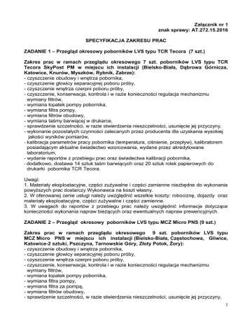 Załącznik nr 1 znak sprawy: AT.272.15.2016 SPECYFIKACJA ZAKRESU PRAC ZADANIE 1 – Przegląd okresowy poborników LVS typu TCR Tecora (7 szt.) Zakres prac w ramach przeglądu okresowego 7 szt. poborników LVS typu TCR Tecora SkyPost PM w miejscu ich instalacji (Bielsko-Biała, Dąbrowa Górnicza, Katowice, Knurów, Myszków, Rybnik, Zabrze): - czyszczenie obudowy i wnętrza pobornika, - czyszczenie głowicy separacyjnej poboru próby, - czyszczenie wnętrza czerpni poboru próby, - czyszczenie, konserwacja, kontrola i w razie konieczności regulacja mechanizmu wymiany filtrów, - wymiana łopatek pompy pobornika, - wymiana filtra pompy, - wymiana filtrów obudowy, - wymiana taśmy barwiącej w drukarce, - sprawdzenie szczelności, w razie stwierdzenia nieszczelności, usunięcie jej przyczyny, - wykonanie pozostałych czynności zalecanych przez producenta dla uzyskania wysokiej jakości wyników pomiarów, - kalibracja parametrów pracy pobornika (temperatura, ciśnienie, przepływ), kalibratorem posiadającym aktualne świadectwo wzorcowania, wydane przez akredytowane laboratorium, - wydanie raportów z przebiegu prac oraz świadectwa kalibracji pobornika, - dodatkowo, dostawa 14 sztuk taśm barwiących oraz 20 sztuk rolek papierowych do drukarki pobornika TCR Tecora. Uwagi: 1. Materiały eksploatacyjne, części zużywalne i części zamienne niezbędne do wykonania powyższych prac dostarczy Wykonawca na koszt własny. 2. W oferowanej cenie usługi należy uwzględnić wszelkie koszty: robociznę, dojazdy oraz materiały eksploatacyjne, części zużywalne i części zamienne. 3. W uwagach do raportów z przebiegu prac należy uwzględnić informacje dotyczące konieczności wykonania napraw bieżących oraz ewentualnych napraw prewencyjnych. ZADANIE 2 – Przegląd okresowy poborników LVS typu MCZ Micro PNS (9 szt.) Zakres prac w ramach przeglądu okresowego 9 szt. poborników LVS typu MCZ Micro PNS w miejscu ich instalacji (Bielsko-Biała, Częstochowa, Gliwice, Katowice-2 sztuki, Pszczyna, Tarnowskie Góry, Złoty Potok, Żory): - czyszczenie obudowy i wnętrza pobornika, - czyszczenie głowicy separacyjnej poboru próby, - czyszczenie wnętrza czerpni poboru próby, - czyszczenie, konserwacja, kontrola i w razie konieczności regulacja mechanizmu wymiany filtrów, - wymiana łopatek pompy pobornika, - wymiana filtra pompy, - wymiana filtra za pompą, - wymiana filtrów obudowy, - sprawdzenie szczelności, w razie stwierdzenia nieszczelności, usunięcie jej przyczyny, 1 - wykonanie pozostałych czynności zalecanych przez producenta dla uzyskania wysokiej jakości wyników pomiarów, - kalibracja parametrów pracy pobornika (temperatura, ciśnienie, przepływ), kalibratorem posiadającym aktualne świadectwo wzorcowania, wydane przez akredytowane laboratorium, - wydanie raportów z przebiegu prac oraz świadectwa kalibracji pobornika. Uwagi: 1. Materiały eksploatacyjne, części zużywalne i części zamienne niezbędne do wykonania powyższych prac dostarczy Wykonawca na koszt własny. 2. W oferowanej cenie usługi należy uwzględnić wszelkie koszty: robociznę, dojazdy oraz materiały eksploatacyjne, części zużywalne i części zamienne 3. W uwagach do raportów z przebiegu prac należy uwzględnić informacje dotyczące konieczności wykonania napraw bieżących oraz ewentualnych napraw prewencyjnych. ZADANIE 3 – Przegląd okresowy poborników HVS typu DIGITEL DHA 80 (2 szt.) Zakres prac w ramach przeglądu okresowego 2 szt. poborników HVS typu DIGITEL DHA 80 w miejscu ich instalacji (Godów): - czyszczenie obudowy i wnętrza pobornika, - czyszczenie głowicy separacyjnej poboru próby, - czyszczenie wnętrza czerpni poboru próby, - czyszczenie, konserwacja, kontrola i w razie konieczności regulacja mechanizmu wymiany filtrów, - kontrola stanu turbiny pobornika, - sprawdzenie szczelności, w razie stwierdzenia nieszczelności, usunięcie jej przyczyny, - wykonanie pozostałych czynności zalecanych przez producenta dla uzyskania wysokiej jakości wyników pomiarów, - kalibracja parametrów pracy pobornika (temperatura, ciśnienie, przepływ), kalibratorem posiadającym aktualne świadectwo wzorcowania, wydane przez akredytowane laboratorium, - wydanie raportów z przebiegu prac oraz świadectwa kalibracji pobornika. Uwagi: 1. Materiały eksploatacyjne, części zużywalne i części zamienne niezbędne do wykonania powyższych prac dostarczy Wykonawca na koszt własny. 2. W oferowanej cenie usługi należy uwzględnić wszelkie koszty: robociznę, dojazdy oraz materiały eksploatacyjne, części zużywalne i części zamienne 3. W uwagach do raportów z przebiegu prac należy uwzględnić informacje dotyczące konieczności wykonania napraw bieżących oraz ewentualnych napraw prewencyjnych. ZADANIE 4 – Przegląd okresowy poborników LVS typu Derenda PNS 15T-3.1 (3 szt.) Zakres prac w ramach przeglądu okresowego 3 szt. poborników LVS typu Derenda PNS 15T-3.1 w miejscu ich instalacji (Częstochowa, Tarnowskie Góry, Żywiec): - czyszczenie obudowy i wnętrza pobornika, - czyszczenie głowicy separacyjnej poboru próby, - czyszczenie wnętrza czerpni poboru próby, - czyszczenie, konserwacja, kontrola i w razie konieczności regulacja mechanizmu wymiany filtrów, - wymiana łopatek pompy pobornika, - wymiana filtra pompy, 2 - wymiana filtra za pompą, - sprawdzenie szczelności, w razie stwierdzenia nieszczelności, usunięcie jej przyczyny, - wykonanie pozostałych czynności zalecanych przez producenta dla uzyskania wysokiej jakości wyników pomiarów, - kalibracja parametrów pracy pobornika (temperatura, ciśnienie, przepływ), kalibratorem posiadającym aktualne świadectwo wzorcowania, wydane przez akredytowane laboratorium, - wydanie raportów z przebiegu prac oraz świadectwa kalibracji pobornika. Uwagi: 1. Materiały eksploatacyjne, części zużywalne i części zamienne niezbędne do wykonania powyższych prac dostarczy Wykonawca na koszt własny.