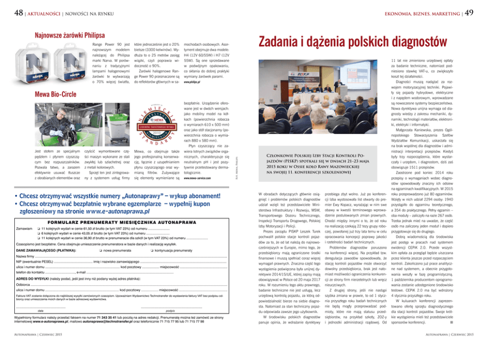 48 | AKTUALNOŚCI | NOWOŚCI NA RYNKU EKONOMIA, BIZNES, MARKETING | Najnowsze żarówki Philipsa Range Power 90 jest najnowszym modelem należącej do Philipsa marki Narva. W porów naniu z tradycyjnymi lampami halogenowymi żarówki te wytwarzają o 70% więcej światła, które jednocześnie jest o 20% bielsze (3300 kelwinów). Wy dłuża to o 25 metrów zasięg wiązki, czyli poprawia wi doczność o 90%. Żarówki halogenowe Ran ge Power 90 przeznaczone są do reflektorów głównych w sa Zadania i dążenia polskich diagnostów mochodach osobowych. Asor tyment obejmuje dwa modele: H4 (12V 60/55W) i H7 (12V 55W). Są one sprzedawane w podwójnym opakowaniu, co skłania do dobrej praktyki wymiany żarówek parami. www.philips.pl Jest stołem ze specjalnym pędzlem i płynem czyszczą cym bez rozpuszczalników. Pozwala łatwo, a zarazem efektywnie usuwać tłuszcze z obrabianych elementów oraz czyścić wymontowane czę ści maszyn wykonane ze stali zwykłej lub szlachetnej oraz z metali kolorowych. Sprzęt ten jest zintegrowa ny z systemem usług firmy Mewa, co obejmuje także jego profesjonalną konserwa cję, łącznie z uzupełnianiem płynu czyszczącego oraz wy mianą filtrów. Zużywające się elementy wymieniane są www.mewa-service.com • Chcesz otrzymywać wszystkie numery „Autonaprawy” – wykup abonament! • Chcesz otrzymywać bezpłatnie wybrane egzemplarze – wypełnij kupon zgłoszeniowy na stronie www.e-autonaprawa.pl FORMULARZ PRENUMERATY MIESIĘCZNIKA AUTONAPRAWA Zamawiam ❏ 11 kolejnych wydań w cenie 61,50 zł brutto (w tym VAT 23%) od numeru ........................ ❏ 6 kolejnych wydań w cenie 43,05 zł brutto (w tym VAT 23%) od numeru .......................... ❏ 11 kolejnych wydań w cenie 36,90 zł brutto w prenumeracie dla szkół (w tym VAT 23%) od numeru ........................ Czasopismo jest bezpłatne. Cena obejmuje umieszczenie prenumeratora w bazie danych i realizację wysyłek. DANE ZAMAWIAJĄCEGO (PŁATNIKA): ❏ nowa prenumerata ❏ kontynuacja prenumeraty Nazwa firmy ...................................................................................................................................................................................................................... NIP (ewentualnie PESEL) ........................................... imię i nazwisko zamawiającego ................................................................................................ ulica i numer domu ................................................................................... kod pocztowy ................... miejscowość ..................................................... telefon do kontaktu ................................., e-mail ................................................................................................. ADRES DO WYSYŁKI (należy podać, jeśli jest inny niż podany wyżej adres płatnika): Odbiorca ........................................................................................................................................................................................................................... ulica i numer domu .................................................................................. kod pocztowy ................... miejscowość ...................................................... Faktura VAT zostanie dołączona do najbliższej wysyłki zamówionych czasopism. Upoważniam Wydawnictwo Technotransfer do wystawienia faktury VAT bez podpisu odbiorcy oraz umieszczenia moich danych w bazie adresowej wydawnictwa. ....................................................... .................................................................... data podpis Wypełniony formularz należy przesłać faksem na numer 71 343 35 41 lub pocztą na adres redakcji. Prenumeratę można też zamówić ze strony internetowej www.e-autonaprawa.pl, mailowo [email protected] oraz telefonicznie 71 715 77 95 lub 71 715 77 98 Autonaprawa | Czerwiec 2015 Fot. Mewa, Philips Mewa Bio-Circle bezpłatnie. Urządzenie ofero wane jest w dwóch wersjach: jako mobilny model na kół kach (powierzchnia robocza o wymiarach 610 x 500 mm) oraz jako stół stacjonarny (po wierzchnia robocza o wymia rach 880 x 580 mm). Płyn czyszczący nie za wiera lotnych związków orga nicznych, charakteryzuje się neutralnym pH i jest pozy tywnie przetestowany derma tologicznie. 49 Członkowie Polskiej Izby Stacji Kontroli Po jazdów (PISKP) spotkali się w dniach 21–23 maja 2015 roku w Ossie koło Rawy Mazowieckiej na swojej 11. konferencji szkoleniowej W obradach dotyczących głównie osią gnięć i problemów polskich diagnostów udział wzięli też przedstawiciele Mini sterstwa Infrastruktury i Rozwoju, MSW, Transportowego Dozoru Technicznego, Inspekcji Transportu Drogowego, Polskiej Izby Motoryzacji i Policji. Prezes zarządu PISKP Leszek Turek pochwalił polskie stacje kontroli pojaz dów za to, że od lat należą do najnowo cześniejszych w Europie, mimo tego, że przedsiębiorcy mają ograniczone środki finansowe i muszą spełniać coraz więcej wymagań prawnych. Znaczna część tego wystąpienia poświęcona była unijnej dy rektywie 2014/15/UE, której zapisy mają obowiązywać w Polsce od 20 maja 2017 roku. W rozumieniu tego aktu prawnego, badanie techniczne nie jest usługą, lecz urzędową kontrolą pojazdu, za którą od powiedzialność bierze na siebie diagno sta. Natomiast za stan techniczny pojaz du odpowiada zawsze jego użytkownik. W środowisku polskich diagnostów panuje opinia, że wdrażanie dyrektywy przebiega zbyt wolno. Już po konferen cji Izba wystosowała list otwarty do pre mier Ewy Kopacz, wyrażając w nim swe obawy w kwestii terminowego wprowa dzenie postulowanych zmian prawnych. Chodzi między innymi o to, że od roku na realizację czekają 22 tezy grupy robo czej, powołanej już trzy lata temu w celu opracowania koncepcji poprawy jakości i rzetelności badań technicznych. Problemów d