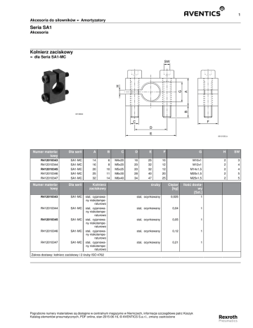 1 Akcesoria do siłowników ► Amortyzatory Seria SA1 Akcesoria Kołnierz zaciskowy ► dla Seria SA1-MC A B G H SW 00136604 C F D E Numer materiałowy 00121353_b Dla serii A B C D E F G H SW R412010343 SA1-MC 14 6 M4x20 16 25 10 M10x1 2 3 R412010344 SA1-MC 16 8 M5x20 20 32 12 M12x1 2 4 R412010345 SA1-MC 20 10 M5x25 20 32 12 M14x1,5 2 4 R412010346 SA1-MC 25 11 M6x30 28 40 20 M20x1,5 2 5 R412010347 SA1-MC 32 14 M6x40 34 47 25 M25x1,5 2 5 Numer materiałowy Dla serii Kołnierz zaciskowy śruby Ciężar [kg] R412010343 SA1-MC stal, cyjanowany niskotemperaturowo stal, ocynkowany 0,025 R412010344 SA1-MC stal, cyjanowany niskotemperaturowo stal, ocynkowany 0,04 1 R412010345 SA1-MC stal, cyjanowany niskotemperaturowo stal, ocynkowany 0,05 1 R412010346 SA1-MC stal, cyjanowany niskotemperaturowo stal, ocynkowany 0,12 1 R412010347 SA1-MC stal, cyjanowany niskotemperaturowo stal, ocynkowany 0,21 1 Ilość dostawy [Szt.] Zakres dostawy: kołnierz zaciskowy i 2 śruby ISO 4762 Pogrubione numery materiałowe są dostępne w centralnym magazynie w Niemczech, informacje szczegółowe patrz Koszyk Katalog elementów pneumatycznych, PDF online, stan 2015-06-16, © AVENTICS S.a.r.l., zmiany zastrzeżone 1
