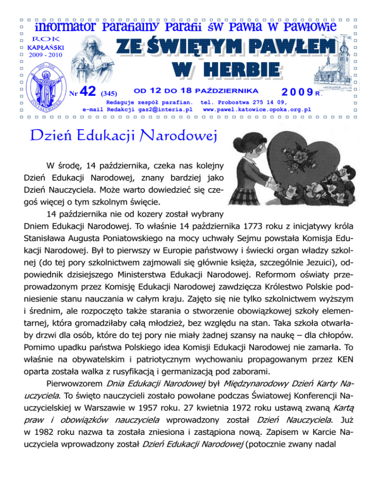 ROK KAPŁAŃSKI KAPŁA SKI 2009 - 2010 Nr 42 (345) OD 12 DO 18 PAŹDZIERNIKA Redaguje zespół parafian. e-mail Redakcji [email protected] 2 0 0 9 R. tel. Probostwa 275 14 09, www.pawel.katowice.opoka.org.pl Dzień Edukacji Narodowej W środę, 14 października, czeka nas kolejny Dzień Edukacji Narodowej, znany bardziej jako Dzień Nauczyciela. MoŜe warto dowiedzieć się czegoś więcej o tym szkolnym święcie. 14 października nie od kozery został wybrany Dniem Edukacji Narodowej. To właśnie 14 października 1773 roku z inicjatywy króla Stanisława Augusta Poniatowskiego na mocy uchwały Sejmu powstała Komisja Edukacji Narodowej. Był to pierwszy w Europie państwowy i świecki organ władzy szkolnej (do tej pory szkolnictwem zajmowali się głównie księŜa, szczególnie Jezuici), odpowiednik dzisiejszego Ministerstwa Edukacji Narodowej. Reformom oświaty przeprowadzonym przez Komisję Edukacji Narodowej zawdzięcza Królestwo Polskie podniesienie stanu nauczania w całym kraju. Zajęto się nie tylko szkolnictwem wyŜszym i średnim, ale rozpoczęto takŜe starania o stworzenie obowiązkowej szkoły elementarnej, która gromadziłaby całą młodzieŜ, bez względu na stan. Taka szkoła otwarłaby drzwi dla osób, które do tej pory nie miały Ŝadnej szansy na naukę – dla chłopów. Pomimo upadku państwa Polskiego idea Komisji Edukacji Narodowej nie zamarła. To właśnie na obywatelskim i patriotycznym wychowaniu propagowanym przez KEN oparta została walka z rusyfikacją i germanizacją pod zaborami. Pierwowzorem Dnia Edukacji Narodowej był Międzynarodowy Dzień Karty Na- uczyciela. To święto nauczycieli zostało powołane podczas Światowej Konferencji Nauczycielskiej w Warszawie w 1957 roku. 27 kwietnia 1972 roku ustawą zwaną Kartą praw i obowiązków nauczyciela wprowadzony został Dzień Nauczyciela. JuŜ w 1982 roku nazwa ta została zniesiona i zastąpiona nową. Zapisem w Karcie Nauczyciela wprowadzony został Dzień Edukacji Narodowej (potocznie zwany nadal Dniem Nauczyciela). Ustawa z dnia 26 stycznia 1982 roku mówi, Ŝe dzień ten uznany jest za święto wszystkich pracowników oświaty. KaŜdy z nas z pewnym sentymentem wspomina czasy szkolne. Dlatego dołączamy się do modlitw i Ŝyczeń dla nauczycieli, wychowawców i katechetów, wspominając emerytowanych i zmarłych nauczycieli. "Wykształcenie to dobro, którego nic nie jest w stanie nas pozbawić". W podziękowaniu podzi kowaniu za trudną trudn pracę prac i wskazanie właściwych wła ciwych dróg wszystkim nauczycielom Ŝyczymy yczymy duŜo du o szczęścia szcz cia i radości rado ci z wykonywanej pracy, sukcesów zawodowych i samych wzorowych uczniów. Niech wam sprzyja los w tej niełatwej pracy. Patronem nauczycieli i wychowawców jest Jean Baptiste de La Salle. Jean Baptiste de La Salle Ŝył na przełomie wieków XVII i XVIII. Ten wykształcony i pełen współczucia dla innych człowiek pozostawał zawsze wraŜliwy - sercem i oczyma - na niedolę najniŜszych warstw społeczeństwa. Poruszało go szczególnie cierpienie dzieci i młodzieŜy z najuboŜszych rodzin. W 1979 r. załoŜył szkołę dla chłopców, wzorowaną na wcześniej juŜ załoŜonej przezeń szkole dla dziewcząt. Nauczycieli, którzy odpowiedzieli na jego wezwanie, gościł i Ŝywił w swoim domu. Wspólnota ubogich nauczycieli mieszkających pod jednym dachem przekształciła się niejako sama przez się w Stowarzyszenie Braci Szkół Chrześcijańskich, tzw. „braci szkolnych”. W 1684 r. Jean Baptiste de La Salle i jego współbracia ślubowali wspólne Ŝycie w społeczności klasztornej. Nowe zgromadzenie szybko rozprzestrzeniało się we Francji, zakładając szkoły niedzielne dla młodzieŜy pracującej, szkoły realne, seminaria nauczycielskie i zakłady dla zaniedbanych chłopców. To właśnie Jean Baptiste de La Salle zastąpił nauczanie indywidualne nauką w klasach oraz w niŜszych klasach lekcje w języku łacińskim nauką w języku ojczystym. Był to początek francuskich szkół powszechnych. U podstaw edukacji realizowanej przez „braci szkolnych” legło autentyczne chrześcijaństwo. Jean Baptiste de La Salle powtarzał: „Kto nie zna Chrystusa, nie moŜe być dobrym wychowawcą młodzieŜy”. [Za: Święci na kaŜdy dzień. Patroni naszych imion] INFORMUJEMY mieszkańców Pawłowa, Ŝe – 24 października (sobota) – od godz. 800 młodzieŜ OAZOWA prowadzić będzie „AKCJĘ SZKŁO”. Zbierane będzie przygotowane w ramach jesiennych porządków przez Was białe i kolorowe szkło. Prosimy o nie wyrzucanie szkła do kontenerów i gromadzenie go do czasu naszej akcji. Uwaga: prosimy nie gromadzić szyb – nie będą przez nas zbierane – huta szkła nie przyjmuje ich do utylizacji. Przyłącz się do naszej akcji DZIĘKUJEMY !!! :) OGŁOSZENIA DUSZPASTERSKIE: Dziś obchodzimy Dzień Papieski. Przed kościołami w całej Polsce przeprowa dzana jest Zbiórka na Fundusz „Dzieło Nowego Tysiąclecia” Na Mszach św. niedzielnych przeprowadzone jest liczenie wiernych. Zapraszam na NaboŜeństwa róŜańcowe: w niedziele o godz.1630, a w tygodniu o godz. 1730. Msza św. szkolna dla dzieci odprawiona jest w środę o godz. 800. We wtorek 13 października o godz. 1800 odprawiona zostanie Msza św. ku czci Trójcy Przenajświętszej i Matki Boskiej Fatimskiej z procesją ze świecami wokół kościoła. MłodzieŜ przygotowującą się do przyjęcia Sakramentu Bierzmowania zapraszam w czwartek na Mszę św. i kolejne spotkanie. W piątek na Mszy św. porannej modlimy się o beatyfikację Sługi BoŜego Jana Pawła II. W przyszłą niedzielę obchodzony jest Światowy Dzień Misyjny. Spowiedź św. codziennie o godz. 1700. Kolekta w przyszłą niedzielę przeznaczona będzie na potrzeby naszej parafii. „Bóg zapłać” za dzisiejsze ofiary na WyŜsze Śląskie Seminarium Duchowne oraz na Fundusz „Dzieła Nowego Tysiąclecia”. Do nabycia są Kalendarze KsięŜy Werbistów na 2010r.
