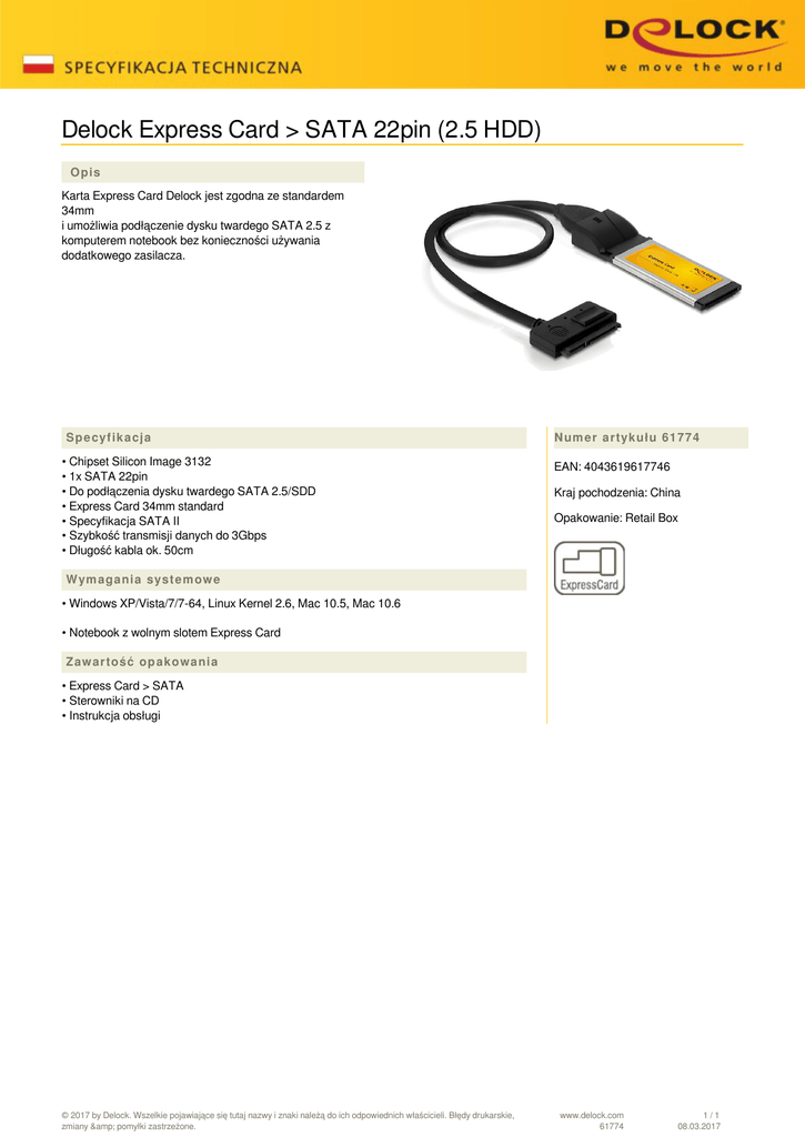 Delock Express Card > SATA 22pin (2.5 HDD) Opis Karta Express Card Delock jest zgodna ze standardem 34mm i umożliwia podłączenie dysku twardego SATA 2.5 z komputerem notebook bez konieczności używania dodatkowego zasilacza. Specyfikacja • Chipset Silicon Image 3132 • 1x SATA 22pin • Do podłączenia dysku twardego SATA 2.5/SDD • Express Card 34mm standard • Specyfikacja SATA II • Szybkość transmisji danych do 3Gbps • Długość kabla ok. 50cm Numer artykułu 61774 EAN: 4043619617746 Kraj pochodzenia: China Opakowanie: Retail Box Wymagania systemowe • Windows XP/Vista/7/7-64, Linux Kernel 2.6, Mac 10.5, Mac 10.6 • Notebook z wolnym slotem Express Card Zawartość opakowania • Express Card > SATA • Sterowniki na CD • Instrukcja obsługi © 2017 by Delock. Wszelkie pojawiające się tutaj nazwy i znaki należą do ich odpowiednich właścicieli. Błędy drukarskie, zmiany & pomyłki zastrzeżone. Powered by TCPDF (www.tcpdf.org) www.delock.com 61774 1/1 08.03.2017