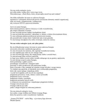 Nie ma wielu rodzajów życia, jest tylko jedno i jedna siła w sercu tego życia. Siła jednocząca: „Duch Boży, który od początku unosił się nad wodami”. Oto kilka miliardów lat temu ta cudowna Energia tajemniczo i umiejętnie skierowała pewne rozrzucone elementy materii organicznej, żeby się zeszły, zorganizowały i zjednoczyły, aby wreszcie OŻYŁA pierwsza komórka. Jest to ta sama Energia, która dzisiaj porusza, śpiewa i krzyczy w ciele wszechświata, aby mógł codziennie wzrastać. To ona uczyniła korzeń, będący kochankiem ziemi. To ona uczyniła kłos pszenicy, zakochany w słońcu, a słońce dworzaninem kłosu. To ona rozkazuje ptakom przekraczać przestworza oceanu, aby poszukiwały swojej ziemi i budowały tam swoje gniazda. To ona kieruje nieodparcie ku sobie zwierzęta, samca ku samicy. Nie ma wielu rodzajów życie, ale tylko jedno. Bo oto kilkadziesiąt tysięcy lat temu ta sama cudowna Energia stworzyła człowieka i podniosła jego głowę. To ona otworzyła mu ramiona, aby ogarnął i kształtował ziemię. To ona zapaliła jego ciało na zew innego ciała. To ona ożywiła jego mózg, aby mógł poznać siebie i swoich braci. To ona pewnego dnia wreszcie sprawiła, że Jego serce zabiło żywiej wobec światła rodzącego się na granicy spojrzenia. I to jest dzisiaj wciąż ta sama Energia, która pochodząc z głębi czasów, przenikając wszechświat i mnogość ludzi powstaje w tobie gwałtownie jak podziemne źródło, które wytryska z siłą, szukając po omacku swego łożyska i swego morza. To właśnie ona sprawiła, że narodziły się te różnorodne pragnienia, które tak często nękają i niepokoją ciebie i są tak bezwzględne, jeśli się ich nie zaspokaja pragnienia powietrza, wody, słońca i ziemi żywicielki pragnienia życia i rozwoju, pragnienia wiedzy i poznania pragnienia poznania innych osób, a zwłaszcza owo przedziwne i niepokojące pragnienie kobiety twojego serca ku jej sercu twojego ciała ku jej ciału jedno i drugie biegnie ku obiecanej jedności. Nie ma różnych rodzajów życia, lecz jedno, a jego źródłem jest Miłość twojego Boga, który bez przerwy rodzi wszechświat i ludzkość. „Jestem ŻYCIEM” – mówi Bóg – a ja wierzę Jego słowom. Michel Quoist