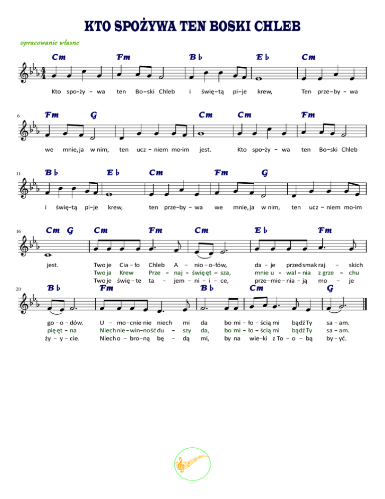 KTO SPOŻYWA TEN BOSKI CHLEB opracowanie własne Cm Kto spo ży Fm 6 11 wa ten Bo ski Chleb i Ten prze by mnie,ja w nim, ten ucz niem mo im E♭ 16 świę tą Cm G pi je 20 B♭ go o dów. pię ęt na ży y cie. świę tą pi je krew, Cm jest. Cm Fm ten prze by wa we Fm Cm Two je Cia ło Two ja Krew Two je świę te A naj jem nio o łów, świę ęt sza, ni i ce, Chleb Prze ta U mo cnie nie niech Niech nie win ność du Niecho bro ną bę wa Cm Fm Kto spo ży ten Bo ski Chleb wa G mnie, ja w nim, ten B♭ Fm krew, ucz niem mo im E♭ jest. Cm Cm B♭ i E♭ G we B♭ Fm 4 4 Fm da je przed smak raj mnie u wal nia z grze prze mie nia ją mo skich chu je Cm G mi szy dą bo mi bo mi by na sa am. sa am. by yć. da da, mi, C ło ścią mi ło ścią mi wie ki z To bądź Ty bądź Ty o bą