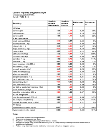Ceny w regionie przygranicznym Miesiąc: grudzień 2009 r. Kurs € / PLN: 4,10 Produkty Średnia cena w Niemczech Średnia cena w Polsce Różnica w € Różnica w % I. Paliwa benzyna (95) 1,35 1,04 0,30 29% olej napędowy 1,13 0,94 0,18 19% benzyna (98) 1,35 1,11 0,24 22% chleb tostowy (500 g) 0,45 0,47 -0,02 5% masło (cena za 1 kg) 3,96 4,26 -0,30 8% mleko 1,5% (1 l) 0,48 0,41 0,07 16% mąka pszenna (1 kg) 0,25 0,39 -0,14 55% cukier (1 kg) 0,69 0,57 0,12 20% jabłka luzem (1 kg) 1,75 0,44 1,31 300% pomarańcze (1 kg) 0,80 1,34 -0,54 68% pomidory (1 kg) 1,78 0,73 1,05 144% ziemniaki (1 kg) 0,40 0,31 0,09 31% jogurt owocowy mild (250 g) 0,39 0,39 0,00 0% mozzarella (125 g) 0,49 0,67 -0,18 37% groszek (puszka 400g) 0,49 0,29 0,20 69% kawa mielona (500 g) 2,49 3,29 -0,80 32% wino czerwone (1 l) 2,89 2,68 0,21 8% sok pomarańczowy (1 l) 0,79 0,80 -0,01 2% napój wieloowocowy (1 l) 0,62 0,41 0,21 50% sok jabłkowy (0,5 l) 0,36 0,39 -0,03 8% mus śliwkowy (500 g) 1,69 1,10 0,59 54% ser żółty w plasterkach (cena za 1 kg) 4,99 4,63 0,36 8% pizza mrożona (350 g) 1,29 1,46 -0,17 13% pierniki w czekoladzie (250 g) 0,85 1,32 -0,47 55% płyn do mycia naczyń (500 ml) 0,65 0,26 0,39 147% żel pod prysznic (250 ml) 0,65 1,41 -0,76 117% proszek do prania (cena za 1 kg) 2,55 2,34 0,21 9% fryzjer damski (mycie, cięcie) 20,97 7,81 13,15 168% fryzjer męski (mycie, cięcie) 15,30 5,45 9,85 181% II. Art. spożywcze III. Art. drogeryjne IV. Usługi Uwagi: 1. 2. 3. 4. 5. Niższe ceny są zaznaczone na czerwono. Wszystkie ceny są podane w Euro. Były brane pod uwagę najtańsze produkty danego rodzaju. Porównane zostały ceny produktów oferowanych w tej samej sieci dyskontowej w Polsce i Niemczech (z wyjątkiem paliw i usług). Podane ceny stanowią wartości średnie i w zależności od regionu mogą się wahać.