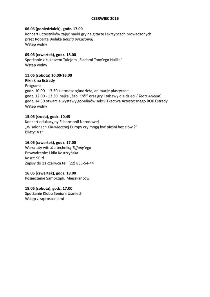 CZERWIEC 2016 06.06 (poniedziałek), godz. 17.00 Koncert uczestników zajęć nauki gry na gitarze i skrzypcach prowadzonych przez Roberta Bielaka (lekcja pokazowa) Wstęp wolny 09.06 (czwartek), godz. 18.00 Spotkanie z Łukaszem Tulejem „Śladami Tony'ego Halika” Wstęp wolny 11.06 (sobota) 10.00-16.00 Piknik na Estrady Program: godz. 10.00 - 13.30 kiermasz rękodzieła, animacje plastyczne godz. 12.00 - 13.30 bajka „Żabi Król” oraz gry i zabawy dla dzieci ( Teatr Arlekin) godz. 14.30 otwarcie wystawy gobelinów sekcji Tkactwa Artystycznego BOK Estrady Wstęp wolny 15.06 (środa), godz. 10.45 Koncert edukacyjny Filharmonii Narodowej „W salonach XIX-wiecznej Europy czy mogą być pieśni bez słów ?” Bilety: 4 zł 16.06 (czwartek), godz. 17.00 Warsztaty witrażu techniką Tiffany'ego Prowadzenie: Lidia Kostrzyńska Koszt: 90 zł Zapisy do 11 czerwca tel. (22) 835-54-44 16.06 (czwartek), godz. 18.00 Posiedzenie Samorządu Mieszkańców 18.06 (sobota), godz. 17.00 Spotkanie Klubu Seniora Uśmiech Wstęp z zaproszeniami