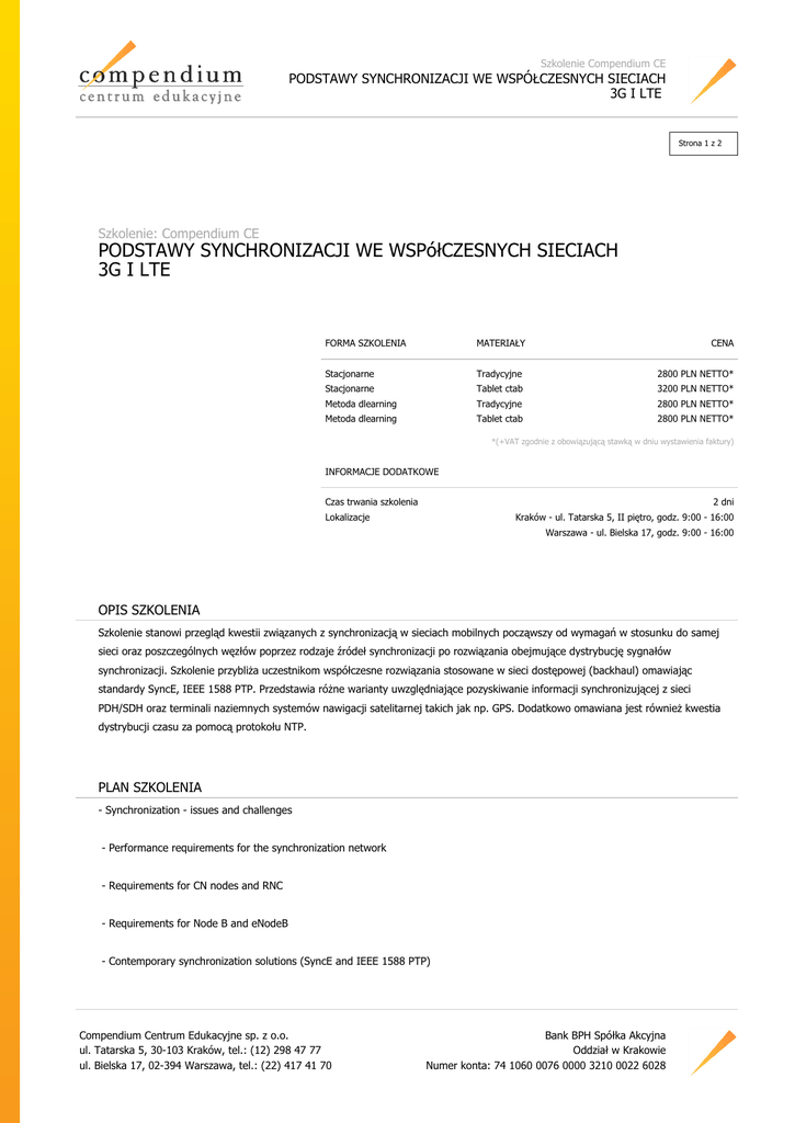 Szkolenie Compendium CE PODSTAWY SYNCHRONIZACJI WE WSPÓŁCZESNYCH SIECIACH 3G I LTE Strona 1 z 2 Szkolenie: Compendium CE PODSTAWY SYNCHRONIZACJI WE WSPółCZESNYCH SIECIACH 3G I LTE FORMA SZKOLENIA MATERIAŁY CENA Stacjonarne Tradycyjne 2800 PLN NETTO* Stacjonarne Tablet ctab 3200 PLN NETTO* Metoda dlearning Tradycyjne 2800 PLN NETTO* Metoda dlearning Tablet ctab 2800 PLN NETTO* *(+VAT zgodnie z obowiązującą stawką w dniu wystawienia faktury) INFORMACJE DODATKOWE Czas trwania szkolenia 2 dni Lokalizacje Kraków - ul. Tatarska 5, II piętro, godz. 9:00 - 16:00 Warszawa - ul. Bielska 17, godz. 9:00 - 16:00 OPIS SZKOLENIA Szkolenie stanowi przegląd kwestii związanych z synchronizacją w sieciach mobilnych począwszy od wymagań w stosunku do samej sieci oraz poszczególnych węzłów poprzez rodzaje źródeł synchronizacji po rozwiązania obejmujące dystrybucję sygnałów synchronizacji. Szkolenie przybliża uczestnikom współczesne rozwiązania stosowane w sieci dostępowej (backhaul) omawiając standardy SyncE, IEEE 1588 PTP. Przedstawia różne warianty uwzględniające pozyskiwanie informacji synchronizującej z sieci PDH/SDH oraz terminali naziemnych systemów nawigacji satelitarnej takich jak np. GPS. Dodatkowo omawiana jest również kwestia dystrybucji czasu za pomocą protokołu NTP. PLAN SZKOLENIA - Synchronization - issues and challenges - Performance requirements for the synchronization network - Requirements for CN nodes and RNC - Requirements for Node B and eNodeB - Contemporary synchronization solutions (SyncE and IEEE 1588 PTP) Compendium Centrum Edukacyjne sp. z o.o. ul. Tatarska 5, 30-103 Kraków, tel.: (12) 298 47 77 ul. Bielska 17, 02-394 Warszawa, tel.: (22) 417 41 70 Bank BPH Spółka Akcyjna Oddział w Krakowie Numer konta: 74 1060 0076 0000 3210 0022 6028 Szkolenie Compendium CE PODSTAWY SYNCHRONIZACJI WE WSPÓŁCZESNYCH SIECIACH 3G I LTE Strona 2 z 2 - Distribution of time information (NTP) - Reference solutions - UMTS FDD case - Trusted SDH/SONET Transport Network, UMTS-FDD - Trusted PDH Transport Network, UMTS FDD - Leased lines, UMTS TDD Scenarios - Proprietary solutions - examples WYMAGANIA DLA UCZESTNIKA Oczekuje się, że uczestnicy powinni posiadać podstawową wiedzę na temat sieci szkieletowej i architektury w sieciach 3G i LTE. Podstawowa wiedza z technologii transmisji danych i stosu protokołu IP będzie również pomocna. CERTYFIKATY Uczestnicy szkolenia otrzymują certyfikat sygnowany przez firmę Compendium CE. PROWADZĄCY Autoryzowany trener Compendium CE. Compendium Centrum Edukacyjne sp. z o.o. ul. Tatarska 5, 30-103 Kraków, tel.: (12) 298 47 77 ul. Bielska 17, 02-394 Warszawa, tel.: (22) 417 41 70 Bank BPH Spółka Akcyjna Oddział w Krakowie Numer konta: 74 1060 0076 0000 3210 0022 6028