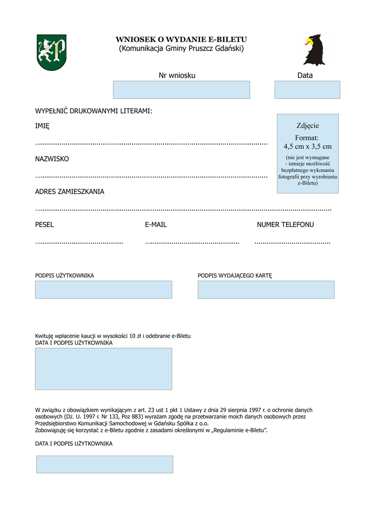 WNIOSEK O WYDANIE E-BILETU (Komunikacja Gminy Pruszcz Gdański) Nr wniosku Data WYPEŁNIĆ DRUKOWANYMI LITERAMI: IMIĘ Zdjęcie ….............................................................................................................. NAZWISKO ….............................................................................................................. Format: 4,5 cm x 3,5 cm (nie jest wymagane - istnieje możliwość bezpłatnego wykonania fotografii przy wyrobieniu e-Biletu) ADRES ZAMIESZKANIA …............................................................................................................................................. PESEL E-MAIL …........................................ …........................................... PODPIS UŻYTKOWNIKA NUMER TELEFONU ..................................... PODPIS WYDAJĄCEGO KARTĘ Kwituję wpłacenie kaucji w wysokości 10 zł i odebranie e-Biletu DATA I PODPIS UŻYTKOWNIKA W związku z obowiązkiem wynikającym z art. 23 ust 1 pkt 1 Ustawy z dnia 29 sierpnia 1997 r. o ochronie danych osobowych (Dz. U. 1997 r. Nr 133, Poz 883) wyrażam zgodę na przetwarzanie moich danych osobowych przez Przedsiębiorstwo Komunikacji Samochodowej w Gdańsku Spółka z o.o. Zobowiązuję się korzystać z e-Biletu zgodnie z zasadami określonymi w „Regulaminie e-Biletu”. DATA I PODPIS UŻYTKOWNIKA