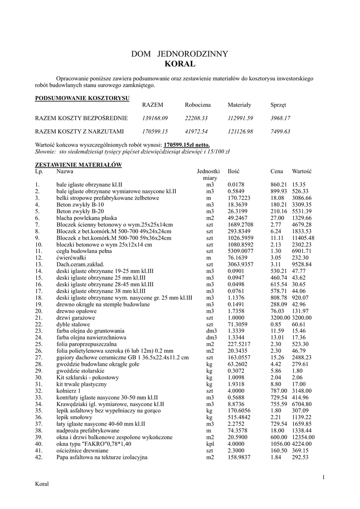 DOM JEDNORODZINNY KORAL Opracowanie poniższe zawiera podsumowanie oraz zestawienie materiałów do kosztorysu inwestorskiego robót budowlanych stanu surowego zamkniętego. PODSUMOWANIE KOSZTORYSU RAZEM Robocizna Materiały Sprzęt RAZEM KOSZTY BEZPOŚREDNIE 139168.09 22208.33 112991.59 3968.17 RAZEM KOSZTY Z NARZUTAMI 170599.15 41972.54 121126.98 7499.63 Wartość końcowa wyszczególnionych robót wynosi: 170599.15zł netto. Słownie: sto siedemdziesiąt tysięcy pięćset dziewięćdziesiąt dziewięć i 15/100 zł ZESTAWIENIE MATERIAŁÓW Lp. Nazwa Ilość Cena 1. 2. 3. 4. 5. 6. 7. 8. 9. 10. 11. 12. 13. 14. 15. 16. 17. 18. 19. 20. 21. 22. 23. 24. 25. 26. 27. 28. 29. 30. 31. 32. 33. 34. 35. 36. 37. 38. 39. 40. 41. 42. 0.0178 0.5849 170.7223 18.3639 26.3199 49.2467 1689.2708 293.8349 1026.5959 1080.8592 5309.0077 76.1639 3063.9357 0.0901 0.0947 0.0498 0.0761 1.1376 0.1491 1.7358 1.0000 71.3059 1.3339 1.3344 227.5217 20.3435 163.0557 63.2602 0.3072 1.0098 1.9318 4.0000 0.5688 8.8736 170.6056 515.4842 2.2752 74.3578 20.5900 4.0000 2.3000 158.9837 860.21 15.35 899.93 526.33 18.08 3086.66 180.21 3309.35 210.16 5531.39 27.00 1329.66 2.77 4679.28 6.24 1833.53 11.11 11405.48 2.13 2302.23 1.30 6901.71 3.05 232.30 3.11 9528.84 530.21 47.77 460.74 43.62 615.54 30.65 578.71 44.06 808.78 920.07 288.09 42.96 76.03 131.97 3200.00 3200.00 0.85 60.61 11.59 15.46 13.01 17.36 2.30 523.30 2.30 46.79 15.26 2488.23 4.42 279.61 5.86 1.80 2.04 2.06 8.80 17.00 787.00 3148.00 729.54 414.96 755.59 6704.80 1.80 307.09 2.21 1139.22 729.54 1659.85 18.00 1338.44 600.00 12354.00 1056.00 4224.00 160.50 369.15 1.84 292.53 Koral Jednostki miary bale iglaste obrzynane kl.II m3 bale iglaste obrzynane wymiarowe nasycone kl.II m3 belki stropowe prefabrykowane żelbetowe m Beton zwykły B-10 m3 Beton zwykły B-20 m3 blacha powlekana płaska m2 Bloczek ścienny betonowy o wym.25x25x14cm szt Bloczek z bet.komórk.M 500-700 49x24x24cm szt Bloczek z bet.komórk.M 500-700 59x36x24cm szt bloczki betonowe o wym 25x12x14 cm szt cegła budowlana pełna szt ćwierćwałki m Dach.ceram.zakład. szt deski iglaste obrzynane 19-25 mm kl.III m3 deski iglaste obrzynane 25 mm kl.III m3 deski iglaste obrzynane 28-45 mm kl.III m3 deski iglaste obrzynane 38 mm kl.III m3 deski iglaste obrzynane wym. nasycone gr. 25 mm kl.III m3 drewno okrągłe na stemple budowlane m3 drewno opałowe m3 drzwi garażowe szt dyble stalowe szt farba olejna do gruntowania dm3 farba olejna nawierzchniowa dm3 folia paroprzepuszczalna m2 folia polietylenowa szeroka (6 lub 12m) 0.2 mm m2 gąsiory dachowe ceramiczne GB 1 36.5x22.4x11.2 cm szt gwoździe budowlane okrągłe gołe kg gwoździe stolarskie kg Kit szklarski - pokostowy kg kit trwale plastyczny kg kołnierz 1 szt kontrłaty iglaste nasycone 30-50 mm kl.II m3 Krawędziaki igl. wymiarowe, nasycone kl.II m3 lepik asfaltowy bez wypełniaczy na gorąco kg lepik smołowy kg łaty iglaste nasycone 40-60 mm kl.II m3 nadproża prefabrykowane m okna i drzwi balkonowe zespolone wykończone m2 okna typu "FAKRO"0,78*1,40 kpl ościeżnice drewniane szt Papa asfaltowa na tekturze izolacyjna m2 Wartość *1 43. 44. 45. 46. 47. 48. 49. 50. 51. 52. 53. 54. 55. 56. 57. 58. 59. 60. 61. 62. 63. 64. 65. 66. 67. 68. 69. pasta emulsyjna asfaltowa do izolacji przeciwwilgociowej pianka poliuretanowa Piasek do zapraw płytki z betonu komórkowego 49x24x12 cm płyty styropianowe Pręty okr.gład.do zbr.bet. fi do 7mm pręty żebrowane 8-14 mm Pustak stropowy "TERIVA-I" wys.21,0cm roztwór asfaltowy do gruntowania rury spustowe 110 mm rury stalowe śr. 48.3x3.6 mm rynny dachowe 150 mm skrzydła drzwiowe drewniane zewnętrzne Szkło płask. walcow. wzorz. gr.7mm, gat.I szpachlówka celulozowa Śruby stalowe zgrubne z nakrętkami i podkładkami uchwyty do rur spustowych uchwyty rynnowe uszczelki gumowe wkręty samogwintujące typu SW do blach wsporniki stalowe do ław kominiarskich xylamit popularny zaprawa zaprawa cementowa M 80 zaprawa cementowo wapienna M 15 zaprawa wapienna M 4 materiały pomocnicze kg kg m3 szt m2 kg kg szt kg m m m m2 m2 dm3 kg kpl kpl kpl szt kg kg m3 m3 m3 m3 zł 59.3314 0.8566 35.1648 819.1050 50.2467 229.4565 1073.0399 529.5544 81.1911 15.3519 5.8063 54.2675 4.6000 0.9662 1.9772 49.4850 8.5111 104.3609 30.2667 1101.0500 6.6355 4.3557 14.1966 0.0801 0.3817 0.6390 1.69 21.97 29.79 3.62 31.62 2.76 2.76 3.86 3.61 14.04 8.00 14.02 750.00 22.19 8.33 12.00 3.60 4.60 1.20 0.40 5.35 4.61 163.42 161.96 127.60 121.29 100.27 18.82 1047.56 2965.16 1588.80 633.30 2961.59 2044.08 293.10 215.54 46.45 760.83 3450.00 21.44 16.47 593.82 30.64 480.06 36.32 440.42 35.50 20.08 2320.01 12.97 48.71 77.50 2184.68 ZAŁOŻENIA PRZYJĘTE DO KOSZTORYSU: 1.Kosztorys sporządzono na podstawie KNRów. 2.W kosztorysie uwzględniono wskaźniki cenotwórcze oraz ceny średnie materiałów i sprzętu za II kw2007. 3.Powyższe zestawienie materiałów zawiera ilości materiałów przyjęte wg KNRów, nakłady zużycia materiałów należy zweryfikować z wytycznymi producenta. Szczegółowe nakłady zużycia materiałów w pozycjach podane są w kosztorysie. 4.Nakład zużycia dachówki ceramicznej zakładkowej w pozycji pokrycie dachu należy zweryfikować po wybraniu producenta dachówki, w kosztorysie przyjęto wg KNRów zużycie: 16,16szt./m2; ilość gąsiorów przeliczono przyjmując zużycie 3szt/mb kalenicy. Ze względu na dodatkowe elementy /gąsiory narożne, wywietrzniki, dachówki skrajne itp./ zwiększono normę na materiały pomocnicze, przyjęto 8%. W kosztorysie nie ujęto stopni i ław kominiarskich, system przyjąć po dobraniu rodzaju dachówki. 5.Kosztorys nie zawiera robót związanych z wykończeniem połaci dachowych typu: deski okapowe, podbitki, łączniki oraz wkładów i czap kominowych. 6. W materiałach pomocniczych ujęto między innymi: łączniki, blachy do mocowania belek drewnianych, kotwy do murłat, itp. Koral *2