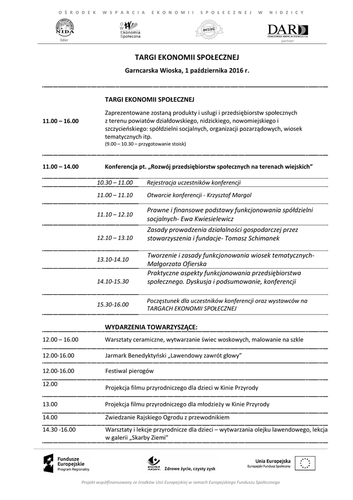 O Ś R O D E K W S P A R C I A E K O N O M I I S P O Ł E C Z N E J W N I D Z I C Y lider partner TARGI EKONOMII SPOŁECZNEJ Garncarska Wioska, 1 października 2016 r. TARGI EKONOMII SPOŁECZNEJ 11.00 – 16.00 Zaprezentowane zostaną produkty i usługi i przedsiębiorstw społecznych z terenu powiatów działdowskiego, nidzickiego, nowomiejskiego i szczycieńskiego: spółdzielni socjalnych, organizacji pozarządowych, wiosek tematycznych itp. (9.00 – 10.30 – przygotowanie stoisk) 11.00 – 14.00 Konferencja pt. „Rozwój przedsiębiorstw społecznych na terenach wiejskich” 10.30 – 11.00 Rejestracja uczestników konferencji 11.00 – 11.10 Otwarcie konferencji - Krzysztof Margol 11.10 – 12.10 Prawne i finansowe podstawy funkcjonowania spółdzielni socjalnych- Ewa Kwiesielewicz 12.10 – 13.10 13.10-14.10 14.10-15.30 15.30-16.00 Zasady prowadzenia działalności gospodarczej przez stowarzyszenia i fundacje- Tomasz Schimanek Tworzenie i zasady funkcjonowania wiosek tematycznychMałgorzata Ofierska Praktyczne aspekty funkcjonowania przedsiębiorstwa społecznego. Dyskusja i podsumowanie, konferencji Poczęstunek dla uczestników konferencji oraz wystawców na TARGACH EKONOMII SPOŁECZNEJ WYDARZENIA TOWARZYSZĄCE: 12.00 – 16.00 Warsztaty ceramiczne, wytwarzanie świec woskowych, malowanie na szkle 12.00-16.00 Jarmark Benedyktyński „Lawendowy zawrót głowy” 12.00-16.00 Festiwal pierogów 12.00 Projekcja filmu przyrodniczego dla dzieci w Kinie Przyrody 13.00 Projekcja filmu przyrodniczego dla młodzieży w Kinie Przyrody 14.00 Zwiedzanie Rajskiego Ogrodu z przewodnikiem 14.30 -16.00 Warsztaty i lekcje przyrodnicze dla dzieci – wytwarzania olejku lawendowego, lekcja w galerii „Skarby Ziemi” Projekt współfinansowany ze środków Unii Europejskiej w ramach Europejskiego Funduszu Społecznego