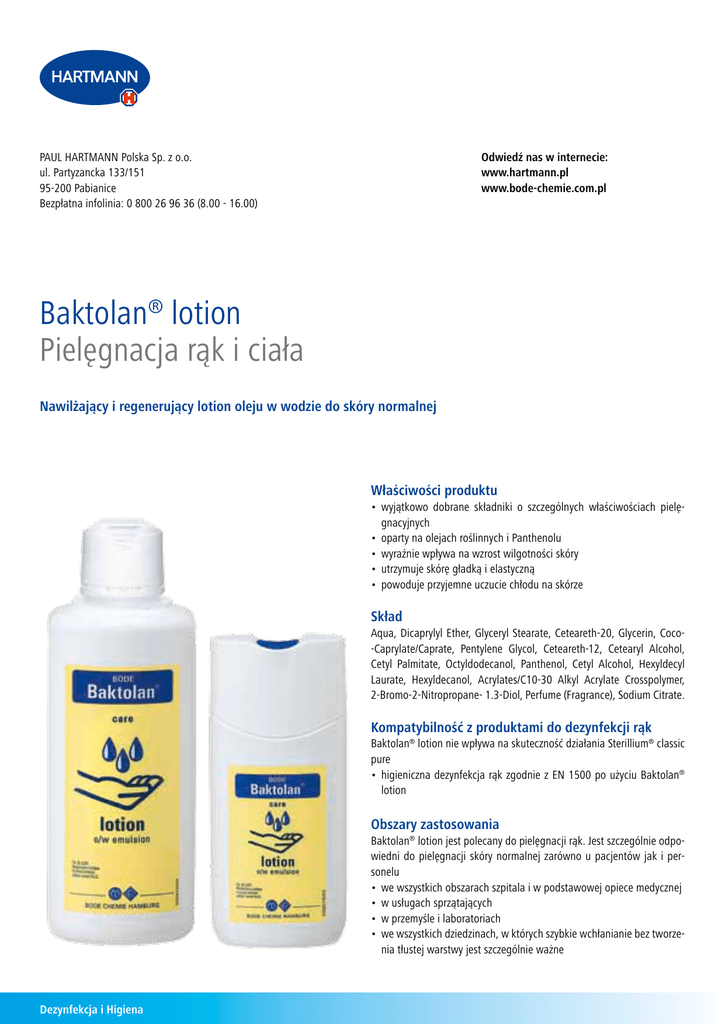 PAUL HARTMANN Polska Sp. z o.o. ul. Partyzancka 133/151 95-200 Pabianice Bezpłatna infolinia: 0 800 26 96 36 (8.00 - 16.00) Odwiedź nas w internecie: www.hartmann.pl www.bode-chemie.com.pl Baktolan® lotion Pielęgnacja rąk i ciała Nawilżający i regenerujący lotion oleju w wodzie do skóry normalnej Właściwości produktu • wyjątkowo dobrane składniki o szczególnych właściwościach pielęgnacyjnych • oparty na olejach roślinnych i Panthenolu • wyraźnie wpływa na wzrost wilgotności skóry • utrzymuje skórę gładką i elastyczną • powoduje przyjemne uczucie chłodu na skórze Skład Aqua, Dicaprylyl Ether, Glyceryl Stearate, Ceteareth-20, Glycerin, Coco-Caprylate/Caprate, Pentylene Glycol, Ceteareth-12, Cetearyl Alcohol, Cetyl Palmitate, Octyldodecanol, Panthenol, Cetyl Alcohol, Hexyldecyl Laurate, Hexyldecanol, Acrylates/C10-30 Alkyl Acrylate Crosspolymer, 2-Bromo-2-Nitropropane- 1.3-Diol, Perfume (Fragrance), Sodium Citrate. Kompatybilność z produktami do dezynfekcji rąk Baktolan® lotion nie wpływa na skuteczność działania Sterillium® classic pure • higieniczna dezynfekcja rąk zgodnie z EN 1500 po użyciu Baktolan® lotion Obszary zastosowania Baktolan® lotion jest polecany do pielęgnacji rąk. Jest szczególnie odpowiedni do pielęgnacji skóry normalnej zarówno u pacjentów jak i personelu • we wszystkich obszarach szpitala i w podstawowej opiece medycznej • w usługach sprzątających • w przemyśle i laboratoriach • we wszystkich dziedzinach, w których szybkie wchłanianie bez tworzenia tłustej warstwy jest szczególnie ważne Dezynfekcja i Higiena PAUL HARTMANN Polska Sp. z o.o. ul. Partyzancka 133/151 95-200 Pabianice Bezpłatna infolinia: 0 800 26 96 36 (8.00 - 16.00) Producent: BODE CHEMIE HAMBURG, 22525 Melanchthonstr. 27 Tel. +49 40 54006 – 111, fax - 777 Odwiedź nas w internecie: www.hartmann.pl www.bode-chemie.com.pl Sposób użycia i dawkowania Baktolan® lotion może być stosowany wielokrotnie w ciągu dnia. Dzięki doskonale dobranym składnikom m.in. olejom roślinnym, lotion posiada bardzo dobre właściwości pielęgnacyjne i charakteryzuje go ekonomiczne zastosowanie. Baktolan® lotion łatwo rozprowadza się na skórze i szybko wchłania, bez tworzenia uciążliwego, tłustego filmu. W celu higienicznej aplikacji poleca się pobieranie Baktolan® lotion przy użyciu dozownika lub pompki dozującej. Charakterystyka Baktolan® lotion, emulsja oleju w wodzie jest dostosowana do pH skóry. Podczas przygotowania lotionu, szczególną uwagę zwrócono na kompatybilność ze skórą i szybkie wchłanianie. Najwyższej jakości Panthenol wygładza i nawilża skórę oraz wspomaga jej regenerację. BODE pompa dozująca - dla butelek 350/500 ml BODE BODE półka ścienna dla butelek 350 ml BODE BODE dozownik Eurodispenser 1 - dla butelek 350/500 ml BODE dozownik Eurodispenser 2000 - dla butelek 350/500 ml BODE dozownik Eurodispenser 3000 – dla butelek 350/500 ml BODE dozownik Eurodispenser 1 plus – dla butelek 350/500 ml BODE dozownik Eurodispenser basic – dla butelek 350/500 ml Postać handlowa Jednostka miary Numer artykułu Opakowanie zbiorcze 100 ml 980170 24 butelka 350 ml 980171 20 butelka 500 ml 980172 20 Nr art. 859419 butelka Dezynfekcja i Higiena