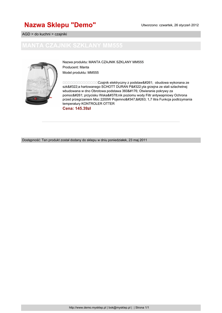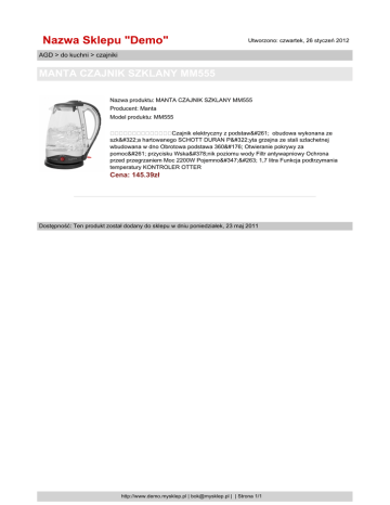 Nazwa Sklepu "Demo" Utworzono: czwartek, 26 styczeń 2012 AGD > do kuchni > czajniki MANTA CZAJNIK SZKLANY MM555 Nazwa produktu: MANTA CZAJNIK SZKLANY MM555 Producent: Manta Model produktu: MM555 Czajnik elektryczny z podstawą obudowa wykonana ze szkła hartowanego SCHOTT DURAN Płyta grzejna ze stali szlachetnej wbudowana w dno Obrotowa podstawa 360° Otwieranie pokrywy za pomocą przycisku Wskaźnik poziomu wody Filtr antywapniowy Ochrona przed przegrzaniem Moc 2200W Pojemność 1,7 litra Funkcja podtrzymania temperatury KONTROLER OTTER Cena: 145.39zł Dostępność: Ten produkt został dodany do sklepu w dniu poniedziałek, 23 maj 2011 http://www.demo.mysklep.pl | [email protected] | | Strona 1/1