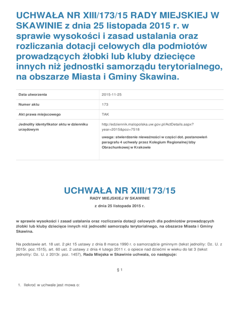 UCHWAŁA NR XIII/173/15 RADY MIEJSKIEJ W SKAWINIE z dnia 25 listopada 2015 r. w sprawie wysokości i zasad ustalania oraz rozliczania dotacji celowych dla podmiotów prowadzących żłobki lub kluby dziecięce innych niż jednostki samorządu terytorialnego, na obszarze Miasta i Gminy Skawina. Data utworzenia 2015-11-25 Numer aktu 173 Akt prawa miejscowego TAK Jednolity identyfikator aktu w dzienniku urzędowym http://edziennik.malopolska.uw.gov.pl/ActDetails.aspx? year=2015&poz=7518 uwaga: stwierdzenie nieważności w części dot. postanowień paragrafu 4 uchwały przez Kolegium Regionalnej Izby Obrachunkowej w Krakowie UCHWAŁA NR XIII/173/15 RADY MIEJSKIEJ W SKAWINIE z dnia 25 listopada 2015 r. w sprawie wysokości i zasad ustalania oraz rozliczania dotacji celowych dla podmiotów prowadzących żłobki lub kluby dziecięce innych niż jednostki samorządu terytorialnego, na obszarze Miasta i Gminy Skawina. Na podstawie art. 18 ust. 2 pkt 15 ustawy z dnia 8 marca 1990 r. o samorządzie gminnym (tekst jednolity: Dz. U. z 2015r. poz.1515), art. 60 ust. 2 ustawy z dnia 4 lutego 2011 r. o opiece nad dziećmi w wieku do lat 3 (tekst jednolity: Dz. U. z 2013r. poz. 1457), Rada Miejska w Skawinie uchwala, co następuje: §1 1. Ilekroć w uchwale jest mowa o: 1) podmiocie prowadzącym żłobek – należy przez to rozumieć osobę fizyczną, osobę prawną lub jednostkę organizacyjną nie posiadającą osobowości prawnej prowadzącą na terenie Miasta i Gminy Skawina żłobek, zapewniającą opiekę nad każdym dzieckiem w minimalnym wymiarze 8 godzin dziennie, wpisaną do rejestru żłobków i klubów dziecięcych prowadzonego przez Burmistrza Miasta i Gminy Skawina, 2) podmiocie prowadzącym klub dziecięcy – należy przez to rozumieć osobę fizyczną, osobę prawną lub jednostkę organizacyjną nie posiadającą osobowości prawnej prowadzącą na terenie Miasta i Gminy Skawina klub dziecięcy, zapewniającą opiekę nad każdym dzieckiem w minimalnym wymiarze 5 godzin dziennie, wpisaną do rejestru żłobków i klubów dziecięcych prowadzonego przez Burmistrza Miasta i Gminy Skawina, 3) dziecku objętym opieką żłobkową – należy przez to rozumieć dziecko w wieku do lat 3, korzystające z opieki żłobka, 4) dziecku objętym opieką klubu dziecięcego – należy przez to rozumieć dziecko w wieku do lat 3, korzystające z opieki klubu dziecięcego, §2 1. Ustala się jednostkową dotację celową udzielaną przez Gminę Skawina dla podmiotów prowadzących żłobki lub kluby dziecięce na dofinansowanie pobytu każdego dziecka w żłobku lub klubie dziecięcym w wysokości: 1) 300 zł na każde dziecko objęte opieką w żłobku z przeznaczeniem na zapewnienie dziecku opieki oraz prowadzenie zajęć edukacyjnych, 2) 200 zł na każde dziecko objęte opieką w klubie dziecięcym z przeznaczeniem na zapewnienie dziecku opieki oraz prowadzenie zajęć edukacyjnych. 1. O dotację celową mogą ubiegać się podmioty prowadzące żłobki lub kluby dziecięce znajdujące się na terenie Miasta i Gminy Skawina. 1. Dotacja może być przeznaczona na dofinansowanie wydatków bieżących związanych z zapewnieniem opieki nad dziećmi w warunkach bytowych zbliżonych do warunków domowych w tym: gry i zabawy stymulujące rozwój dziecka, rytmika, nauka w formie zabawy, zajęcia manualno – plastyczne. §3 1. Podmioty prowadzące żłobki i kluby dziecięce mogą ubiegać się o dotację, o której mowa w § 2 składając wniosek do Burmistrza Miasta i Gminy Skawina według wzoru stanowiącego załącznik nr 1 do niniejszej uchwały. 1. Przyjmuje się następujące zasady udzielania dotacji: 1) dotacja dla żłobka lub klubu dziecięcego zostanie udzielona pod warunkiem, że podmiot prowadzący żłobek lub klub dziecięcy złoży w terminie do 15 dnia każdego miesiąca do Burmistrza Miasta i Gminy Skawina informację według wzoru stanowiącego załącznik nr 2 do niniejszej uchwały, 2) dotacja, o której mowa w § 2, będzie przekazywana w miesięcznych transzach płatnych z dołu. 1. Ustala się następujące zasady rocznego rozliczania dotacji: 1) podmiot otrzymujący dotację zobowiązany jest złożyć do 15 stycznia następnego roku w formie sprawozdania merytoryczno – finansowego roczne rozliczenie z wykorzystania otrzymanej dotacji, według wzoru stanowiącego załącznik nr 3 do niniejszej uchwały, 2) podmiot prowadzący żłobek lub klub dziecięcy, który zakończył działalność w trakcie roku zobowiązany jest złożyć sprawozdanie o którym mowa w pkt 1, w terminie 30 dni od otrzymania ostatniej transzy miesięcznej dotacji. 1. Dotacja udzielona podmiotowi, która została: a) nie wykorzystana, b) wykorzystana niezgodnie z przeznaczeniem, c) pobrana nienależnie lub w nadmiernej wysokości podlega zwrotowi do budżetu organu dotującego – Gminy, zgodnie z ustawą o finansach publicznych. 1. Od dotacji zwróconych po terminie, o którym mowa w ust. 3 naliczane będą odsetki zgodnie z ustawą o finansach publicznych. 1. O dotacje na kolejny rok mogą ubiegać się podmioty, które w terminie złożą sprawozdanie o którym mowa w § 3 ust. 3 pkt 1. § 4* (stwierdzenie nieważności) Organowi dotującemu przysługuje prawo kontroli faktycznej liczby dzieci w dotowanej jednostce i prawidłowości wykorzystania dotacji. §5 Wykonanie uchwały powierza się Burmistrzowi Miasta i Gminy Skawina. §6 Uchwała wchodzi w życie po upływie 14 dni od jej ogłoszenia w Dzienniku Urzędowym Województwa Małopolskiego z mocą od 1 stycznia 2016r. Wiceprzewodnicząca Rady Miejskiej mgr Ewa MASŁOWSKA *) Kolegium Regionalnej Izby Obrachunkowej w Krakowie orzekło o stwierdzeniu nieważności Uchwały Nr XIII/173/15 w części dotyczącej postanowień § 4 uchwały (uchwała NR KI-411/3/16 Kolegium Regionalnej Izby Obrachunkowej w Krakowie z dnia 13 stycznia 2016 r. ) Załączniki Zal.nr 1do uchw.173.doc Data: 2015-11-27 10:48:13 Rozmiar: 52k Zal. nr 2 do uchw.173.doc Data: 2