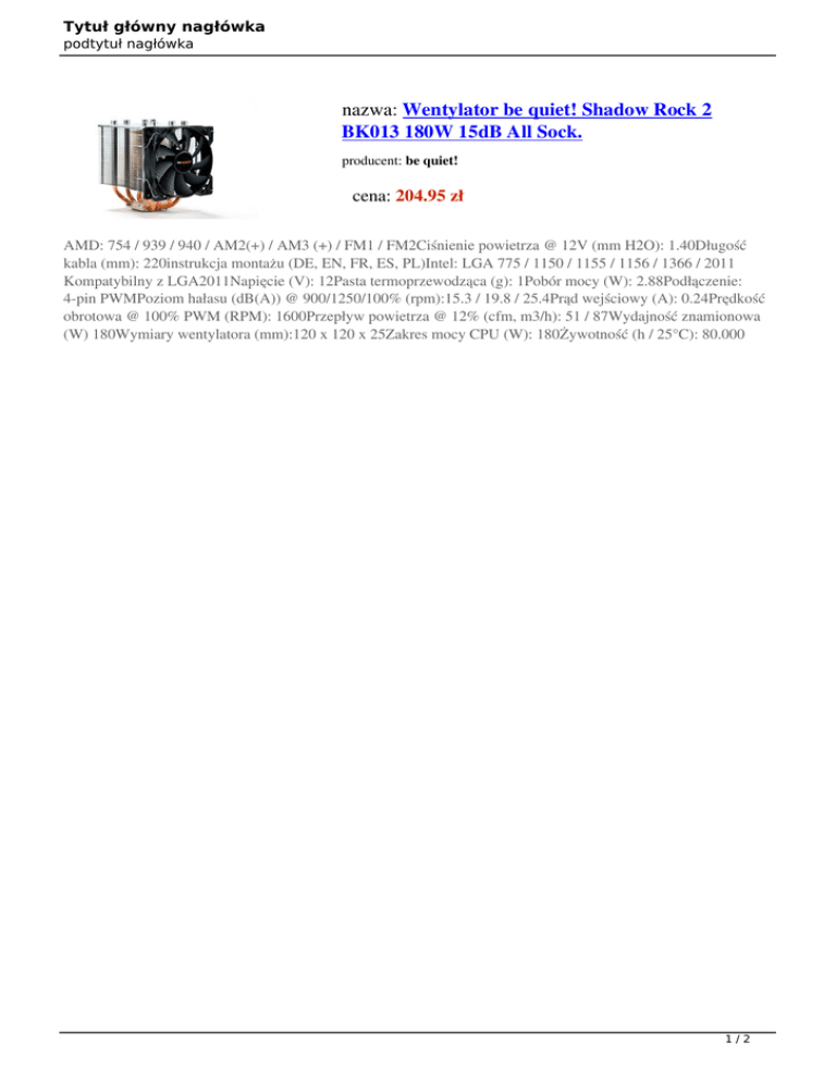Tytuł główny nagłówka podtytuł nagłówka nazwa: Wentylator be quiet! Shadow Rock 2 BK013 180W 15dB All Sock. producent: be quiet! cena: 204.95 zł AMD: 754 / 939 / 940 / AM2(+) / AM3 (+) / FM1 / FM2Ciśnienie powietrza @ 12V (mm H2O): 1.40Długość kabla (mm): 220instrukcja montażu (DE, EN, FR, ES, PL)Intel: LGA 775 / 1150 / 1155 / 1156 / 1366 / 2011 Kompatybilny z LGA2011Napięcie (V): 12Pasta termoprzewodząca (g): 1Pobór mocy (W): 2.88Podłączenie: 4-pin PWMPoziom hałasu (dB(A)) @ 900/1250/100% (rpm):15.3 / 19.8 / 25.4Prąd wejściowy (A): 0.24Prędkość obrotowa @ 100% PWM (RPM): 1600Przepływ powietrza @ 12% (cfm, m3/h): 51 / 87Wydajność znamionowa (W) 180Wymiary wentylatora (mm):120 x 120 x 25Zakres mocy CPU (W): 180Żywotność (h / 25°C): 80.000 1/2 Tytuł główny nagłówka podtytuł nagłówka Producent Nazwa typu Strona o towarze nazwa Opis ogólny Poziom hałasu Opakowanie Wymiary [G x S x W] (mm) Okres rękojmi w miesiącach wartość be quiet! Wentylatory http://www.bequiet.com/volumes/PDM/_pr oducts/bk013/bk013_db_pl.pdf Wentylator be quiet! Shadow Rock 2 BK013 180W 15dB All Sock. 25.4 dB(A) BOX 122 x 147 x 160 36 2/2
