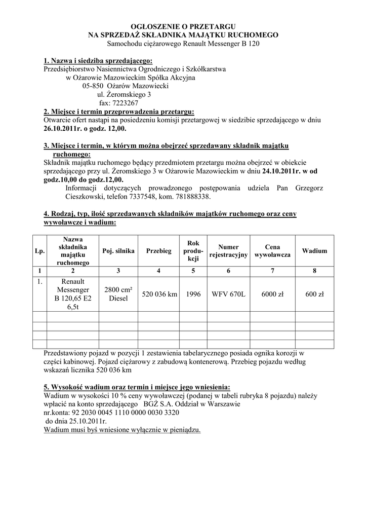 OGŁOSZENIE O PRZETARGU NA SPRZEDAŻ SKŁADNIKA MAJĄTKU RUCHOMEGO Samochodu ciężarowego Renault Messenger B 120 1. Nazwa i siedziba sprzedającego: Przedsiębiorstwo Nasiennictwa Ogrodniczego i Szkółkarstwa w Ożarowie Mazowieckim Spółka Akcyjna 05-850 Ożarów Mazowiecki ul. Żeromskiego 3 fax: 7223267 2. Miejsce i termin przeprowadzenia przetargu: Otwarcie ofert nastąpi na posiedzeniu komisji przetargowej w siedzibie sprzedającego w dniu 26.10.2011r. o godz. 12,00. 3. Miejsce i termin, w którym można obejrzeć sprzedawany składnik majątku ruchomego: Składnik majątku ruchomego będący przedmiotem przetargu można obejrzeć w obiekcie sprzedającego przy ul. Żeromskiego 3 w Ożarowie Mazowieckim w dniu 24.10.2011r. w od godz.10,00 do godz.12,00. Informacji dotyczących prowadzonego postępowania udziela Pan Grzegorz Cieszkowski, telefon 7337548, kom. 781888338. 4. Rodzaj, typ, ilość sprzedawanych składników majątków ruchomego oraz ceny wywoławcze i wadium: Lp. 1 1. Nazwa składnika majątku ruchomego 2 Renault Messenger B 120,65 E2 6,5t Rok Numer Cena produrejestracyjny wywoławcza kcji Poj. silnika Przebieg Wadium 3 4 5 6 7 8 2800 cm² Diesel 520 036 km 1996 WFV 670L 6000 zł 600 zł Przedstawiony pojazd w pozycji 1 zestawienia tabelarycznego posiada ognika korozji w części kabinowej. Pojazd ciężarowy z zabudową kontenerową. Przebieg pojazdu według wskazań licznika 520 036 km 5. Wysokość wadium oraz termin i miejsce jego wniesienia: Wadium w wysokości 10 % ceny wywoławczej (podanej w tabeli rubryka 8 pojazdu) należy wpłacić na konto sprzedającego BGŻ S.A. Oddział w Warszawie nr.konta: 92 2030 0045 1110 0000 0030 3320 do dnia 25.10.2011r. Wadium musi byś wniesione wyłącznie w pieniądzu. 6. a) Wymagania jakimi powinna odpowiadać oferta w prowadzonym przetargu: Oferta pod rygorem nieważności powinna być sporządzona w formie pisemnej i powinna zawierać: - imię i nazwisko, dokładny adres i telefon kontaktowy lub nazwę (firmę) i adres siedziby oferenta, telefon, fax, - oferowaną cenę za składnik majątku ruchomego (nie mniejszą niż cena wywoławcza) objętego przedmiotem przetargu i warunki jego zapłaty, - oświadczenie oferenta, że zapoznał się ze stanem przedmiotu przetargu, - dowód wniesienia obowiązującego wadium. b) Termin, miejsce i tryb złożenia oferty za okres, w którym oferta jest wiążąca: Ofertę należy złożyć w zamkniętej kopercie. Koperta musi być zaadresowana wg poniższego wzoru: Przedsiębiorstwo Nasiennictwa Ogrodniczego i Szkółkarstwa w Ożarowie Mazowieckim Spółka Akcyjna 05-850 Ożarów Mazowiecki ul. Żeromskiego 3 Na kopercie powinien znajdować się napis: “Oferta w przetargu na sprzedaż pojazdu Renault Messenger”. Oferty pisemne należy składać w dni robocze (bez sobót) w godz.9,00 – 14,00 nie później niż do dnia 25.10.2011r. do godz. 11,00 w sekretariacie siedziby sprzedającego pok 209 (IIpiętr) przy ul. Żeromskiego 3 . Oferta jest wiążąca w okresie 14 dni. c) Organizatorowi przetargu przysługuje prawo zamknięcia przetargu bez wybrania którejkolwiek z ofert 7. Inne informacje: Komisja przetargowa wybierze oferenta, który zaoferuje najwyższą cenę na wybrany składnik majątku ruchomego objęty przedmiotem przetargu spośród ofert uznanych za ważne. a) Warunkiem przystąpienia do przetargu jest wniesienie wadium dla składnika majątku ruchomego. Wadium musi byś wniesione wyłącznie w pieniądzu. Wadium wniesione przez oferenta zostanie zaliczone na poczet ceny nabycia. Wadium złożone przez oferentów, których oferty nie zostaną wybrane lub zostaną odrzucone, zostanie zwrócone niezwłocznie po dokonaniu wyboru oferty. Wadium nie podlega zwrotowi w przypadku, gdy: - żaden z uczestników aukcji lub przetargu nie zaoferuje co najmniej ceny wywoławczej - uczestnik przetargu, który wygrał przetarg, uchyli się od zawarcia umowy b) Nabywca jest zobowiązany zapłacić cenę nabycia niezwłocznie po wybraniu oferty zawierającej najwyższą cenę, bądź w terminie wyznaczonym przez jednostkę prowadzącą przetarg, nie dłuższym niż 7 dni. c) Wydanie przedmiotu sprzedaży nabywcy następuje niezwłocznie po zapłaceniu ceny nabycia. ZARZĄD PNOS