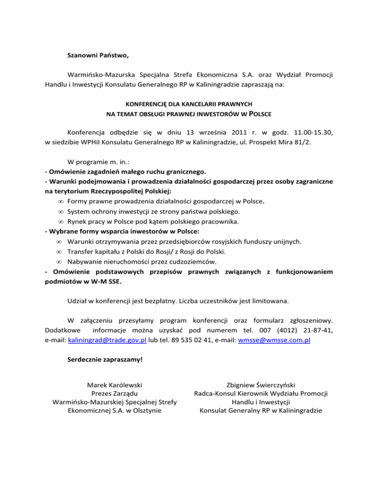 Szanowni Państwo, Warmińsko-Mazurska Specjalna Strefa Ekonomiczna S.A. oraz Wydział Promocji Handlu i Inwestycji Konsulatu Generalnego RP w Kaliningradzie zapraszają na: KONFERENCJĘ DLA KANCELARII PRAWNYCH NA TEMAT OBSŁUGI PRAWNEJ INWESTORÓW W POLSCE Konferencja odbędzie się w dniu 13 września 2011 r. w godz. 11.00-15.30, w siedzibie WPHiI Konsulatu Generalnego RP w Kaliningradzie, ul. Prospekt Mira 81/2. W programie m. in.: - Omówienie zagadnień małego ruchu granicznego. - Warunki podejmowania i prowadzenia działalności gospodarczej przez osoby zagraniczne na terytorium Rzeczypospolitej Polskiej: • Formy prawne prowadzenia działalności gospodarczej w Polsce. • System ochrony inwestycji ze strony państwa polskiego. • Rynek pracy w Polsce pod kątem polskiego pracownika. - Wybrane formy wsparcia inwestorów w Polsce: • Warunki otrzymywania przez przedsiębiorców rosyjskich funduszy unijnych. • Transfer kapitału z Polski do Rosji/ z Rosji do Polski. • Nabywanie nieruchomości przez cudzoziemców. - Omówienie podstawowych przepisów prawnych związanych z funkcjonowaniem podmiotów w W-M SSE. Udział w konferencji jest bezpłatny. Liczba uczestników jest limitowana. W załączeniu przesyłamy program konferencji oraz formularz zgłoszeniowy. Dodatkowe informacje można uzyskać pod numerem tel. 007 (4012) 21-87-41, e-mail: [email protected] lub tel. 89 535 02 41, e-mail: [email protected] Serdecznie zapraszamy! Marek Karólewski Prezes Zarządu Warmińsko-Mazurskiej Specjalnej Strefy Ekonomicznej S.A. w Olsztynie Zbigniew Świerczyński Radca-Konsul Kierownik Wydziału Promocji Handlu i Inwestycji Konsulat Generalny RP w Kaliningradzie „GRONO INWESTORÓW WARMIŃSKO-MAZURSKIEJ SPECJALNEJ STREFY EKONOMICZNEJ” – KONFERENCJA DLA KANCELARII PRAWNYCH NA TEMAT OBSŁUGI PRAWNEJ INWESTORÓW W POLSCE TERMIN: 13 września 2011 r. MIEJSCE: siedziba WPHiI Konsulatu Generalnego RP w Kaliningradzie, ul. Prospekt Mira 81/2. PROGRAM: od godz. 10.45 Rejestracja uczestników (kawa, herbata). godz. 11.00 - 11.15 Słowo wstępne m.in. na temat : małego ruchu granicznego - Pan Zbigniew Świerczyński Radca-Konsul Kierownik Wydziału Promocji Handlu i Inwestycji Konsulatu Generalnego RP w Kaliningradzie. godz. 11.15 - 11.20 Otwarcie konferencji - Pan Marek Karólewski Prezes Zarządu WarmińskoMazurskiej Specjalnej Strefy Ekonomicznej S.A. w Olsztynie. godz. 11.20 - 12.15 Omówienie podstawowych przepisów prawnych związanych z funkcjonowaniem podmiotów w Warmińsko-Mazurskiej Specjalnej Strefie Ekonomicznej (list intencyjny, biznes plan, SIWR, SIWP, zezwolenie strefowe, sprawozdawczość i kontrola W-M SSE) - Pan Jerzy Siwkiewicz Wiceprezes Zarządu Warmińsko-Mazurskiej Specjalnej Strefy Ekonomicznej S.A. w Olsztynie. godz. 12.15 - 13.45 Warunki podejmowania i prowadzenia działalności gospodarczej przez osoby zagraniczne na terytorium Rzeczypospolitej Polskiej: - Formy prawne prowadzenia działalności gospodarczej w Polsce - Pani Anna Werbiańska Kancelaria Adwokacka Obwodu Kaliningradzkiego. - System ochrony inwestycji ze strony państwa polskiego - Pan Lech Obara Kancelaria Radców Prawnych „Lech Obara i Współpracownicy”. - Rynek pracy w Polsce pod kątem polskiego pracownika - Pan Lech Obara Kancelaria Radców Prawnych „Lech Obara i Współpracownicy”. godz. 13.45 - 14.00 Przerwa kawowa. godz. 14.00 - 15.30 Wybrane formy wsparcia inwestorów w Polsce: - Warunki otrzymywania przez przedsiębiorców rosyjskich funduszy unijnych - Pani Anna Werbiańska Kancelaria Adwokacka Obwodu Kaliningradzkiego. - Transfer kapitału z Polski do Rosji/ z Rosji do Polski - Pan Lech Obara Kancelaria Radców Prawnych „Lech Obara i Współpracownicy” oraz Pan Jerzy Siwkiewicz Wiceprezes Zarządu Warmińsko-Mazurskiej Specjalnej Strefy Ekonomicznej S.A. w Olsztynie. - Nabywanie nieruchomości przez cudzoziemców - Pan Lech Obara Kancelaria Radców Prawnych „Lech Obara i Współpracownicy”. ORGANIZATORZY: Wydział Promocji Handlu i Inwestycji PARTNERZY: Kancelaria Radców Prawnych „Lech Obara i Współpracownicy” Kancelaria Adwokacka Obwodu Kaliningradzkiego Anny Werbiańskiej PATRONAT HONOROWY: Wojewoda Warmińsko-Mazurski