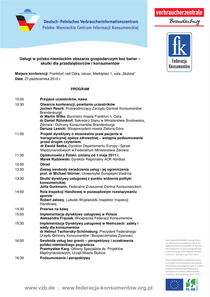 verbraucherzentrale Usługi w polsko-niemieckim obszarze gospodarczym bez barier – skutki dla przedsiębiorców i konsumentów Federacja Konsumentów Miejsce konferencji: Frankfurt nad Odrą, ratusz, Marktplatz 1, sala „Słubice” Data: 27 października 2010 r. PROGRAM 10:00 10:30 11:00 11:30 12:00 13:00 13:30 14:00 14:30 15:00 15:30 16:00 16:30 Przyjazd uczestników, kawa Otwarcie konferencji, powitanie uczestników Jochen Resch, Przewodniczący Zarządu Centrali Konsumentów Brandenburgii dr Martin Wilke, Burmistrz miasta Frankfurt n. Odrą dr Daniel Rühmkorf, Sekretarz Stanu w Ministerstwie Środowiska, Zdrowia i Ochrony Konsumentów Brandenburgii Dariusz Lesicki, Wiceprezydent miasta Zielona Góra Projekt dyrektywy o stosowaniu praw pacjenta w transgranicznej opiece zdrowotnej – wstępne podsumowanie przed drugim czytaniem dr Ewold Seeba, Dyrektor Departamentu Europy i Spraw Międzynarodowych w Federalnym Ministerstwie Zdrowia Opiekunowie z Polski: zmiany od 1 maja 2011 r. Marek Rydzewski, Dyrektor Regionalny AOK Nordost Obiad Zasięg swobody świadczenia usług i jej ograniczenia prof. dr Michael Stürner, Uniwersytet Europejski Viadrina Skutki dyrektywy usługowej z punktu widzenia polityki konsumenckiej Jutta Gurkmann, Federalne Zrzeszenie Central Konsumenckich Rola Inspekcji Handlowej w pozasądowym rozwiązywaniu sporów Robert Jałowy, Lubuski Wojewódzki Inspektor Inspekcji Handlowej Przerwa na kawę Implementacja dyrektywy usługowej w Polsce Aleksandra Frączek, Wiceprezes Federacji Konsumentów Implementacja Dyrektywy usługowej w Niemczech: zalety i wady dla konsumentów dr Helmut Tschiersky-Schöneburg, Prezydent Federalnego Urzędu Ochrony Konsumentów i Bezpieczeństwa Żywności Swoboda usług bez granic – perspektywy i oczekiwania polsko-niemieckiego pogranicza Przemysław Karg, Główny Specjalista ds. Projektów Międzynarodowych, Urząd Miasta Słubice Podsumowanie i perspektywy www.vzb.de | www.federacja-konsumentow.org.pl Das Projekt KONSUMENT wird gefördert aus Mitteln des Europäischen Fonds für Regionale Entwicklung (EFRE) im Rahmen des Programms zur grenzübergreifenden Zusammenarbeit Polen (Wojewodschaft Lubuskie) - Brandenburg 2007–2013 Projekt KONSUMENT współfinansowany ze środków Unii Europejskiej (Europejski Fundusz Rozwoju Regionalnego) w ramach Programu Operacyjnego Współpracy Transgranicznej Polska (Województwo Lubuskie) - Brandenburgia 2007–2013