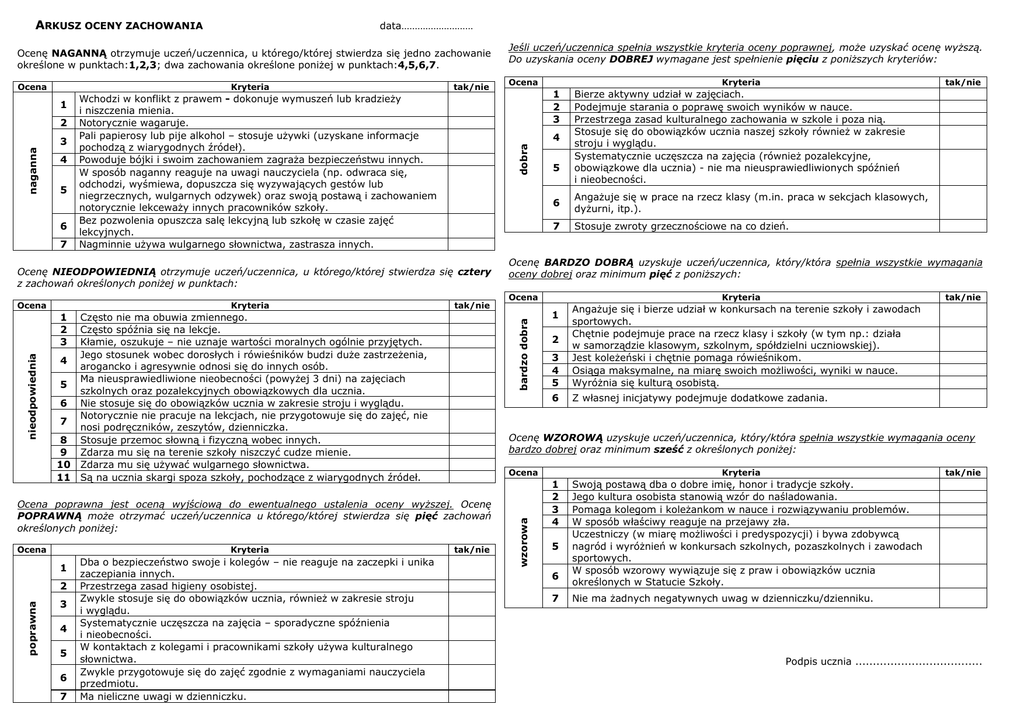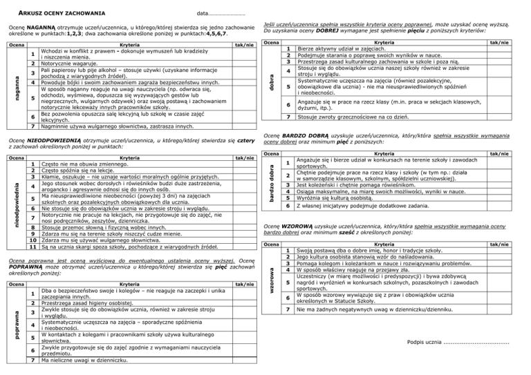 ARKUSZ OCENY ZACHOWANIA data……………………… Ocenę NAGANNĄ otrzymuje uczeń/uczennica, u którego/której stwierdza się jedno zachowanie określone w punktach:1,2,3; dwa zachowania określone poniżej w punktach:4,5,6,7. Kryteria 2 naganna 3 4 5 6 7 Wchodzi w konflikt z prawem - dokonuje wymuszeń lub kradzieży i niszczenia mienia. Notorycznie wagaruje. Pali papierosy lub pije alkohol – stosuje używki (uzyskane informacje pochodzą z wiarygodnych źródeł). Powoduje bójki i swoim zachowaniem zagraża bezpieczeństwu innych. W sposób naganny reaguje na uwagi nauczyciela (np. odwraca się, odchodzi, wyśmiewa, dopuszcza się wyzywających gestów lub niegrzecznych, wulgarnych odzywek) oraz swoją postawą i zachowaniem notorycznie lekceważy innych pracowników szkoły. Bez pozwolenia opuszcza salę lekcyjną lub szkołę w czasie zajęć lekcyjnych. Nagminnie używa wulgarnego słownictwa, zastrasza innych. Kryteria tak/nie Często nie ma obuwia zmiennego. Często spóźnia się na lekcje. Kłamie, oszukuje – nie uznaje wartości moralnych ogólnie przyjętych. Jego stosunek wobec dorosłych i rówieśników budzi duże zastrzeżenia, 4 arogancko i agresywnie odnosi się do innych osób. Ma nieusprawiedliwione nieobecności (powyżej 3 dni) na zajęciach 5 szkolnych oraz pozalekcyjnych obowiązkowych dla ucznia. 6 Nie stosuje się do obowiązków ucznia w zakresie stroju i wyglądu. Notorycznie nie pracuje na lekcjach, nie przygotowuje się do zajęć, nie 7 nosi podręczników, zeszytów, dzienniczka. 8 Stosuje przemoc słowną i fizyczną wobec innych. 9 Zdarza mu się na terenie szkoły niszczyć cudze mienie. 10 Zdarza mu się używać wulgarnego słownictwa. 11 Są na ucznia skargi spoza szkoły, pochodzące z wiarygodnych źródeł. 1 poprawna 2 3 4 5 6 7 Dba o bezpieczeństwo swoje i kolegów – nie reaguje na zaczepki i unika zaczepiania innych. Przestrzega zasad higieny osobistej. Zwykle stosuje się do obowiązków ucznia, również w zakresie stroju i wyglądu. Systematycznie uczęszcza na zajęcia – sporadyczne spóźnienia i nieobecności. W kontaktach z kolegami i pracownikami szkoły używa kulturalnego słownictwa. Zwykle przygotowuje się do zajęć zgodnie z wymaganiami nauczyciela przedmiotu. Ma nieliczne uwagi w dzienniczku. 6 Angażuje się w prace na rzecz klasy (m.in. praca w sekcjach klasowych, dyżurni, itp.). 7 Stosuje zwroty grzecznościowe na co dzień. Ocena Kryteria tak/nie 3 4 5 Angażuje się i bierze udział w konkursach na terenie szkoły i zawodach sportowych. Chętnie podejmuje prace na rzecz klasy i szkoły (w tym np.: działa w samorządzie klasowym, szkolnym, spółdzielni uczniowskiej). Jest koleżeński i chętnie pomaga rówieśnikom. Osiąga maksymalne, na miarę swoich możliwości, wyniki w nauce. Wyróżnia się kulturą osobistą. 6 Z własnej inicjatywy podejmuje dodatkowe zadania. 1 2 Ocenę WZOROWĄ uzyskuje uczeń/uczennica, który/która spełnia wszystkie wymagania oceny bardzo dobrej oraz minimum sześć z określonych poniżej: Ocena Ocena poprawna jest oceną wyjściową do ewentualnego ustalenia oceny wyższej. Ocenę POPRAWNĄ może otrzymać uczeń/uczennica u którego/której stwierdza się pięć zachowań określonych poniżej: Kryteria 5 tak/nie Bierze aktywny udział w zajęciach. Podejmuje starania o poprawę swoich wyników w nauce. Przestrzega zasad kulturalnego zachowania w szkole i poza nią. Stosuje się do obowiązków ucznia naszej szkoły również w zakresie stroju i wyglądu. Systematycznie uczęszcza na zajęcia (również pozalekcyjne, obowiązkowe dla ucznia) - nie ma nieusprawiedliwionych spóźnień i nieobecności. Ocenę BARDZO DOBRĄ uzyskuje uczeń/uczennica, który/która spełnia wszystkie wymagania oceny dobrej oraz minimum pięć z poniższych: bardzo dobra nieodpowiednia 1 2 3 Ocena Kryteria 1 2 3 4 Ocenę NIEODPOWIEDNIĄ otrzymuje uczeń/uczennica, u którego/której stwierdza się cztery z zachowań określonych poniżej w punktach: Ocena Ocena dobra 1 tak/nie tak/nie wzorowa Ocena Jeśli uczeń/uczennica spełnia wszystkie kryteria oceny poprawnej, może uzyskać ocenę wyższą. Do uzyskania oceny DOBREJ wymagane jest spełnienie pięciu z poniższych kryteriów: Kryteria 1 2 3 4 5 6 7 tak/nie Swoją postawą dba o dobre imię, honor i tradycje szkoły. Jego kultura osobista stanowią wzór do naśladowania. Pomaga kolegom i koleżankom w nauce i rozwiązywaniu problemów. W sposób właściwy reaguje na przejawy zła. Uczestniczy (w miarę możliwości i predyspozycji) i bywa zdobywcą nagród i wyróżnień w konkursach szkolnych, pozaszkolnych i zawodach sportowych. W sposób wzorowy wywiązuje się z praw i obowiązków ucznia określonych w Statucie Szkoły. Nie ma żadnych negatywnych uwag w dzienniczku/dzienniku. Podpis ucznia ....................................