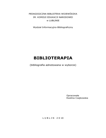 PEDAGOGICZNA BIBLIOTEKA WOJEWÓDZKA IM. KOMISJI EDUKACJI NARODOWEJ w LUBLINIE Wydział Informacyjno-Bibliograficzny BIBLIOTERAPIA (bibliografia adnotowana w wyborze) Opracowała Ewelina Czajkowska LUBLIN 2 0 10 1. Bajka w twórczym rozwoju i arteterapii / Olga Handford, Wiesław Karolak. - Łódź : Wydaw. Wyższej Szkoły Humanistyczno-Ekonomicznej, 2007. 156 s. Książka składa się z dwóch części: część pierwsza to wstęp – rozważania teoretyczne na temat bajki, myślenia twórczego oraz form i sposobów zapisu procesu myślowego w postaci książkowej. Część druga składa się z zestawu ćwiczeń wraz z dokumentacją z ich realizacji. Ćwiczenia znajdujące się w książce przeznaczone są dla dzieci, młodzieży i osób dorosłych. W każdym ćwiczeniu podany jest cel, precyzyjne polecenie, opis przebiegu realizacji, potrzebne materiały. Pozycja jest ofertą dla nauczycieli, metodyków, arteterapeutów, ale również dla studentów wielu specjalności pedagogicznych, edukacji artystycznej i arteterapii. 2. Bajki, które leczą. Cz. 1 / Doris Brett. - Wyd. 2. - Gdańsk : Gdańskie Wydaw. Psychologiczne, 2002. - 234 s. Doris Brett pokazuje, w jaki sposób zastosować metodę, która nie tylko rozwiązuje problemy dziecka (pójście do przedszkola, koszmary nocne, lęk przed zwierzętami, czy też inne trudności), ale też umacnia więź pomiędzy nim a jego rodzicami. Do nich właśnie adresowana jest ta książka (choć jej lekturę można polecić wszystkim osobom, które pracują z dziećmi). Każde z opowiadań zawartych w książce można przekształcić i dostosować do potrzeb własnego dziecka. 3. Bajki, które leczą. Cz. 2 / Doris Brett. - Wyd. 2. - Gdańsk : Gdańskie Wydaw. Psychologiczne, 2002. - 218 s. To kontynuacja książki "Bajki, które leczą. Cz. 1". Książka skierowana jest do rodziców, którzy chcą pomóc swoim dzieciom w rozwiązywaniu nurtujących je problemów. Autorka przedstawia w niej opowiadania dotyczące m.in. lęku przed ciemnością, moczenia nocnego, nieśmiałości – które same w sobie stanowią prostą, skuteczną, a co najważniejsze, domową technikę terapii dzieci. Terapeutami są w tym wypadku rodzice, którzy mogą nie tylko przeczytać swoim pociechom przykładowe opowiadanie, lecz również na podstawie książki nauczyć się zasad tej techniki terapeutycznej, dostosowywania jej do potrzeb własnego dziecka, a wreszcie – samodzielnego opowiadania historii. 4. Biblioterapia : teksty terapeutyczne, konspekty i scenariusze zajęć / Irena Borecka. - Gorzów Wielkopolski : Wojewódzki Ośrodek Metodyczny, 2002. - 88 s. Publikacja składa się z dwóch części. Pierwsza teoretyczna dotyczy biblioterapii - jej celów i zadań, zastosowania, postępowania biblioterapeutycznego oraz programów biblioterapeutycznych. W drugiej części zamieszczone zostały teksty biblioterapeutyczne i scenariusze zajęć, które pochodzą z warsztatu biblioterapeutycznego autorki. 5. Biblioterapia : teoria i praktyka : poradnik / Irena Borecka. - Warszawa : Wydaw. Stowarzyszenia Bibliotekarzy Polskich, 2001. - 143 s. Niniejsza propozycja to kilka wybranych zagadnień dotyczących teorii i praktyki biblioterapeutycznej. Autorka przybliża w niej najbardziej znane poglądy na temat biblioterapii. Książka podzielona jest na trzy części. Część pierwsza – „Teoretyczne podstawy biblioterapii” jest wprowadzeniem w zagadnienia metodyczne. Część druga poradnika – „Biblioterapia w praktyce”, zawiera szczegółowy opis kilku modeli postępowania biblioterapeutycznego i ich zastosowania. Ostatnią część stanowią „Aneksy”. Znajdziemy tam przykładową bibliografię, narzędzia diagnostyczne, kwestionariusze, programy biblioterapeutyczne, scenariusze zajęć biblioterapeutycznych oraz same teksty terapeutyczne. Zaprezentowane modele postępowania biblioterapeutycznego mogą być inspiracją dla bibliotekarzy, terapeutów zajęciowych i nauczycieli. 6. Biblioterapia dla klas IV - VI szkoły podstawowej / Marta FranaszczukTruszkowska. - Gdańsk : "Harmonia", 2006. - 103 s. Niniejsza publikacja to zbiór scenariuszy zajęć biblioterapeutycznych opartych na tekstach literackich, przeznaczony dla nauczycieli wychowawców, świetlic bibliotekarzy, pedagogów szkolnych i pracowników socjoterapeutycznych oraz innych osób, które prowadzą zajęcia o charakterze opiekuńczo-wychowawczym z dziećmi i młodzieżą. Zebrane scenariusze cechują się różnorodnością metod aktywizujących, twórczego myślenia oraz zabaw. 7. Biblioterapia formą terapii pedagogicznej : skrypt dla studentów pedagogiki / Irena Borecka. - Wałbrzych : Wydaw. Państwowej Wyższej Szkoły Zawodowej, 2001. - 96 s. Książkę przygotowano z myślą o nauczycielach, pedagogach, studentach pedagogiki, którzy w przyszłości będą pracować w różnych placówkach oświatowych. Ma ona za zadanie zasygnalizować w jaki sposób można pomóc dzieciom i młodzieży, stosując środki czytelnicze i techniki biblioterapeutyczne. Zamieszczone w Aneksach scenariusze zajęć biblioterapeutycznych będą ważną pomocą dydaktyczną dla początkujących nauczycieli i wychowawców. 8. Biblioterapia w działaniach placówek opiekuńczo-wychowawczych / Tomasz Kruszewski. - Toruń : "Akapit", 2006. - 188 s. Poruszona w książce problematyka dotyczy spraw istotnych dla efektywnych działań wychowawczo-socjalizacyjnych. Praca ta oprócz walorów porządkująco-wyjaśniających problematykę i metodologię biblioterapii, ma także wymiar praktyczny: przedstawia bowiem implementację metody biblioterapeutycznej w instytucjach wychowania zastępczego. Efekty uzyskane w pracy (tak wnioski płynące z analizy piśmiennictwa, jak i przeprowadzonych badań) zostały sformułowane w sposób jasny i świadczą o kompetencji autora w tym zakresie i Jego predyspozycjach naukowo-badawczych. 9. Biblioterapia w edukacji czytelniczej i medialnej w szkole podstawowej i gimnazjum : ma
