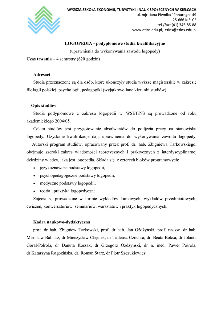 WYŻSZA SZKOŁA EKONOMII, TURYSTYKI I NAUK SPOŁECZNYCH W KIELCACH ul. mjr. Jana Piwnika "Ponurego" 49 25-666 KIELCE tel./fax: (41) 345-85-88 www.etins.edu.pl, [email protected] LOGOPEDIA - podyplomowe studia kwalifikacyjne (uprawnienia do wykonywania zawodu logopedy) Czas trwania – 4 semestry (620 godzin) Adresaci Studia przeznaczone są dla osób, które ukończyły studia wyższe magisterskie w zakresie filologii polskiej, psychologii, pedagogiki (wyjątkowo inne kierunki studiów). Opis studiów Studia podyplomowe z zakresu logopedii w WSETiNS są prowadzone od roku akademickiego 2004/05. Celem studiów jest przygotowanie absolwentów do podjęcia pracy na stanowisku logopedy. Uzyskane kwalifikacje dają uprawnienia do wykonywania zawodu logopedy. Autorski program studiów, opracowany przez prof. dr. hab. Zbigniewa Tarkowskiego, obejmuje szeroki zakres wiadomości teoretycznych i praktycznych z interdyscyplinarnej dziedziny wiedzy, jaką jest logopedia. Składa się z czterech bloków programowych: językoznawcze podstawy logopedii, psychopedagogiczne podstawy logopedii, medyczne podstawy logopedii, teoria i praktyka logopedyczna. Zajęcia są prowadzone w formie wykładów kursowych, wykładów przedmiotowych, ćwiczeń, konwersatoriów, seminariów, warsztatów i praktyk logopedycznych. Kadra naukowo-dydaktyczna prof. dr hab. Zbigniew Tarkowski, prof. dr hab. Jan Ożdżyński, prof. nadzw. dr hab. Mirosław Babiarz, dr Mieczysław Chęciek, dr Tadeusz Czochra, dr. Beata Boksa, dr Jolanta Góral-Półrola, dr Danuta Kossak, dr Grzegorz Ożdżyński, dr n. med. Paweł Półrola, dr Katarzyna Rogozińska, dr. Roman Starz, dr Piotr Szczukiewicz.