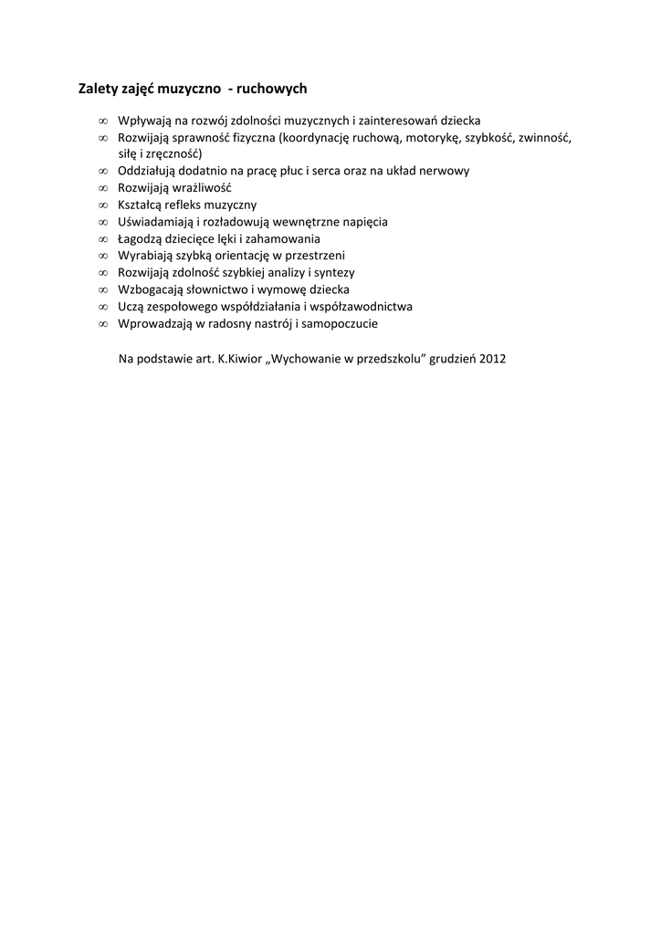 Zalety zajęć muzyczno - ruchowych • Wpływają na rozwój zdolności muzycznych i zainteresowań dziecka • Rozwijają sprawność fizyczna (koordynację ruchową, motorykę, szybkość, zwinność, siłę i zręczność) • Oddziałują dodatnio na pracę płuc i serca oraz na układ nerwowy • Rozwijają wrażliwość • Kształcą refleks muzyczny • Uświadamiają i rozładowują wewnętrzne napięcia • Łagodzą dziecięce lęki i zahamowania • Wyrabiają szybką orientację w przestrzeni • Rozwijają zdolność szybkiej analizy i syntezy • Wzbogacają słownictwo i wymowę dziecka • Uczą zespołowego współdziałania i współzawodnictwa • Wprowadzają w radosny nastrój i samopoczucie Na podstawie art. K.Kiwior „Wychowanie w przedszkolu” grudzień 2012