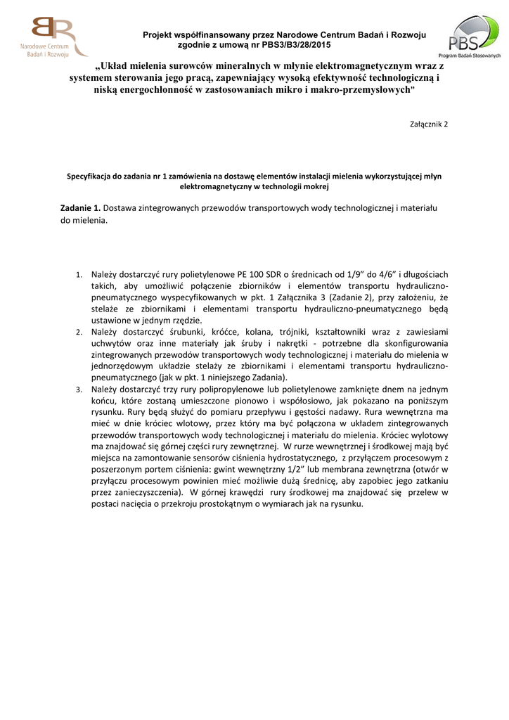 Projekt współfinansowany przez Narodowe Centrum Badań i Rozwoju zgodnie z umową nr PBS3/B3/28/2015 „Układ mielenia surowców mineralnych w młynie elektromagnetycznym wraz z systemem sterowania jego pracą, zapewniający wysoką efektywność technologiczną i niską energochłonność w zastosowaniach mikro i makro-przemysłowych” Załącznik 2 Specyfikacja do zadania nr 1 zamówienia na dostawę elementów instalacji mielenia wykorzystującej młyn elektromagnetyczny w technologii mokrej Zadanie 1. Dostawa zintegrowanych przewodów transportowych wody technologicznej i materiału do mielenia. Należy dostarczyć rury polietylenowe PE 100 SDR o średnicach od 1/9” do 4/6” i długościach takich, aby umożliwić połączenie zbiorników i elementów transportu hydraulicznopneumatycznego wyspecyfikowanych w pkt. 1 Załącznika 3 (Zadanie 2), przy założeniu, że stelaże ze zbiornikami i elementami transportu hydrauliczno-pneumatycznego będą ustawione w jednym rzędzie. 2. Należy dostarczyć śrubunki, króćce, kolana, trójniki, kształtowniki wraz z zawiesiami uchwytów oraz inne materiały jak śruby i nakrętki - potrzebne dla skonfigurowania zintegrowanych przewodów transportowych wody technologicznej i materiału do mielenia w jednorzędowym układzie stelaży ze zbiornikami i elementami transportu hydraulicznopneumatycznego (jak w pkt. 1 niniejszego Zadania). 3. Należy dostarczyć trzy rury polipropylenowe lub polietylenowe zamknięte dnem na jednym końcu, które zostaną umieszczone pionowo i współosiowo, jak pokazano na poniższym rysunku. Rury będą służyć do pomiaru przepływu i gęstości nadawy. Rura wewnętrzna ma mieć w dnie króciec wlotowy, przez który ma być połączona w układem zintegrowanych przewodów transportowych wody technologicznej i materiału do mielenia. Króciec wylotowy ma znajdować się górnej części rury zewnętrznej. W rurze wewnętrznej i środkowej mają być miejsca na zamontowanie sensorów ciśnienia hydrostatycznego, z przyłączem procesowym z poszerzonym portem ciśnienia: gwint wewnętrzny 1/2” lub membrana zewnętrzna (otwór w przyłączu procesowym powinien mieć możliwie dużą średnicę, aby zapobiec jego zatkaniu przez zanieczyszczenia). W górnej krawędzi rury środkowej ma znajdować się przelew w postaci nacięcia o przekroju prostokątnym o wymiarach jak na rysunku. 1. Projekt współfinansowany przez Narodowe Centrum Badań i Rozwoju zgodnie z umową nr PBS3/B3/28/2015 „Układ mielenia surowców mineralnych w młynie elektromagnetycznym wraz z systemem sterowania jego pracą, zapewniający wysoką efektywność technologiczną i niską energochłonność w zastosowaniach mikro i makro-przemysłowych” RURA ZEWNETRZNA PROFIL PRZELEWU POMIAROWEGO 10 PRZELEW AWARYJNY 300 PRZELEW POMIAROWY PRZEPŁYWOMIERZA RURA PRZEPŁYWOMIERZA 1000 1200 900 RURA GESTOŚCIOMIERZA CZUJNIK CIŚNIENIA GESTOŚCIOMIERZA WYLOT PI 100 CZUJNIK CIŚNIENIA PRZEPŁYWOMIERZA 100 PI WLOT 100 150 200 4. Zintegrowane przewody transportowe wody technologicznej i materiału do mielenia mają służyć do konfiguracji zbiorników i elementów transportu hydrauliczno-pneumatycznego jak na rysunku poniżej: z młyna hydrocyklon woda do młyna - króciec - element transportu hydrauliczno-pneumatycznego Projekt współfinansowany przez Narodowe Centrum Badań i Rozwoju zgodnie z umową nr PBS3/B3/28/2015 „Układ mielenia surowców mineralnych w młynie elektromagnetycznym wraz z systemem sterowania jego pracą, zapewniający wysoką efektywność technologiczną i niską energochłonność w zastosowaniach mikro i makro-przemysłowych” Zintegrowane przewody transportowe wody technologicznej i materiału do mielenia dotyczą również połączenia zestawu stelaży z młynem elektromagnetycznym (przewody zaznaczone jako: „z młyna” oraz „do młyna” na powyższym rysunku). Obszar roboczy młyna znajduje się w rurze stalowej o średnicy 100 mm. Dlatego elementem zintegrowanych przewodów transportowych wody technologicznej i materiału do mielenia mają być również złącza kołnierzowe łączące wymienione przewody z młynem. 6. Na części wlotowej wymienionej w powyższym punkcie rury młyna będzie zamontowany układ ręcznego dozowania mielników. Dlatego kolejnym elementem do dostarczenia w ramach niniejszego zadania ma być stalowa rura o średnicy od ½” do 1” i długości 300 mm, zawór kulowym z przyłączem do tej rury oraz pojemnik na mielniki w postaci prętów ferromagnetycznych o długości ok. 1cm. Pojemnik ma mieć objętość ok. 1 l i ma mieć połączenie ze wspomnianym zaworem kulowym. Pomiędzy zaworem kulowym a pojemnikiem na mielniki ma być zawór odpowietrzający całą instalację mielenia na mokro. 7. Wszystkie przewody transportowe mają być wyposażone w zawory odcinające. 8. Należy dostarczyć hydrocyklon, stanowiący integralną część układu gospodarki wodą technologiczną i materiałem zmielonym. Hydrocyklon ma mieć średnicę od 20 do 30 mm i wydajności nie mniejszą niż 1 m3 zawiesiny/h. Hydrocyklon ma umożliwić rozdział ziarnowy materiału zmielonego na mokro przy maksymalnym uziarnieniu 2 mm. 5.