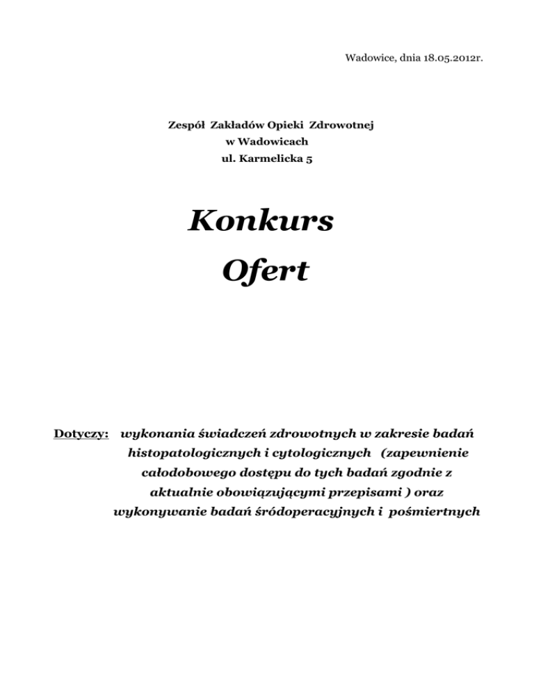 Wadowice, dnia 18.05.2012r. Zespół Zakładów Opieki Zdrowotnej w Wadowicach ul. Karmelicka 5 Konkurs Ofert Dotyczy: wykonania świadczeń zdrowotnych w zakresie badań histopatologicznych i cytologicznych (zapewnienie całodobowego dostępu do tych badań zgodnie z aktualnie obowiązującymi przepisami ) oraz wykonywanie badań śródoperacyjnych i pośmiertnych Szczegółowe warunki konkursu na udzielanie świadczeń zdrowotnych w zakresie badań histopatologicznych i cytologicznych (zapewnienie całodobowego dostępu do tych badań zgodnie z aktualnie obowiązującymi przepisami ) oraz wykonywanie badań śródoperacyjnych i pośmiertnych dla Zespołu Zakładów Opieki Zdrowotnej w Wadowicach I. Przedmiot zamówienia. 1. Przedmiotem zamówienia jest przeprowadzanie badań w zakresie diagnostyki histopatologicznej i cytologicznej (zapewnienie całodobowego dostępu do tych badań zgodnie z aktualnie obowiązującymi przepisami), badań śródoperacyjnych oraz wykonywanie badań pośmiertnych dla Zespołu Zakładów Opieki Zdrowotnej w Wadowicach zwanego dalej ZZOZ. 2. Zakresy badań mogą się zmieniać w trakcie realizacji umowy z przyczyn i w sposób określony w umowach z płatnikiem publicznym powszechnego ubezpieczenia zdrowotnego lub innym płatnikiem oraz w wyniku zawarcia przez Zespół Zakładów Opieki Zdrowotnej w Wadowicach nowych umów. Na takich samych zasadach mogą być zmieniane zasady wykonywania, rozliczania oraz sprawozdawania udzielanych świadczeń opieki zdrowotnej, które będą wprowadzone aneksem do umowy. Ad. 1 1) Diagnostyka histopatologiczna i cytologiczna NAZWA/RODZAJ BADANIA Lp. szacunkowa liczba 1. Badanie histopatologiczne usuniętego narządu (cena od 1 miejsca pobrania wycinka) łącznie z niezbędnymi do ustalenia diagnozy badaniami 8000 immunohistochemicznymi . 2. Biopsja aspiracyjna cienkoigłowa (do 4 preparatów) 3. Badanie materiału tkankowego pobranego od zwierzęcia 12 4. Badanie cytologiczne płynów ustrojowych 65 5. Oznaczenie immunohistochemiczne receptorów 143 estrogenowych i progesteronowych oraz badań HER-2 180 2) Badania śródoperacyjne. Przez badania śródoperacyjne rozumie się badania wykonane na podstawie materiału świeżego oraz następowe badanie materiału utrwalonego techniką parafinową. NAZWA/RODZAJ BADANIA Lp. szacunkowa liczba Badanie śródoperacyjne 1. 60 3). Badania pośmiertne NAZWA BADANIA Lp. szacunkowa liczba 1. Badania pośmiertne: badanie makroskopowe z pobraniem wycinków 120 do badania mikroskopowego. II. Okres obowiązywania zamówienia: 1. Umowa zostanie zawarta na czas określony, od dnia podpisania do 01.10.2016r. 2. Termin rozpoczęcia udzielania świadczeń zdrowotnych ustala się na dzień: 01.10.2012 r., po rozstrzygnięciu konkursu. 3. ZZOZ zastrzega możliwość zawarcia umowy z datą późniejszą w szczególności w związku z przedłużeniem się postępowania o udzielenie przedmiotowego zamówienia. W razie zawarcia umowy po 01.10.2012r. ZZOZ zastrzega możliwość późniejszego rozpoczęcia udzielania świadczeń zdrowotnych. 4. ZZOZ zastrzega możliwość zawarcia umowy z terminem rozpoczęcia wykonywania umowy wcześniejszym niż 01.10.2012r. na zasadzie porozumienia stron. III. Zasady udzielania świadczeń . 1. Świadczenia, będące przedmiotem zamówienia wykonywane będą w zakładach diagnostycznych przyjmującego zamówienie oprócz: 2. Badania śródoperacyjne wykonywane będą w siedzibie ZZOZ w ustalonym dniu tygodnia (nie mniej niż 1 raz w tygodniu, nie mniej niż 5 godzin w godz. dopołudniowych np. 8.00 – 14.00). 3. Badania pośmiertne będą wykonywane w siedzibie ZZOZ zgodnie ze zleceniem i w terminach ustalonych z ZZOZ do 48 godzin (termin ten liczy się po upływie 12 godzin od zgonu). W szczególnych przypadkach jest możliwe ustalenie innego terminu, który należy ustalić z Koordynatorem umowy. IV. Wymagania stawiane Przyjmującemu zamówienie. 1.Przyjmujący zamówienie ma spełnić wymagania dotyczące sprzętu, aparatury i personelu wykonującego badania będące przedmiotem zamówienia zgodnie z wytycznymi: • Polskiego Towarzystwa Patomorfologów, • Narodowego Funduszu Zdrowia, • zgodnie z atestami dopuszczającymi sprzęt i aparaturę do użytku w Polsce. 2. Przyjmujący zamówienie ma zapewnić kompleksowe wykonywanie usług objętych konkursem. Ewentualne podwykonawstwo może wystąpić tylko jako sytuacja nadzwyczajna za zgodą wyrażoną przez ZZOZ na piśmie. 3. W konkursie mogą brać udział podmioty wykonujące działalność leczniczą, z wyłączeniem grupowych i indywidualnych praktyk lekarskich. 4. Oferta może być złożona tylko przez podmiot wykonujący działalność leczniczą, który posiada doświadczenie i wiedzę oraz odpowiednie warunki finansowe, pozwalające na wykonywanie dla ZZOZ usługi w zakresie opisanym w szczegółowych warunkach oraz zgodnie z warunkami podpisanej umowy. 5. Przez doświadczenie i wiedzę, o których mowa w punkcie poprzedzającym , należy rozumieć: a) doświadczenie - świadczenie usług odpowiadających swoim rodzajem usługom opisanym w niniejszych szczegółowych warunkach konkursu w okresie ostatnich trzech latach przed dniem wszczęcia postępowania konkursowego, dla dwóch Szpitali. b) posiadanie wiedzy - dysponowanie wykwalifikowanym i przeszkolonym personelem. 6. Przez odpowiednie warunki finansowe należy rozumieć niezaleganie przez Przyjmującego zamówienie w płatnościach podatków i składek z tytułu ubezpieczenia społecznego. 7. ZZOZ wyznaczy ze swej strony Koordynatora realizacji umowy. 8. Przyjmujący zamówienie zobowiązany jest do udzielania świadczeń zdrowotnych w zakresie badań diagnostycznych w dziedzinie histopatologii na rzecz wszystkich pacjentów ZZOZ, w tym: na rzecz pacjentów hospitalizowanych, pacjentów ambulatoryjnej opieki specjalistycznej, a także na rzecz pacjentów podmiotów, z którymi ZZOZ ma podpisane umowy w tym zakresie. Przyjmujący zamówienie powin