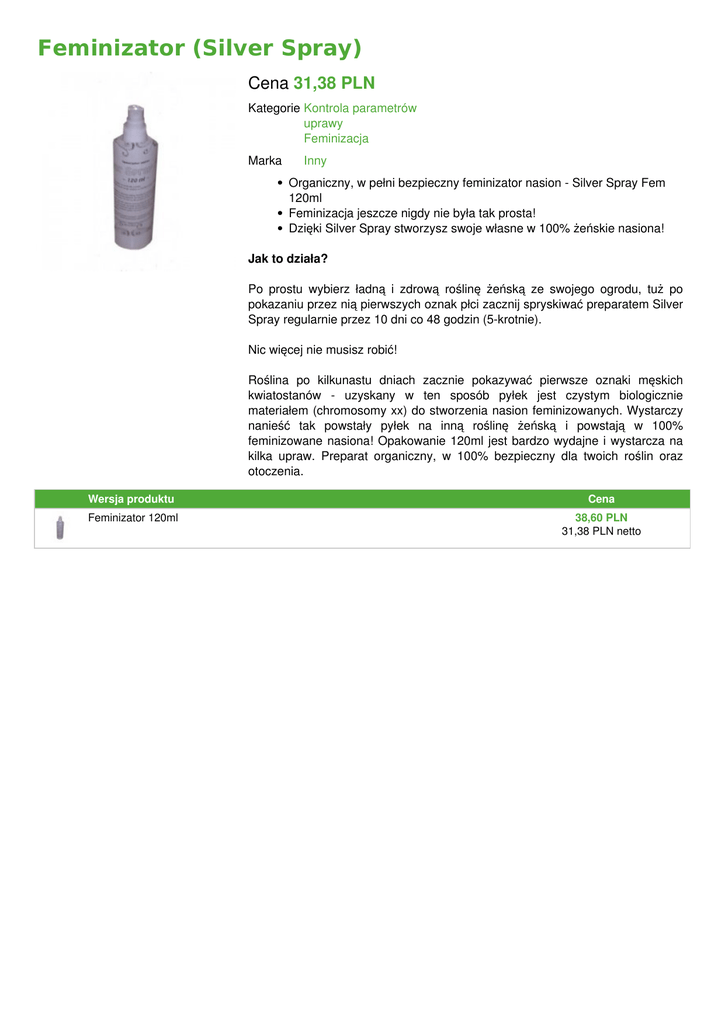 Feminizator (Silver Spray) Cena 31,38 PLN Kategorie Kontrola parametrów uprawy Feminizacja Marka Inny Organiczny, w pełni bezpieczny feminizator nasion - Silver Spray Fem 120ml Feminizacja jeszcze nigdy nie była tak prosta! Dzięki Silver Spray stworzysz swoje własne w 100% żeńskie nasiona! Jak to działa? Po prostu wybierz ładną i zdrową roślinę żeńską ze swojego ogrodu, tuż po pokazaniu przez nią pierwszych oznak płci zacznij spryskiwać preparatem Silver Spray regularnie przez 10 dni co 48 godzin (5-krotnie). Nic więcej nie musisz robić! Roślina po kilkunastu dniach zacznie pokazywać pierwsze oznaki męskich kwiatostanów - uzyskany w ten sposób pyłek jest czystym biologicznie materiałem (chromosomy xx) do stworzenia nasion feminizowanych. Wystarczy nanieść tak powstały pyłek na inną roślinę żeńską i powstają w 100% feminizowane nasiona! Opakowanie 120ml jest bardzo wydajne i wystarcza na kilka upraw. Preparat organiczny, w 100% bezpieczny dla twoich roślin oraz otoczenia. Powered by TCPDF (www.tcpdf.org) Wersja produktu Cena Feminizator 120ml 38,60 PLN 31,38 PLN netto