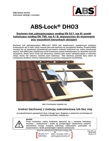 ABS Safety GmbH Instrukcja obsługi i montażu ABS-Lock® DH03 Dachowy hak zabezpieczający według EN 517, typ B i punkt kotwiczący według EN 795, typ A i B, dopuszczony do stosowania przy wszystkich kierunkach obciążeń Dachowy hak zabezpieczający ABS-Lock® DH03 jest bezpiecznym, pojedynczym punktem kotwiczącym dla 3 osób i służy również jako hak dachowy do zaczepiania drabiny. Produkt DH03 montuje się na konstrukcji sprawdzonej pod kątem nośności statycznej (np. nośna konstrukcja dachu). Hak DH03 jako pojedynczy punkt kotwiczący został przetestowany na wszystkie kierunki obciążenia. Dzięki temu może być stosowany również jako punkt zabezpieczający w kierunku okapu dachu lub kalenicy (również poza kalenicą). Hak dachowy posiada duży otwór do zaczepienia środków ochrony indywidualnej za pomocą tradycyjnych karabinków. Jest mocowany zawsze na: krokwi dachowej z izolacją nakrokwiową lub bez niej za pośrednictwem specjalnych śrub, różnego typu i długości w zależności od istniejących warunków (kontrłaty, izolacja itp.) WAŻNE Przed montażem należy dokładnie zapoznać się z niniejszą instrukcją montażu i użytkowania i ściśle jej przestrzegać! Użytkownicy systemu zakotwienia muszą niniejszą instrukcję użytkowania przeczytać ze zrozumieniem i ściśle przestrzegać nakazów producenta. ABS Safety GmbH Gewerbering 3 47623 Kevelae Telefon + 49 (0) 2832 – 97281 – 0 Telefaks +49 (0) 2832–97281–29 eMail [email protected] MoA_057_01 18.04.2011 Strona 1 z 8 ABS Safety GmbH Instrukcja obsługi i montażu KONTROLA PRZED KAŻDYM UŻYCIEM: • • • Należy przestrzegać zaleceń stosowania innych produktów powiązanych z niniejszym produktem. Punkt kotwiczący musi być bez uszkodzeń i oznak korozji. Monterzy muszą upewnić się, że konstrukcja nadaje się do zamocowania haka dachowego ABS-Lock® DH03. Punkt kotwiczący musi być w dobrym stanie technicznym bez oznak zużycia lub odkształcenia. Nie wolno korzystać z punktu kotwiczącego, jeśli nie są spełnione wyszczególnione wyżej kryteria. Punkt kotwiczący należy poddawać raz na rok kontroli przez rzeczoznawcę i musi być to udokumentowane. Badanie to jest bezwzględnie konieczne, ponieważ zależy od niego skuteczność i wytrzymałość systemu, a w konsekwencji bezpieczeństwo użytkownika. PRZEPISY BEZPIECZEŃSTWA: • • • • • • • • • • • • • • • • • • • • • • Przed użyciem cały system zabezpieczenia przed upadkiem należy sprawdzić wzrokowo pod kątem widocznych usterek (np.: luźne połączenia śrubowe, odkształcenia, zużycie, korozja, uszkodzona izolacja dachu itp.). Jeśli istnieją podejrzenia co do bezpiecznego działania systemu, należy poddać go kontroli przez rzeczoznawcę (udokumentować na piśmie). Hak dachowy ABS-Lock® DH03 został opracowany dla zapewnienia bezpieczeństwa osób i zaczepiania drabiny i nie wolno go wykorzystywać do innych celów. Nie wolno nigdy wieszać na systemie zabezpieczenia niedających się określić obciążeń. Produkt ten może być stosowany jako pojedynczy punkt kotwiczący dla maks. 3 osób jednocześnie. Produkt może być używany tylko przez odpowiednio poinstruowanych i przeszkolonych pracowników. Produkt należy stosować tylko z łącznikami (według normy EN 362) i środkami ochrony osobistej (ŚOI) przed upadkiem (np. linka asekuracyjna z absorberem energii według norm EN 354 i EN 355, mechanizm samozaciskowy wraz z giętką prowadnicą według normy EN 353-2 lub urządzeniem samohamownym według normy EN 360). Po upadku produkt należy wyłączyć z użytkowania i przekazać do kontroli przez producenta. Punkt kotwiczący nie powinien mieć kontaktu z chemikaliami ani innymi substancjami agresywnymi; w przypadku wystąpienia wątpliwości skontaktować się z producentem. Jeśli istnieją wątpliwości co do bezpiecznego działania punktu kotwiczącego, należy go wycofać z użytku i przekazać producentowi do kontroli. Podczas montażu/używania haka dachowego ABS-Lock® DH03 należy przestrzegać stosownych przepisów zapobiegania wypadkom (np.: podczas pracy na dachach). Na miejscu musi być plan postępowania uwzględniający środki ratunkowe dla wszystkich możliwych niebezpiecznych wypadków. Przed rozpoczęciem prac należy przedsięwziąć kroki zapobiegające upadkowi jakichkolwiek przedmiotów z miejsca pracy. Obszar poniżej miejsca pracy (chodnik itp.) musi być wolny od przeszkód. Stal szlachetna nie powinna mieć kontaktu z pyłem szlifierskim lub narzędziami stalowymi, ponieważ może to prowadzić do korozji. Punkt kotwiczący powinien być tak zaplanowany, zamontowany i używany, aby przy prawidłowym stosowaniu środków ochrony indywidualnej przed upadkiem nie był możliwy upadek przez krawędź, z której można spaść. Uwaga: W przypadku zastosowania poziomego zabezpieczenia należy stosować tylko linki asekuracyjne (lonże), które są odpowiednie do tego celu zastosowania i zostały przetestowane przy danym rodzaju krawędzi (ostre krawędzie, blacha trapezowe, belki stalowe, beton itp.). Całe urządzenie zabezpieczające wraz ze stosowanymi środkami ochrony indywidualnej przed upadkiem musi być przynajmniej raz w roku poddane kontroli przez rzeczoznawcę. Kontrola przez rzeczoznawcę musi być udokumentowana na załączonej karcie kontroli. Należy również sprawdzić czytelność oznakowania. Nie wolno podejmować żadnych zmian na urządzeniu kotwiczącym oddanym do użytkowania. W przypadku zostawienia systemu zabezpieczenia dla zewnętrznego wykonawcy należy przekazać mu, z potwierdzeniem na piśmie, instrukcję użytkowania i montażu. Dachowy hak zabezpieczający ABS-Lock® DH03 nie może spełniać roli punktu kotwiczącego podczas prac na wysokości, przy których lina jest elementem nośnym (prace na wysokości prowadzone na linie itp.). Bezwzględnie należy zwracać uwagę, aby była wystarczająca wolna