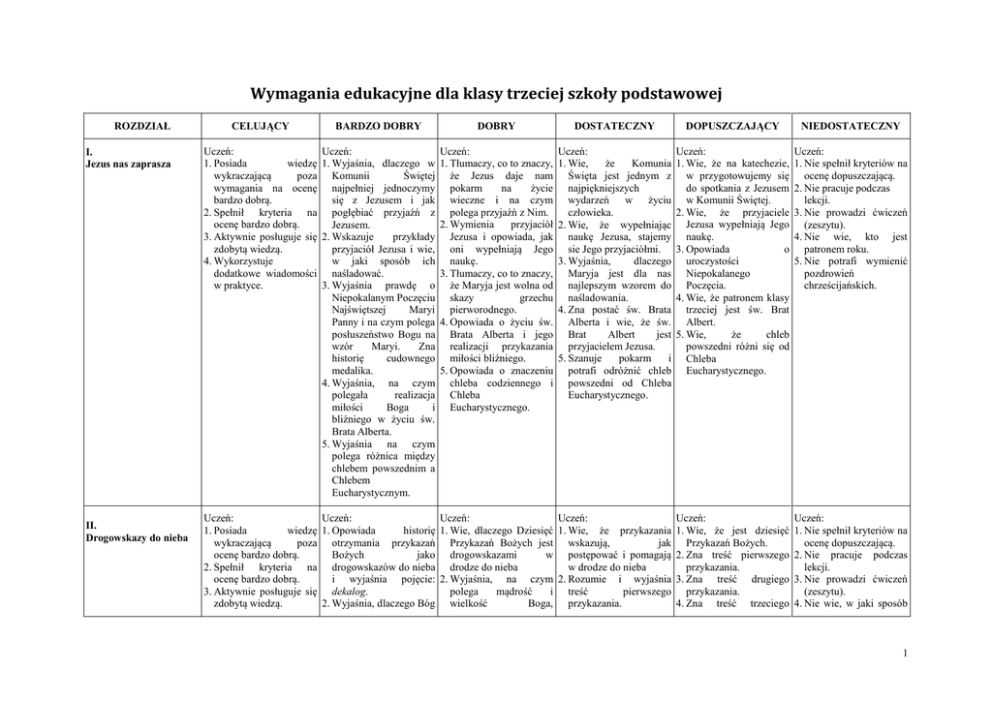 Wymagania edukacyjne dla klasy trzeciej szkoły podstawowej ROZDZIAŁ I. Jezus nas zaprasza II. Drogowskazy do nieba CELUJĄCY BARDZO DOBRY DOBRY DOSTATECZNY DOPUSZCZAJĄCY NIEDOSTATECZNY Uczeń: 1. Posiada wiedzę wykraczającą poza wymagania na ocenę bardzo dobrą. 2. Spełnił kryteria na ocenę bardzo dobrą. 3. Aktywnie posługuje się zdobytą wiedzą. 4. Wykorzystuje dodatkowe wiadomości w praktyce. Uczeń: 1. Wyjaśnia, dlaczego w Komunii Świętej najpełniej jednoczymy się z Jezusem i jak pogłębiać przyjaźń z Jezusem. 2. Wskazuje przykłady przyjaciół Jezusa i wie, w jaki sposób ich naśladować. 3. Wyjaśnia prawdę o Niepokalanym Poczęciu Najświętszej Maryi Panny i na czym polega posłuszeństwo Bogu na wzór Maryi. Zna historię cudownego medalika. 4. Wyjaśnia, na czym polegała realizacja miłości Boga i bliźniego w życiu św. Brata Alberta. 5. Wyjaśnia na czym polega różnica między chlebem powszednim a Chlebem Eucharystycznym. Uczeń: 1. Tłumaczy, co to znaczy, że Jezus daje nam pokarm na życie wieczne i na czym polega przyjaźń z Nim. 2. Wymienia przyjaciół Jezusa i opowiada, jak oni wypełniają Jego naukę. 3. Tłumaczy, co to znaczy, że Maryja jest wolna od skazy grzechu pierworodnego. 4. Opowiada o życiu św. Brata Alberta i jego realizacji przykazania miłości bliźniego. 5. Opowiada o znaczeniu chleba codziennego i Chleba Eucharystycznego. Uczeń: 1. Wie, że Komunia Święta jest jednym z najpiękniejszych wydarzeń w życiu człowieka. 2. Wie, że wypełniając naukę Jezusa, stajemy sie Jego przyjaciółmi. 3. Wyjaśnia, dlaczego Maryja jest dla nas najlepszym wzorem do naśladowania. 4. Zna postać św. Brata Alberta i wie, że św. Brat Albert jest przyjacielem Jezusa. 5. Szanuje pokarm i potrafi odróżnić chleb powszedni od Chleba Eucharystycznego. Uczeń: 1. Wie, że na katechezie, w przygotowujemy się do spotkania z Jezusem w Komunii Świętej. 2. Wie, że przyjaciele Jezusa wypełniają Jego naukę. 3. Opowiada o uroczystości Niepokalanego Poczęcia. 4. Wie, że patronem klasy trzeciej jest św. Brat Albert. 5. Wie, że chleb powszedni różni się od Chleba Eucharystycznego. Uczeń: 1. Nie spełnił kryteriów na ocenę dopuszczającą. 2. Nie pracuje podczas lekcji. 3. Nie prowadzi ćwiczeń (zeszytu). 4. Nie wie, kto jest patronem roku. 5. Nie potrafi wymienić pozdrowień chrześcijańskich. Uczeń: Uczeń: Uczeń: Uczeń: 1. Posiada wiedzę 1. Opowiada historię 1. Wie, dlaczego Dziesięć 1. Wie, że przykazania wykraczającą poza otrzymania przykazań Przykazań Bożych jest wskazują, jak w postępować i pomagają ocenę bardzo dobrą. Bożych jako drogowskazami 2. Spełnił kryteria na drogowskazów do nieba drodze do nieba w drodze do nieba i wyjaśnia pojęcie: 2. Wyjaśnia, na czym 2. Rozumie i wyjaśnia ocenę bardzo dobrą. 3. Aktywnie posługuje się dekalog. polega mądrość i treść pierwszego zdobytą wiedzą. 2. Wyjaśnia, dlaczego Bóg wielkość Boga, przykazania. Uczeń: 1. Wie, że jest dziesięć Przykazań Bożych. 2. Zna treść pierwszego przykazania. 3. Zna treść drugiego przykazania. 4. Zna treść trzeciego Uczeń: 1. Nie spełnił kryteriów na ocenę dopuszczającą. 2. Nie pracuje podczas lekcji. 3. Nie prowadzi ćwiczeń (zeszytu). 4. Nie wie, w jaki sposób 1 ROZDZIAŁ CELUJĄCY BARDZO DOBRY DOBRY DOSTATECZNY 4. Wykorzystuje dodatkowe wiadomości w praktyce. ma być na pierwszym miejscu w życiu człowieka oraz czym jest postawa wiary i zaufania. 3. Potrafi wyjaśnić, dlaczego imiona święte wymawiamy z czcią, potrafi modlić się swoimi słowami i zna akty strzeliste. 4. Wyjaśnia, na czym polega pobożne uczestnictwo na niedzielnej Eucharystii, na czym polega radość i świętowanie niedzieli z najbliższymi. 5. Wie, dlaczego Pan Bóg daje nam rodziców, wyjaśnia pojęcie: szacunek i opowiada, jak należy szanować rodziców. 6. Wyjaśnia na czym polega, wartość życia ludzkiego i jak troszczyć się o życie i zdrowie, wyraża Bogu wdzięczność za życie. 7. Wyjaśnia, na czym polega troska o czystość myśli i uczynków. Wie, jak dbać o czystość ciała, serca i myśli. 8. Wyjaśnia, co to znaczy, że Pan Bóg pragnie, abyśmy dbali o rzeczy własne i cudze oraz dzielili się tym, co wymienia grzechy przeciw pierwszemu przykazaniu. 3. Wyjaśnia, co to znaczy ze czcią wymawiać imiona święte, wymienia grzechy przeciw drugiemu przykazaniu. 4. Opowiada o spotkaniu z Bogiem na niedzielnej Mszy Świętej, wymienia grzechy przeciw trzeciemu przykazaniu. 5. Opisuje, na czym polega posłuszeństwo rodzicom, wymienia grzechy przeciw czwartemu przykazaniu. 6. Wie, w jaki sposób dbać o zdrowie i szanować życie, wymienia grzechy przeciw piątemu, przykazaniu. 7. Opowiada dlaczego czystość serca i myśli jest źródłem radości w rodzinie, wymienia grzechy przeciw szóstemu przykazaniu. 8. Wymienia zasady korzystania z rzeczy wspólnych, wymienia grzechy przeciw siódmemu przykazaniu. 9. Wie, na czym polega prawdomówność, 3. Rozumie i wyjaśnia treść drugiego przykazania. 4. Rozumie i wyjaśnia treść trzeciego przykazania. 5. Rozumie i wyjaśnia treść czwartego przykazania. 6. Rozumie i wyjaśnia treść piątego przykazania. 7. Rozumie i wyjaśnia treść szóstego przykazania. 8. Rozumie i wyjaśnia treść siódmego przykazania. 9. Rozumie i wyjaśnia treść ósmego przykazania. 10. Rozumie i wyjaśnia treść dziewiątego i dziesiątego przykazania. DOPUSZCZAJĄCY NIEDOSTATECZNY przykazania. można wielbić Boga. 5. Zna treść czwartego 5. Z pomocą nauczyciela przykazania. nie potrafi powiedzieć 6. Zna treść piątego modlitwy Aniele Boży. przykazania. 7. Zna treść szóstego przykazania. 8. Zna treść siódmego przykazania. 9. Zna treść ósmego przykazania. 10. Zna treść dziewiątego i dziesiątego przykazania. 2 ROZDZIAŁ CELUJĄCY BARDZO DOBRY DOBRY DOSTATECZNY DOPUSZCZAJĄCY NIEDOSTATECZNY Uczeń: 1. Rozumie i wyjaśnia treść przykazań m