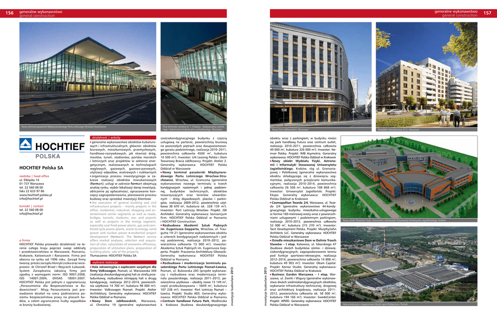 generalne wykonawstwo general construction generalne wykonawstwo general construction HOCHTIEF Polska SA siedziba | head office ul. Elbląska 14 01-737 Warszawa tel. 22 560 08 00 faks 22 633 97 86 www.hochtief-polska.pl [email protected] kontakt | contact tel. 22 560 08 00 [email protected] o firmie HOCHTIEF Polska prowadzi działalność na terenie całego kraju poprzez swoje oddziały i przedstawicielstwa w Warszawie, Poznaniu, Krakowie, Katowicach i Rzeszowie. Firma jest obecna na rynku od 1996 roku. Zarząd firmy tworzą: prezes zarządu Henryk Liszka oraz wiceprezesi: dr Christof Brixel i Wojciech Łukaszek. System Zarządzania Jakością firmy jest zgodny z wymogami norm: ISO 9001:2008, ISO 14001:2004, OHSAS 18001:2007. HOCHTIEF Polska jest jednym z sygnatariuszy „Porozumienia dla Bezpieczeństwa w Budownictwie”. Misją Porozumienia jest prowadzenie działań na rzecz podniesienia poziomu bezpieczeństwa pracy na placach budów, a celem ograniczenie liczby wypadków w branży budowlanej. działalność | activity generalne wykonawstwo obiektów kubaturowych i infrastrukturalnych, głównie: obiektów biurowych, mieszkaniowych, przemysłowych, handlowo-rozrywkowych, jak również dróg, mostów, tuneli, stadionów, portów morskich i lotniczych oraz projektów w sektorze energetycznym, realizowanych w technologiach węglowych, gazowych, gazowo-parowych, utylizacji odpadów, wiatrowych i nuklearnych organizacja procesu inwestycyjnego w zakresie realizacji obiektów mieszkaniowych (formart); usługi w zakresie formart obejmują analizę rynku, wybór lokalizacji danej inwestycji, obliczenie jej opłacalności, opracowanie koncepcji zagospodarowania, planowanie procesu budowy oraz sprzedaż inwestycji klientowi the execution of general building and civil infrastructure projects – mainly projects in the office, residential, industrial, shopping and entertainment center segments as well as roads, bridges, tunnels, stadiums, sea- and airports as well as projects in the energy segment, especially coal fired power plants, gas and combined cycle power plants, waste to energy, wind power and nuclear power residential project development (formart). The formart service offers market analyses, selection and acquisition of sites, calculation of economic efficiency, preparation of utilization plans, preparation of building plans, sale of the property Tłumaczenie: HOCHTIEF Polska SA wybrane realizacje Hala sekwencyjna z zapleczem socjalnym dla firmy Volkswagen, Poznań, ul. Warszawska 349 (realizacja dwukondygnacyjnej hali ze strefą przeładunkową; rozbudowa istniejącej hali o drugą kondygnację, realizacja 2012–2014, powierzchnia użytkowa 14 700 m2, kubatura 98 000 m3). Inwestor: Volkswagen Poznań. Projekt: Atelier Architektury. Generalny wykonawca: HOCHTIEF Polska Oddział w Poznaniu Nowy Dom Jabłkowskich, Warszawa, ul. Chmielna 19 (generalne wykonawstwo Pirsy terminalu Lotniska im. F. Chopina – budowa pirsu centralnego i dokończenie budowy pirsu południowego, Warszawa sześciokondygnacyjnego budynku z częścią usługową na parterze, powierzchnią biurową na pozostałych piętrach oraz dwupoziomowego garażu podziemnego, realizacja 2010–2011, powierzchnia całkowita 4500 m2, kubatura 16 500 m3). Inwestor: LHI Leasing Polska i Dom Towarowy Bracia Jabłkowscy. Projekt: Atelier 3. Generalny wykonawca: HOCHTIEF Polska Oddział w Warszawie Nowy terminal pasażerski Międzynarodowego Portu Lotniczego Wrocław-Strachowice, Wrocław, ul. Graniczna (generalne wykonawstwo nowego terminalu o trzech kondygnacjach naziemnych i jednej podziemnej, budynków technicznych, obiektów towarzyszących oraz terenów utwardzonych – dróg dojazdowych, placów i parkingów, realizacja 2009–2012, powierzchnia użytkowa 38 670 m2, kubatura ok. 328 139 m3). Inwestor: Port Lotniczy Wrocław. Projekt: JSK Architekci. Generalny wykonawca: konsorcjum firm: HOCHTIEF Polska Oddział w Poznaniu i HOCHTIEF Construction Rozbudowa Akademii Sztuk Pięknych im. Eugeniusza Gepperta, Wrocław, ul. Traugutta 19–21 (generalne wykonawstwo obiektu o czterech kondygnacjach nadziemnych i jednej podziemnej, realizacja 2010–2012, powierzchnia całkowita 13 000 m2). Inwestor: Akademia Sztuk Pięknych im. Eugeniusza Gepperta. Projekt: Pracownia Architektury Głowacki. Generalny wykonawca: HOCHTIEF Polska Oddział w Poznaniu Rozbudowa i modernizacja terminalu pasażerskiego Portu Lotniczego Poznań-Ławica, Poznań, ul. Bukowska 285 (projekt wykonawczy i rozbudowa oraz modernizacja terminalu pasażerskiego, realizacja 2011–2013, powierzchnia użytkowa – obiekty nowe 13 149 m2, część przebudowywana – 5849 m2, kubatura 107 238 m3). Inwestor: Port Lotniczy Poznań – Ławica. Projekt: Studio ADS. Generalny wykonawca: HOCHTIEF Polska Oddział w Poznaniu Centrum handlowe Futura Park, Modlniczka k. Krakowa (budowa dwukondygnacyjnego Nowy Dom Jabłkowskich, Warszawa inwestycje budowlane 2013 Nowy terminal pasażerski Międzynarodowego Portu Lotniczego Wrocław-Strachowice inwestycje budowlane 2013 156 obiektu wraz z parkingiem; w budynku mieści się park handlowy Futura oraz centrum outlet, realizacja 2010–2011, powierzchnia całkowita 49 000 m2, kubatura 326 000 m3). Inwestor: Neinver Polska. Projekt: IMB Asymetria. Generalny wykonawca: HOCHTIEF Polska Oddział w Krakowie Nowy obiekt Wydziału Fizyki, Astronomii i Informatyki Stosowanej Uniwersytetu Jagiellońskiego, Kraków, róg ul. Gronostajowej i Poletkowej (generalne wykonawstwo obiektu składającego się z dziewięciu segmentów, połączonych przejściami komunikacyjnymi, realizacja 2010–2014, powierzchnia całkowita 26 506 m2, kubatura 108 868 m3). Inwestor: Uniwersytet Jagielloński. Projekt: Ekspo. Generalny wykonawca: HOCHTIEF Polska Oddział w Krakowie Cosmopolitan Twarda 2/4, Warszawa, ul. Twarda 2/4 (generalne wykonawstwo 44-kondygnacyjnego budynku mieszkalno-usługowego w formie 160-metrowej wieży wraz z powierzchniami usługowymi i podzi