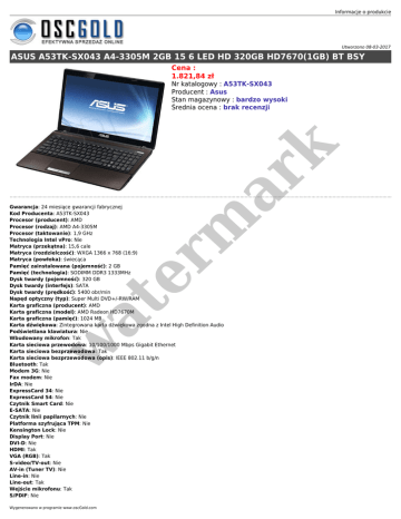 Informacje o produkcie Utworzono 08-03-2017 ASUS A53TK-SX043 A4-3305M 2GB 15 6 LED HD 320GB HD7670(1GB) BT BSY Cena : 1.821,84 zł er m ar k Nr katalogowy : A53TK-SX043 Producent : Asus Stan magazynowy : bardzo wysoki Średnia ocena : brak recenzji w at Gwarancja: 24 miesiące gwarancji fabrycznej Kod Producenta: A53TK-SX043 Procesor (producent): AMD Procesor (rodzaj): AMD A4-3305M Procesor (taktowanie): 1,9 GHz Technologia Intel vPro: Nie Matryca (przekątna): 15,6 cale Matryca (rozdzielczość): WXGA 1366 x 768 (16:9) Matryca (powłoka): świecąca Pamięć zainstalowana (pojemność): 2 GB Pamięć (technologia): SODIMM DDR3 1333MHz Dysk twardy (pojemność): 320 GB Dysk twardy (interfejs): SATA Dysk twardy (prędkość): 5400 obr/min Napęd optyczny (typ): Super Multi DVD+/-RW/RAM Karta graficzna (producent): AMD Karta graficzna (model): AMD Radeon HD7670M Karta graficzna (pamięć): 1024 MB Karta dźwiękowa: Zintegrowana karta dźwiękowa zgodna z Intel High Definition Audio Podświetlana klawiatura: Nie Wbudowany mikrofon: Tak Karta sieciowa przewodowa: 10/100/1000 Mbps Gigabit Ethernet Karta sieciowa bezprzewodowa: Tak Karta sieciowa bezprzewodowa (opis): IEEE 802.11 b/g/n Bluetooth: Tak Modem 3G: Nie Fax modem: Nie IrDA: Nie ExpressCard 34: Nie ExpressCard 54: Nie Czytnik Smart Card: Nie E-SATA: Nie Czytnik linii papilarnych: Nie Platforma szyfrująca TPM: Nie Kensington Lock: Nie Display Port: Nie DVI-D: Nie HDMI: Tak VGA (RGB): Tak S-video/TV-out: Nie AV-in (Tuner TV): Nie Line-in: Nie Line-out: Tak Wejście mikrofonu: Tak S/PDIF: Nie Wygenerowano w programie www.oscGold.com w at er m ar k RS232 (szeregowy): Nie Czytnik kart pamięci: Tak Panel klawiszy multimedialnych: Nie Złącze replikatora portów: Nie Fire-Wire (IEEE1394): Nie USB 2.0: 3 szt. System operacyjny: Brak systemu operacyjnego System operacyjny (wer. Językowa): Brak systemu operacyjnego Wbudowana kamera: Tak Wbudowana kamera (rozdzielczość): 0 ,3 Wbudowana kamera obrotowa: Nie Urządzenie wskazujące: Touchpad Akumulator (technologia): Litowo-jonowy, 6 komorowy Akumulator (pojemność): 4400 mAh Wymiary (wysokość): 35 mm Wymiary (szerokość): 378 mm Wymiary (głębokość): 253 mm Waga: 2,6 kg Gwarancja: 24 mies Gwarancja międzynarodowa: Nie Gwarancja baterii: 6 mies Wbudowana kamera (opis): Zintegrowana kamera internetowa o rozdzielczości 0,3 megapiksela Wyposażenie: Zasilacz sieciowy, karta gwarancyjna Adres www producenta: Link na stronę opisu technicznego Serwis producenta: Wsparcie Techniczne ASUS +48 22 571 80 40