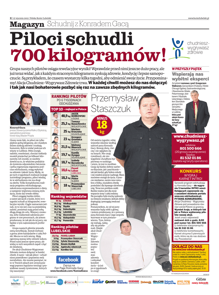 X | 27 stycznia 2012 | Polska Kurier Lubelski www.kurierlubelski.pl Magazyn Schudnij z Konradem Gacą Piloci schudli 700 kilogramów! W PRZYSZŁYPIĄTEK Grupanaszychpilotówosiągarewelacyjnewyniki!Wprawdzieprzednimijeszczedużopracy,ale jużterazwidać,jakzkażdymstraconymkilogramemzyskujązdrowie,kondycjęilepszesamopoWspierają nas czucie.Sąprzykładem,żeczasemwystarczykilkatygodni,abyodmienićswojeżycie.Przypomina- wybitni eksperci my!AkcjaChudniesz-WygrywaszZdrowietrwa.W każdej chwili możesz do nas dołączyć Za tydzień rozmowa z prof. Grzegorzem Wallnerem, kierownikiem II Katedry i Kliniki i tak jak nasi bohaterowie pozbyć się raz na zawsze zbędnych kilogramów. Chirurgii Ogólnej, Gastroenterologicznej RANKINGI PILOTÓW PO 6 TYGODNIACH ODCHUDZANIA TOP 10 - najlepsi w Polsce 40,9 kg JACEK BORKOWSKI ŁÓDZKIE Tomasz 25,3 kg Banachowicz WIELKOPOLSKIE Konrad Gaca prezes Stowarzyszenia Walki z Otyłością, specjalista żywieniowy trener klasy Master Propta Cieszy mnie fakt, że piloci nie tylko pięknie gubią kilogramy, ale z każdym dniem zyskują zdrowie i tryskają humorem. Było to widać podczas ich wizyty w Lublinie. Pełni energii, radośni, roześmiani, chociaż niekiedy musieli przejechać po kilkaset kilometrów. Ich wyniki, to niezbity dowód na to, że właściwe podejście do żywienia odpowiednie ćwiczenia i pełna regeneracja organizmu podczas odchudzania, mogą wpływać na zdrowie i jakość życia. Myślę, że po tych 6 tygodniach realizacji mojego autorskiego programu, piloci wiedzą, że w odchudzaniu nie ma drogi na skróty. Tylko kompleksowa realizacja programu odchudzającego, zakończona wyprowadzeniem z diety, a następnie wspierana zmianą stylu życia, może dać trwałe efekty. Piloci osiągają bardzo dobre, a nawet jak Jacek z Łodzi, który w 6 tygodni schudł 41 kilogramów, rewelacyjne wyniki. Ciągle zaznaczam jednak, że to nie jest czas na prawdziwą radość, ponieważ mają przed sobą długą drogę do celu. Wszyscy czuwamy, żeby realizowali założenia programu w 100 procentach, ale jestem przekonany, że tak jak do tej pory, nie będzie z tym najmniejszych problemów. Grupa naszych pilotów przeszła ostrą weryfikację. Zostali wybrani z grona 3000 kandydatów z całej Polski. Mocno w nich wierzę. Mają ogromną szansę żeby odnieść sukces. Przed nami jeszcze sporo pracy, ale widzę w nich wszystkich zapał i chęć do działania. Do akcji Chudniesz-Wygrywasz Zdrowie możesz dołączyć w każdej chwili. Z nami - tak jak piloci - schudniesz prawidłowo i poprawisz swój metabolizm. Ale musisz pamiętać, że to w Twoich rękach jest utrzymanie wagi poprzez regularne treningi i prawidłowe zasady żywieniowe, których Cię nauczymy! 25 Mariusz kg Kruszona 23 kg 21,5 kg 19,7 kg DOLNOŚLĄSKIE Grzegorz Gromnica ŚLĄSKIE Mateusz Binarsch WIELKOPOLSKIE Kamila Dyngus DOLNOŚLĄSKIE Izabela 18,7 kg Baraniecka WIELKOPOLSKIE 18,6 kg Paweł Łaban LUBELSKIE 18,3 kg Marta Piskor ŚLĄSKIE 18 kg Przemysław Staszczuk LUBELSKIE Ranking województw 96 kg 89,2 kg 86,8 kg 84,2 kg 81,4 kg 77 kg 69,2 kg 65,7 kg ŁÓDZKIE Wielkopolskie Śląskie Dolnośląskie Lubelskie Mazowieckie Małopolskie Pomorskie Ranking pilotów LUBELSKIE 18,6 kg 18 kg 17,6 kg 13,8 kg 13,4 kg 12,6 kg PAWEŁ ŁABAN Przemysław Staszczuk Sylwia Staszewska Renata Mydlak Agnieszka Adamczyk Karolina Gut Zajrzyj na Fan Page Konrada Gacy www.facebook.com/KonradGaca Przemysław Staszczuk MINUS 18 kg i Nowotworów Układu Pokarmowego, dziekanem I Wydziału Lekarskiego z Oddziałem Stomatologicznym Uniwersytetu Medycznego w Lublinie, który pod okiem Konrada Gacy schudł już 27 kg! www.chudnieszwygrywasz.pl Od sześciu tygodni, robię wszystko idealnie według zaleceń pana Konrada Gacy. Stosuję dietę, ćwiczę i nie oglądam się na innych. Nie czuję rywalizacji, ale niewątpliwie chciałbym być pierwszy w rankingu i wiem, że jest to możliwe. Czuję się bardzo dobrze zarówno fizycznie, jak i psychicznie – tak jak kiedyś, gdy byłem młody i nie miałem jeszcze nadwagi. Mam mnóstwo energii do życia. A jeszcze niedawno, zanim rano wstałem z łóżka, musiałem chwilę posiedzieć dla lepszego ukrwienia nóg. Teraz ten problem znikł. Bardzo ważne jest dla mnie wsparcie żony i całej rodziny. Na początku było trochę tęsknoty za różnymi smakami. Jednak efekty dopingują i pomagają zwalczać pokusy. Postanowiłem, że od tej pory wszystko będę robił z głową i jestem przekonany, że z pomocą pana Konrada Gacy i jego zespołu wytrwam w tym postanowieniu. Tym, którzy się wahają, radzę, aby się przełamali. Dzięki akcji Chudniesz – Wygrywasz Zdrowie można poprawić swój stan zdrowia i odzyskać komfort życia – ja już po 6 tygodniach to czuję! Infolinia 801 500 666 (20 groszy za połączenie) Telefon 81 532 01 86 (opłata wg taryfy operatora) KONKURS WYGRAJ KARNETINTRO! Sprawdź program odchudzający Konrada Gacy – do wygrania 5 karnetów INTRO umożliwiających zapoznanie się z zasadami działania portalu www.sos-odchudzanie.pl. PYTANIE KONKURSOWE: Akcja Chudniesz - Wygrywasz Zdrowie jest prowadzona również wśród Polonii za granicą. Wymień kraje, w których tak jak w Polsce wybieramy pilotów naszej akcji. Jeżeli znasz odpowiedź zadzwoń dziś o godz. 8.00 pod numer tel. 801 500 666 (z telefonów stacjonarnych) lub 81 532 01 86 (z telefonów komórkowych). Karnet otrzyma 5 pierwszych osób, które się do nas dodzwonią. Powodzenia! DOŁĄCZ DO NAS na www.sos-odchudzanie.pl Nie radzisz sobie z odchudzaniem? Spróbuj zrobić to z nami! Zapraszamy osoby z całej Polski na www.sos-odchudzanie.pl. Przyjdź na spotkania informacyjne, które odbywają się w Lublinie i Zamościu: Lublin, ul Bernardyńska 3 (Pałac Parysów), każdy poniedziałek godz. 19.00; Zamość, Centrum przy ul. Wyszyńskiego 63 b, każdy piątek godz. 19.30 FOT.AGNIESZKAKOZŁOWSKA ORGANIZATOR AKCJI : PARTNERZY AKCJI : PATRONI MEDIALNI AKCJI : 1162118/00