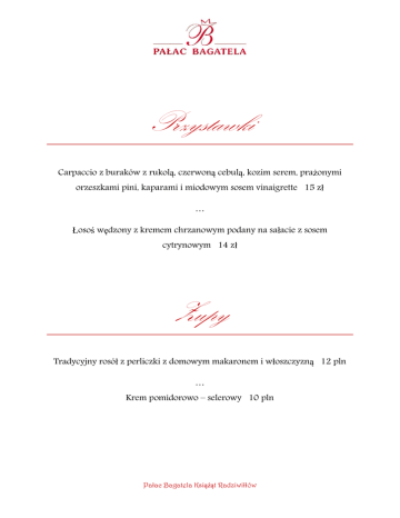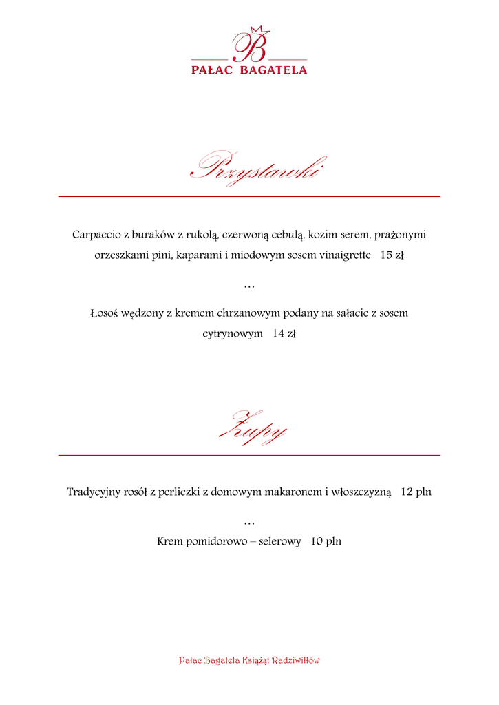 Przystawki Carpaccio z buraków z rukolą, czerwoną cebulą, kozim serem, prażonymi orzeszkami pini, kaparami i miodowym sosem vinaigrette 15 zł … Łosoś wędzony z kremem chrzanowym podany na sałacie z sosem cytrynowym 14 zł Zupy Tradycyjny rosół z perliczki z domowym makaronem i włoszczyzną 12 pln … Krem pomidorowo – selerowy 10 pln Pałac Bagatela Książąt Radziwiłłów Dania główne Udko z kaczki serwowane z kluskami śląskimi i modrą kapustą 40 pln … Filet z łososia na musie porowo – ziemniaczanym podany z sałatką z sałaty, świeżego szpinaku, roszponki z sosem pomarańczowym 49 pln … Polędwiczka wieprzowa w plastrach z borowikami w towarzystwie kaszy jęczmiennej i buraczków 43 pln … Zestaw dziecięcy Rosołek z makaronem 9 zł Kotleciki z kurczaka z puree ziemniaczanym i surówką z marchewki 18 zł Pałac Bagatela Książąt Radziwiłłów Desery Torcik czekoladowy z sosem malinowym 15 zł Lody waniliowe z advocatem i gorącym sosem owocowym 14 zł Szarlotka na ciepło z gałką lodów waniliowych i rozetką z bitej śmietany 14 zł Pałac Bagatela Książąt Radziwiłłów Napoje gorace Kawy - americano 9 zł - cappuccino 9 zł - espresso 9 zł Herbata 7 zł Napoje zimne Sok pomarańczowy 20 cl 5 zł Sok jabłkowy 20 cl 5 zł Woda gazowana 33 cl 4 zł Woda niegazowana 33 cl 4 zł Coca Cola 0,2L 5 zł Sprite 0,2L 5 zł Fanta 0,2L 5 zł Pałac Bagatela Książąt Radziwiłłów Alkohole Wina Martini Bianco 10 cl 7 zł Martini Rosso 10 cl 7 zł Martini Extra Dry 10 cl 7 zł Piwa Żywiec 50 cl 8 zł Tyskie 50 cl 8 zł Pałac Bagatela Książąt Radziwiłłów Whisky Ballantine’s 4 cl 10 zł Johnnie Walker Black Label 4 cl 18 zł Johnnie Walker Red Label 4 cl 12 zł Jack Daniel’s 4 cl 14 zł Brandy Raynal 4 cl 8 zł Torres 4 cl 8 zł Boulard Calvados 4cl 30 zł Metaxa 5* 4 cl 10zł Gin Seagrams Gin 4 cl 9 zł Pałac Bagatela Książąt Radziwiłłów Rum Bacardi Carta Blanca 4 cl 11 zł Bacardi Black 4 cl 11 zł Malibu 4 cl 8 zł Cognac Remy Martin VS 4 cl 20 zł Remy Martin VSOP 4 cl 35 zł Martell VS 4 cl 18 zł Martell VSOP 4 cl 35 zł Pałac Bagatela Książąt Radziwiłłów Tequila Gold Olmeca Tequila 4 cl 12 zł Blanco Olmeca Tequila 4 cl 11 zł Wódki Absolut 4 cl 7 zł Absolut Citron 4 cl 9 zł Absolut Kurant 4 cl 9 zł Absolut Vanilia 4 cl 9 zł Bols 4 cl 5 zł Finlandia Cranberry 4 cl 7 zł Finlandia Grapefruit 4 cl 7 zł Żubrówka 4 cl 5 zł Gorzka żołądkowa 4 cl 5 zł Ouzo Koryfaio 4 cl 5 zł Pałac Bagatela Książąt Radziwiłłów Likiery Grappa Riserva 4 cl 5 zł Curacao Blue 4 cl 6 zł De Krupe Triple Sec 4 cl 8 zł Contreau 4 cl 10 zł Campari 4 cl 8 zł Limoncio di Sorrento 4 cl 6 zł Sambuca 4 cl 6 zł Pałac Bagatela Książąt Radziwiłłów