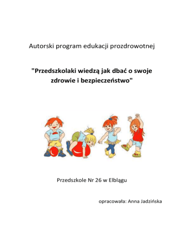 Autorski program edukacji prozdrowotnej "Przedszkolaki wiedzą jak dbać o swoje zdrowie i bezpieczeństwo" Przedszkole Nr 26 w Elblągu opracowała: Anna Jadzińska Jednym z podstawowych zadań wychowawczych przedszkola i jego zespołu wychowawczego jest wychowanie zdrowotne dziecka. Wychowanie zdrowotne jest integralną częścią ogólnego wychowania dziecka, zmierzającego do ukształtowania wysokiego poziomu kultury zdrowotnej i realizowane jest na co dzień w przedszkolu. Wstęp Okres przedszkolny jest jednym z etapów drogi życia człowieka. Każde dziecko rozwija się w tym czasie indywidualnie w charakterystycznym tylko dla niego rytmie i tempie. Kształtują się wtedy jego postawy determinujące, aktualne i przyszłe zachowania dotyczące zdrowia i aktywności ruchowej. Utrwalone wówczas przyzwyczajenia i nawyki decydują o jego późniejszym stylu życia. Edukację zdrowotną promującą aktywność ruchową należy rozpocząć jak najwcześniej, wspólnie z rodzicami dziecka. Dzieciństwo, to okres w życiu człowieka, w którym kształtują się jego nawyki oraz przyzwyczajenia i decydują o jego późniejszym stylu życia. Sposób żywienia dzieci wpływa na ich rozwój fizyczny, intelektualny, emocjonalny oraz na zdolność uczenia się. Zasoby, w które zostanie wyposażony młody organizm, są podstawą dobrego funkcjonowania przez wiele lat. Dlatego przedszkole to najlepsze środowisko dla dziecka, by rozpocząć i wdrażać systematycznie podstawy wychowania zdrowotnego. Charakterystyka programu Prezentowany program należy do kategorii programów profilaktyczno – zdrowotnych. Przeznaczony jest dla dzieci przedszkolnych ze wszystkich grup wiekowych i dostosowany jest do ich możliwości rozwojowych. Treści kształcenia zawarte w programie wynikają z Podstawy Programowej, która wśród celów wychowania przedszkolnego wymienia między innymi: „troskę o zdrowie dzieci, orientowanie się w zasadach zdrowego żywienia i zdrowego trybu życia, zachęcanie do uczestnictwa w zabawach i grach sportowych” Program ma charakter otwarty, jego treści mogą być rozszerzane w zależności od zainteresowań dzieci, inwencji nauczyciela oraz warunków i środków dydaktycznych jakimi dysponuje przedszkole. Wprowadzanie i utrwalanie treści programu będzie odbywać się w ciągu całego roku szkolnego. Program ten dostosowany jest do pracy z dziećmi 3-6 letnimi z wykorzystaniem najbliższego środowiska dzieci z Przedszkola Nr 26 w Elblągu. Program zawiera określone cele, treści programowe oraz przewidywane rezultaty pracy dydaktyczno-wychowawczej w zakresie kształtowania postaw zdrowotnych dzieci w wieku przedszkolnym. Program został pogrupowany w bloki tematyczne: I Bezpieczeństwo II Zdrowe odżywianie III Aktywność ruchowa Cele programu CEL GŁÓWNY: Głównym celem niniejszego programu jest poszerzanie wiadomości dzieci na temat wychowania zdrowotnego, przestrzegania zasad bezpieczeństwa oraz propagowanie zdrowego stylu życia. Cele szczegółowe: Stosowanie profilaktyki zdrowotnej. Uzupełnienie i wzbogacenie wiedzy o zdrowiu, jego wartości oraz jego zagrożeniach. Rozumienie roli ruchu na świeżym powietrzu Poznanie zasad warunkujących bezpieczną zabawę i odpoczynek Uzupełnianie i wzbogacanie wiedzy na temat zasad ruchu drogowego. METODY I SPOSOBY REALIZACJI: - rozmowy, pogadanki, prelekcje, - konkursy, quizy - przedstawienia teatralne, - zawody sportowe, - wycieczki do przychodni, szpitala, policji, - plakaty - organizowanie wystaw plastycznych FORMY REALIZACJI: - indywidualna - zbiorowa PRZEWIDYWANE EFEKTY: Dzieci uczestniczące w programie osiągną: – znajomość zasad zdrowego trybu życia, – umiejętności i nawyki zdrowotne, – znajomość zasad warunkujących bezpieczną zabawę i odpoczynek, – postawę aktywnego spędzania wolnego czasu Realizowane zagadnienia: Bezpieczeństwo: TREŚCI KSZTAŁCENIA: Ostrożne i uważne poruszanie się po sali i innych pomieszczeniach przedszkola Przestrzeganie ustalonych zasad zachowania się w czasie pobytu na placu zabaw Właściwe użytkowanie zabawek, przyborów i narzędzi Bezpieczne poruszanie się po drogach i ulicach Przestrzeganie zakazów dotyczących: zabaw zapałkami, zabaw w miejscach niedozwolonych, samowolnego korzystania z urządzeń elektrycznych CELE SZCZEGÓŁOWE - DZIECKO: - przestrzega zasad bezpieczeństwa - używa zabawek zgodnie z ich przeznaczeniem, - potrafi przejść prawidłowo przez ulicę - nie bawi się w pobliżu miejsc niebezpiecznych np. zbiorniki wodne, przejazdy kolejowe, lodowiska, - nie odchodzi od grupy, - przestrzega zasad bezpieczeństwa w czasie pobytu w domu i w przedszkolu, -potrafi powiedzieć, które zabawy są niebezpieczne i dlaczego - zna numery alarmowe Proponowane zagadnienia: 1. Gdzie szukać pomocy - spotkanie z policjantem 2. Niebezpieczne zabawy - układanie i opowiadanie historyjek obrazkowych, oglądanie filmów edukacyjnych 3. Stop agresji- rozmowy na temat różnych sytuacji, w których dzieci narażone są ze strony kolegów, szukanie dobrych sposobów rozwiązywania sytuacji konfliktowych 4. Wycieczka na skrzyżowanie, utrwalenie prawidłowych zasad poruszania się po drodze, przechodzenia przez jezdnię 5. Z obcymi nie rozmawiam - słuchanie bajek np. o "Czerwonym Kapturku" , "Nie rozmawiaj z nieznajomymi Puchatku" 6. Jestem bezpieczny na wakacjach - rozmowy na temat bezpieczeństwa np. na plaży; kogo należy prosić o pomoc Zdrowe odżywianie: TREŚCI KSZTAŁCENIA: Racjonalne odżywianie i jego znaczenie dla zdrowia człowieka Owoce i warzywa jako źródło witamin Zachowanie umiaru w jedzeniu słodyczy Kulturalne zachowanie się podczas posiłków Poznanie nieocenionej wartości wody w prawidłowym odżywianiu Tworzenie "Zdrowych jadłospisów" CELE SZCZEGÓLOWE - DZIECKO: - rozumie pojęcia: zdrowie, choroba, przeziębienie, - wie, co to jest zdrowe pożywienie. - wie, jakie czynniki wpływają na zdrowie i dobre samopoczucie, - potra