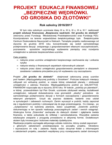 PROJEKT EDUKACJI FINANSOWEJ „BEZPIECZNE WĘDRÓWKI. OD GROSIKA DO ZŁOTÓWKI” Rok szkolny 2016/2017 W tym roku szkolnym uczniowie klasy III a, III b, III c, III e, III f realizowali projekt edukacji finansowej „Bezpieczne wędrówki. Od grosika do złotówki" utworzony przez Fundację Młodzieżowej Przedsiębiorczości oraz Fundację PZU. Koordynatorem na terenie województwa świętokrzyskiego było Świętokrzyskie Centrum Doskonalenia Nauczycieli w Kielcach. Tematyka projektu realizowanego od stycznia do grudnia 2016 roku koncentrowała się wokół samodzielnego podejmowania decyzji związanego z gospodarowaniem własnymi oszczędnościami, poznawania sposobów racjonalnego wydawania pieniędzy oraz rozwijania umiejętności w zakresie bezpieczeństwa uczniów. Cele projektu: • nabycie przez uczniów umiejętności bezpiecznego zachowania się i unikania ryzyka • nabycie wiedzy o finansowych aspektach różnorodnych zdarzeń • nabycie przez dzieci umiejętności gospodarowania pieniędzmi w obszarach zarabiania i ustalania priorytetów przy ich wydawaniu czy oszczędzaniu Projekt „Od grosika do złotówki” obejmował całoroczną pracę uczniów pod hasłem „Międzygalaktycznej podróży z Grosikiem”. Podczas kolejnych miesięcy odbywali oni wirtualną podróż, w czasie której odwiedzali planety i zdobywali umiejętności z zakresu finansów. Międzygalaktyczna podróż po GALAKTYCE FINANSÓW rozpoczęła się w styczniu 2016 roku. W trakcie ,,podróży po planetach”, w której przewodnikiem był Pan Grosik, uczniowie zdobywali wiedzę, kształtowali umiejętności, nabywali doświadczenia oraz gromadzili ,,skarby” potrzebne do samodzielnego podejmowania decyzji o formach oszczędzania i gospodarowania własnymi pieniędzmi. Uczyli się poprzez działanie, badanie oraz udział w symulacjach i zabawach ruchowych. Zanim wyruszyli w podróż, każdy zapoznał się z regulaminem podróży i zobowiązał się do jego przestrzegania. Co miesiąc, po ,,wylądowaniu” na wybranej planecie, dzieci uzupełniały ,,Dzienniki podróży” dokumentując w ten sposób realizację poszczególnych zadań i swoich osiągnięć. Atrakcyjna forma „Dziennika” zachęcała do dalszych działań i zgłębiania świata finansów, a także pobudzała do refleksji i samokształcenia. Wszystkie zadania edukacyjne związane z przygodą prowadzono w aktywnej formie. Dodatkowym atutem były innowacyjne i kolorowe materiały dydaktyczne. Realizacja projektu wymagała aktywnego udziału rodziców, którzy zostali zapoznani z głównymi założeniami przedsięwzięcia na początku projektu. Określono i wyznaczono im rolę i zadania. Każdy rodzic otrzymał folder z informacjami o założeniach projektu, zasadach współpracy przy rozwiązywaniu zadań domowych ucznia oraz o sponsorach i organizatorach. Domowe zadania uczniowie wykonywali wspólnie z rodzicami, prezentując naklejki z napisem "POROZMAWIAJ ZE MNĄ O ...". Było to zaproszenie do wspólnej rozmowy na temat wdrażanych w danym dniu treści. W trakcie podróży był też czas, w którym rodzice pełnili rolę konsultantów i w ciągu 14 dni dokonywali analizy, w jakiej dziedzinie ich dziecko oszczędza najlepiej. Wnioski z tych obserwacji stanowiły bazę do dalszej pracy nauczyciela i uczniów. Projekt stanowił uzupełnienie i urozmaicenie podstawy programowej. Kształtując umiejętność racjonalnego gospodarowania zasobami pieniężnymi, inspirował uczniów do realizowania własnych pomysłów, rozbudzał ich ciekawość poznawczą, motywował do dalszej edukacji oraz uczył szacunku dla pracy. Zachęcał rodziców do aktywnego uczestnictwa w edukacji dziecka, oferując propozycje różnorodnych form pracy z nim. Nauczyciel, uczniowie oraz ich rodzice pozytywnie ocenili realizację projektu. Wychowawcy realizujący projekt: II a – Dorota Chromik II b – Beata Skuta II c – Beata Banak II e – Izabela Romain-Robaczewska II f – Joanna Nowosielska