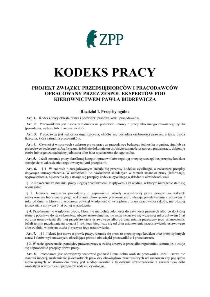 KODEKS PRACY PROJEKT ZWIĄZKU PRZEDSIĘBIORCÓW I PRACODAWCÓW OPRACOWANY PRZEZ ZESPÓŁ EKSPERTÓW POD KIEROWNICTWEM PAWŁA BUDREWICZA Rozdział I. Przepisy ogólne Art. 1. Kodeks pracy określa prawa i obowiązki pracowników i pracodawców. Art. 2. Pracownikiem jest osoba zatrudniona na podstawie umowy o pracę albo innego zrównanego tytułu (powołania, wyboru lub mianowania itp.). Art. 3. Pracodawcą jest jednostka organizacyjna, choćby nie posiadała osobowości prawnej, a takŜe osoba fizyczna, która zatrudnia pracowników. Art. 4. Czynności w sprawach z zakresu prawa pracy za pracodawcę będącego jednostką organizacyjną lub za pracodawcę będącego osobą fizyczną, jeŜeli nie dokonuje on osobiście czynności z zakresu prawa pracy, dokonuje osoba lub organ zarządzający jednostką albo inna wyznaczona do tego osoba. Art. 5. JeŜeli stosunek pracy określonej kategorii pracowników regulują przepisy szczególne, przepisy kodeksu stosuje się w zakresie nie uregulowanym tymi przepisami. Art. 6. § 1. W zakresie nieuregulowanym stosuje się przepisy kodeksu cywilnego, a zwłaszcza przepisy dotyczące umowy zlecenia. W odniesieniu do oświadczeń składanych w ramach stosunku pracy (informacje, wypowiedzenia, ogłoszenia itp.) stosuje się przepisy kodeksu cywilnego o składaniu oświadczeń woli. § 2. Roszczenia ze stosunku pracy ulegają przedawnieniu z upływem 3 lat od dnia, w którym roszczenie stało się wymagalne. § 3. JednakŜe roszczenia pracodawcy o naprawienie szkody wyrządzonej przez pracownika wskutek niewykonania lub nienaleŜytego wykonania obowiązków pracowniczych, ulegają przedawnieniu z upływem 1 roku od dnia, w którym pracodawca powziął wiadomość o wyrządzeniu przez pracownika szkody, nie później jednak niŜ z upływem 3 lat od jej wyrządzenia. § 4. Przedawnienie względem osoby, która nie ma pełnej zdolności do czynności prawnych albo co do której istnieje podstawa do jej całkowitego ubezwłasnowolnienia, nie moŜe skończyć się wcześniej niŜ z upływem 2 lat od dnia ustanowienia dla niej przedstawiciela ustawowego albo od dnia ustania przyczyny jego ustanowienia. JeŜeli termin przedawnienia wynosi 1 rok, jego bieg liczy się od dnia ustanowienia przedstawiciela ustawowego albo od dnia, w którym ustała przyczyna jego ustanowienia. Art. 7. § 1. Ilekroć jest mowa o prawie pracy, rozumie się przez to przepisy tego kodeksu oraz przepisy innych ustaw i aktów wykonawczych, określające prawa i obowiązki pracowników i pracodawców. § 2. W razie sprzeczności pomiędzy prawem pracy a treścią umowy o pracę albo regulaminu, statutu itp. stosuje się odpowiednie przepisy prawa pracy. Art. 8. Pracodawca jest obowiązany szanować godność i inne dobra osobiste pracownika. JeŜeli ustawa nie stanowi inaczej, uzaleŜnianie jakichkolwiek praw czy obowiązków pracowniczych od zachowań czy poglądów niezwiązanych ze stosunkiem pracy jest niedopuszczalne i traktowane równoznacznie z naruszeniem dóbr osobistych w rozumieniu przepisów kodeksu cywilnego. Art. 9. Pracownik ma prawo do wypoczynku w ramach urlopu wypoczynkowego. Art. 10. § 1. Pracodawca jest zobowiązany zapewnić pracownikom bezpieczne i higieniczne warunki pracy, w związku z czym jest zobowiązany zaznajamiać pracowników z zasadami bezpieczeństwa i higieny pracy dotyczącymi wykonywanej przez nich pracy. JeŜeli praca wiąŜe się ze szczególnym zagroŜeniem, pracodawca zobowiązany jest przedstawić pracownikowi na piśmie informację na ten temat. § 2. Pracodawca jest obowiązany dostarczyć pracownikowi nieodpłatnie środki ochrony indywidualnej zabezpieczające przed działaniem niebezpiecznych i szkodliwych dla zdrowia czynników występujących w środowisku pracy oraz informować go o sposobach posługiwania się tymi środkami. § 3. Pracodawca jest obowiązany zapewnić, aby stosowane środki ochrony indywidualnej oraz odzieŜ i obuwie robocze, posiadały odpowiednie właściwości ochronne i uŜytkowe, oraz zapewnić ich pranie, konserwację, naprawę, odpylanie, odkaŜanie itd. Rozdział II. Stosunek pracy Art. 11. § 1. Przez nawiązanie stosunku pracy pracownik zobowiązuje się do wykonywania pracy określonego rodzaju na rzecz pracodawcy i pod jego kierownictwem oraz w umówionym miejscu i czasie, a pracodawca – do zatrudniania pracownika za wynagrodzeniem. § 2. Pracownikiem moŜe być osoba, która ukończyła 15 lat. Nawiązanie, zmiana i rozwiązanie stosunku pracy przez osobę ograniczoną w zdolności do czynności prawnych nie wymaga zgody przedstawiciela ustawowego. JednakŜe gdy stosunek pracy sprzeciwia się dobru tej osoby, przedstawiciel ustawowy moŜe stosunek pracy rozwiązać. W przypadku nieuzasadnionego rozwiązania stosunku pracy przedstawiciel ustawowy jest zobowiązany pokryć pracodawcy wyrządzoną w ten sposób szkodę. § 3. Pracodawca moŜe stosować regulaminy pracy poprzez podanie ich do powszechnej wiadomości na terenie przedsiębiorstwa albo w inny sposób umoŜliwiający pracownikom zapoznanie się z ich treścią. Art. 12. § 1. Pracodawca ma prawo Ŝądać od osoby ubiegającej się o zatrudnienie podania danych osobowych obejmujących: imię (imiona) i nazwisko, imiona rodziców, datę urodzenia, miejsce zamieszkania (adres korespondencyjny), wykształcenie, przebieg dotychczasowego zatrudnienia. § 2. Pracodawca ma prawo Ŝądać udokumentowania powyŜszych danych osobowych. § 3. Pracodawca moŜe Ŝądać podania innych danych osobowych, jeŜeli obowiązek ich uzyskania wynika z odrębnych przepisów. Art. 13. § 1. W razie przejęcia całości lub części przedsiębiorstwa pracodawcy przez innego pracodawcę nowy pracodawca staje się z mocy prawa stroną w dotychczasowych stosunkach pracy. O przejęciu przedsiębiorstwa nowy pracodawca jest zobowiązany poinformować pracowników w sposób zwyczajowo przyjęty u danego pracodawcy. § 2. Za zobowiązania wynikające ze stosunku pracy powstałe p