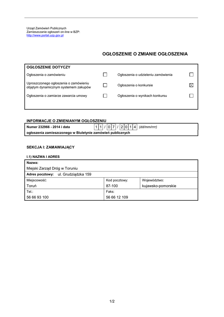 Urząd Zamówień Publicznych Zamieszczanie ogłoszeń on-line w BZP: http://www.portal.uzp.gov.pl OGŁOSZENIE O ZMIANIE OGŁOSZENIA OGŁOSZENIE DOTYCZY Ogłoszenia o zamówieniu Ogłoszenia o udzieleniu zamówienia Uproszczonego ogłoszenia o zamówieniu objętym dynamicznym systemem zakupów Ogłoszenia o konkursie Ogłoszenia o zamiarze zawarcia umowy Ogłoszenia o wynikach konkursu INFORMACJE O ZMIENIANYM OGŁOSZENIU Numer 232966 - 2014 i data 1 1 / 0 7 / 2 0 1 4 (dd/mm/rrrr) ogłoszenia zamieszczonego w Biuletynie zamówień publicznych SEKCJA I: ZAMAWIAJĄCY I.1) NAZWA I ADRES Nazwa: Miejski Zarząd Dróg w Toruniu Adres pocztowy: ul. Grudziądzka 159 Miejscowość: Kod pocztowy: Województwo: Toruń 87-100 kujawsko-pomorskie Tel.: Faks: 56 66 93 100 56 66 12 109 1/2 SEKCJA II: ZMIANY W OGŁOSZENIU II.1) Tekst, który należy zmienić (jeżeli dotyczy): Miejsce, w którym znajduje się zmieniany tekst (podać nr sekcji i pkt): Sekcja III pkt 1.1. W ogłoszeniu jest: W ogłoszeniu powinno być: 1.1. posiadają wiedzę i doświadczenie wyrażającą się w tym, że: w okresie ostatnich trzech latach przed upływem terminu składania ofert, a jeżeli okres prowadzenia działalności jest krótszy – w tym okresie, wykonał (zakończył) w sposób należyty oraz zgodnie z zasadami sztuki technicznej: a) jedno zamówienie polegające na sporządzeniu Koncepcji Systemu Zarządzania Ruchem Drogowym, która obejmowała i integrowała w ramach Centrum Zarządzania Ruchem Drogowym co najmniej następujące elementy podsystemów technologii ITS i ich funkcjonalności łącznie: Elementy Systemu Sterowania Ruchem monitorującego zmienne warunki ruchu i posiadającego funkcje optymalizacji dla minimum 35/trzydziestu pięciu skrzyżowań z sygnalizacją świetlną, Elementy Systemu Informacji dla kierowców wykorzystującego elektroniczne tablice o zmiennej treści pozwalające na jednoczesną prezentacje zmiennych treści tekstowych i znaków drogowych z podłączeniem minimum 4/czterech tego rodzaju elektronicznych tablic, Elementy Systemu Analiz Ruchu wykorzystującego metody wideo, w tym Monitoringu Wizyjnego CCTV, 1.1. posiadają wiedzę i doświadczenie wyrażającą się w tym, że: w okresie ostatnich trzech lat przed upływem terminu składania ofert, a jeżeli okres prowadzenia działalności jest krótszy – w tym okresie, wykonał (zakończył) w sposób należyty oraz zgodnie z zasadami sztuki technicznej: a) jedno zamówienie polegające na sporządzeniu Koncepcji lub Projektu Systemu Sterowania lub Zarządzania Ruchem Drogowym, która obejmowała i integrowała w ramach Centrum Zarządzania Ruchem Drogowym co najmniej następujące elementy podsystemów technologii ITS i ich funkcjonalności łącznie: Elementy Systemu Sterowania lub Zarządzania Ruchem monitorującego zmienne warunki ruchu i posiadającego funkcje optymalizacji dla minimum 35/trzydziestu pięciu skrzyżowań z sygnalizacją świetlną, Elementy Systemu Informacji dla kierowców wykorzystującego elektroniczne tablice o zmiennej treści pozwalające na jednoczesną prezentacje zmiennych treści tekstowych i znaków drogowych z podłączeniem minimum 4/czterech tego rodzaju elektronicznych tablic, Elementy Systemu Analiz Ruchu wykorzystującego metody wideo, w tym Monitoringu Wizyjnego CCTV, automatycznego rozpoznawania tablic rejestracyjnych, automatycznej detekcji zdarzeń w ruchu drogowym z podłączeniem minimum 25/dwudziestu pięciu kamer zlokalizowanych w ramach pasa ruchu drogowego oraz obszarze skrzyżowań z sygnalizacją świetlną, Elementy Systemu Informacji Mobilnych wykorzystującego Internetowy Portal WWW zawierający 2/2 automatycznego rozpoznawania tablic rejestracyjnych, automatycznej detekcji zdarzeń w ruchu drogowym z podłączeniem minimum 25/dwudziestu pięciu kamer zlokalizowanych w ramach pasa ruchu drogowego oraz obszarze skrzyżowań z sygnalizacją świetlną, Elementy Systemu Informacji Mobilnych wykorzystującego Internetowy Portal WWW zawierający przynajmniej informacje o aktualnych warunkach ruchu w sieci ulicznej z możliwością prezentacji prognoz zmienności stanów ruchu w ramach modelu sieci drogowej, działający w oparciu o cyfrowe mapy, jak również zawierający wizualizację informacji w ramach Internetowego Portalu przekazywanych w czasie zbliżonym do rzeczywistego, typu on-line równolegle do tych prezentowanych na urządzeniach zlokalizowanych w ramach pasa ruchu drogowego jak np.: informacji o warunkach ruchu prezentowanych na elektronicznych tablicach o zmiennej treści/znakach VMS oraz obrazu z kamer w tym z monitoringu wizyjnego CCTV; b) jedno zamówienie polegające na wykonaniu Koncepcji Systemu Sterowania Ruchem Drogowym z funkcjami optymalizacji sterowania w sieci ulicznej, koordynacji oraz priorytetyzacji dla pojazdów komunikacji publicznej o funkcjonalności pozwalającej na realizację bezpośrednich zgłoszeń od pojazdów, na bazie dedykowanej łączności radiowej dla żądań priorytetu pomiędzy pojazdami a sterownikami sygnalizacji świetlnej; c) jedno zamówienie 3/2 przynajmniej informacje o aktualnych warunkach ruchu w sieci ulicznej z możliwością prezentacji prognoz zmienności stanów ruchu w ramach modelu sieci drogowej, działający w oparciu o cyfrowe mapy, jak również zawierający wizualizację informacji w ramach Internetowego Portalu przekazywanych w czasie zbliżonym do rzeczywistego, typu on-line równolegle do tych prezentowanych na urządzeniach zlokalizowanych w ramach pasa ruchu drogowego jak np.: informacji o warunkach ruchu prezentowanych na elektronicznych tablicach o zmiennej treści/znakach VMS oraz obrazu z kamer w tym z monitoringu wizyjnego CCTV; b) jedno zamówienie polegające na wykonaniu Koncepcji lub Projektu Systemu Sterowania lub Zarządzania Ruchem Drogowym z funkcjami optymalizacji sterowania w sieci ulicznej, koordynacji oraz priorytetyzacji dla pojazdów komunikacji publicznej o funkcjonalności pozwalające
