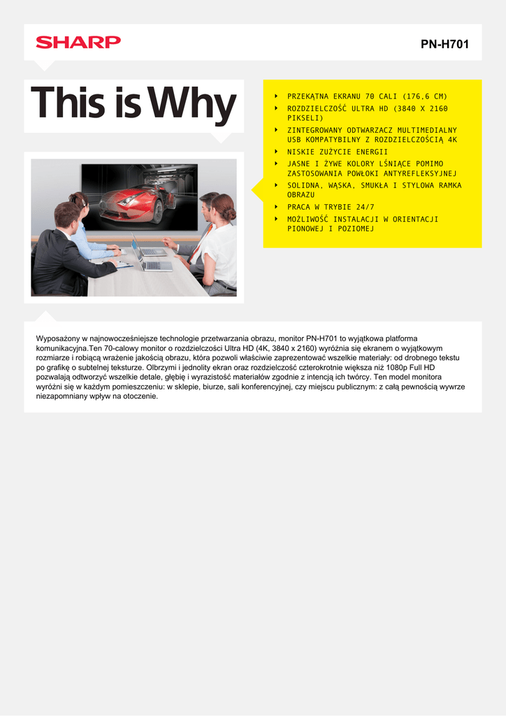 PN-H701 PRZEKĄTNA EKRANU 70 CALI (176,6 CM) ROZDZIELCZOŚĆ ULTRA HD (3840 X 2160 PIKSELI) ZINTEGROWANY ODTWARZACZ MULTIMEDIALNY USB KOMPATYBILNY Z ROZDZIELCZOŚCIĄ 4K NISKIE ZUŻYCIE ENERGII JASNE I ŻYWE KOLORY LŚNIĄCE POMIMO ZASTOSOWANIA POWŁOKI ANTYREFLEKSYJNEJ SOLIDNA, WĄSKA, SMUKŁA I STYLOWA RAMKA OBRAZU PRACA W TRYBIE 24/7 MOŻLIWOŚĆ INSTALACJI W ORIENTACJI PIONOWEJ I POZIOMEJ Wyposażony w najnowocześniejsze technologie przetwarzania obrazu, monitor PN-H701 to wyjątkowa platforma komunikacyjna.Ten 70-calowy monitor o rozdzielczości Ultra HD (4K, 3840 x 2160) wyróżnia się ekranem o wyjątkowym rozmiarze i robiącą wrażenie jakością obrazu, która pozwoli właściwie zaprezentować wszelkie materiały: od drobnego tekstu po grafikę o subtelnej teksturze. Olbrzymi i jednolity ekran oraz rozdzielczość czterokrotnie większa niż 1080p Full HD pozwalają odtworzyć wszelkie detale, głębię i wyrazistość materiałów zgodnie z intencją ich twórcy. Ten model monitora wyróżni się w każdym pomieszczeniu: w sklepie, biurze, sali konferencyjnej, czy miejscu publicznym: z całą pewnością wywrze niezapomniany wpływ na otoczenie. DANE MODUŁU WYŚWIETLAJĄCEGO Technologia panelu: UV2A Rozdzielczość znamionowa (piksele): 3840 x 2160 Przekątna (cale/cm): 70/176,6 Proporcje obrazu: 16:9 Technologia podświetlenia: W-LED/Edge Jasność (cd/m2): 400 Współczynnik kontrastu: 3000 : 1 Wyświetlane kolory: 16,77 mln. Czas odpowiedzi (szary-do-szarego, średni) ms: 6 Kąt obserwacji (w pionie/w poziomie) 0 CR >10: 176/176 ŹRÓDŁO ZASILANIA I ŚRODOWISKO PRACY Napięcie podczas pracy (V, prąd zmienny) / częstotliwość (Hz): 100-240/50-60 Pobór mocy (W) (maksymalne obciążenie): 240 Pobór mocy (W) (w trybie czuwania): 0,50 Temperatura podczas pracy (oC): 0 - 40 Wilgotność (%): 20 - 80RH Ilość odprowadzanego ciepła (BTU/h) - maksymalna: 819 INSTALACJA PODSTAWOWE DANE TECHNICZNE Certyfikat pracy w trybie 24/7: Wewnętrzne głośniki (W): 10W + 10W Zarządzanie zasilaniem: Kolor obudowy: Czarny MASY I WYMIARY Wymiary ramki (lewa/prawa) mm: 8,8/8,8 Wymiary ramki (góra/dół) mm: 8,5/13,3 Wymiary produktu (szer./wys./gł.) mm: 1559 x 894 x 69 Masa produktu bez podstawy (kg): 47 GNIAZDA WEJŚCIOWE (AUDIO/WIDEO) HDMI: 4 VGA: 1 3,5 mm jack audio: 1 GNIAZDA (STEROWANIE/DANE SZEREGOWE) Orientacja pozioma: Orientacja pionowa: System montażu (VESA/liczba punktów/rozstaw w mm): VESA/4/400 x 400 RS232C IN: 1 (interactive/via 3,5mm mini jack terminal (coverter cable included)) Port LAN: 1 USB: 1 GNIAZDA WYJŚCIOWE (AUDIO/WIDEO) 3,5 mm jack audio/słuchawkowe: 1 www.sharp.pl Powered by TCPDF (www.tcpdf.org) SHARP ELECTRONICS (EUROPE) GMBH SPółKA Z O. O. ODDZIAł W POLSCE UL. POLECZKI 33 BUDYNEK A2 02-822 WARSZAWA TEL.: +48 22 545 81 00 FAKS: +48 22 545 81 00 FAKS: +48 22 545 81 05 WWW.SHARP.PL